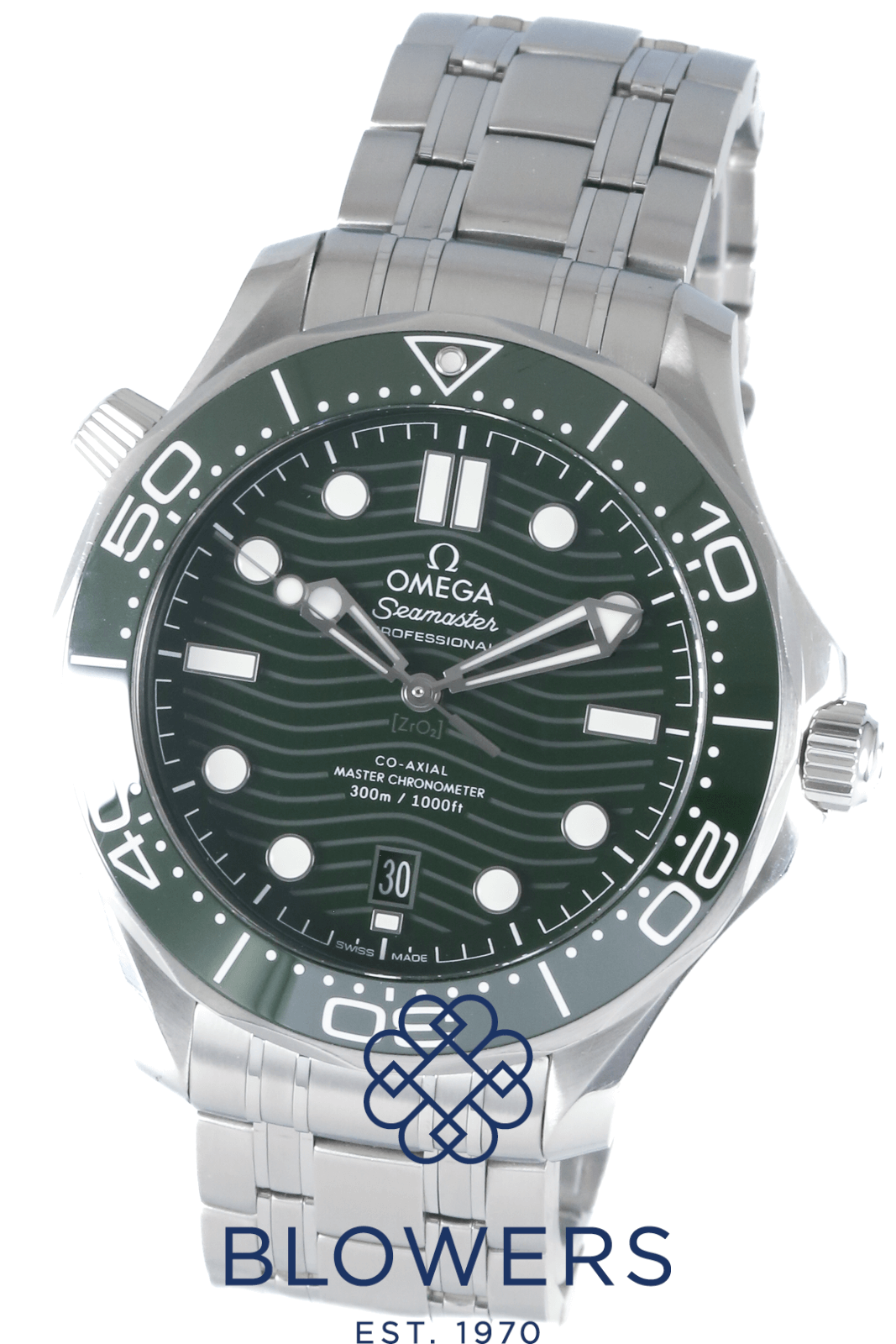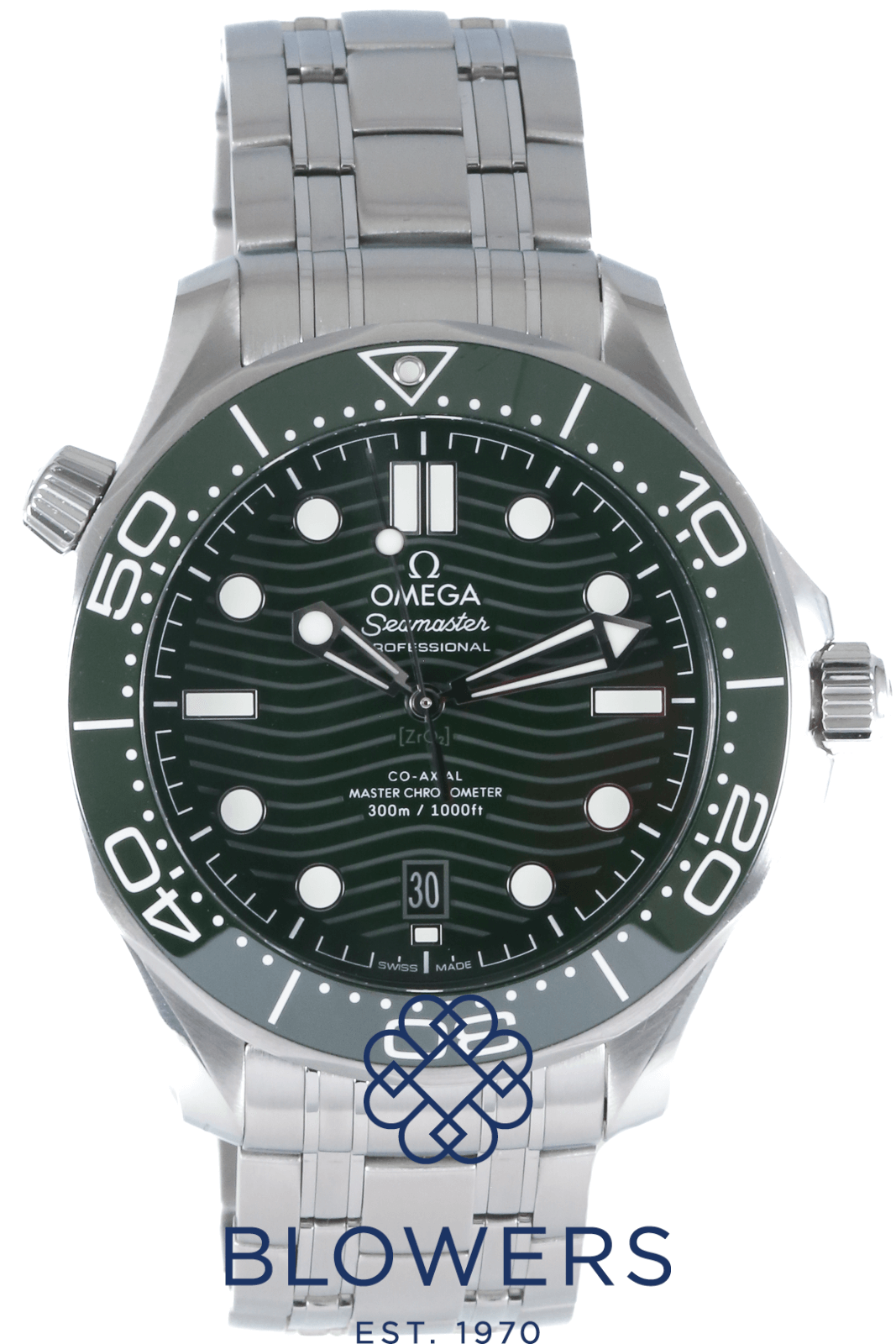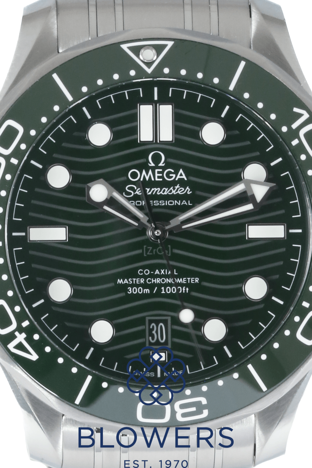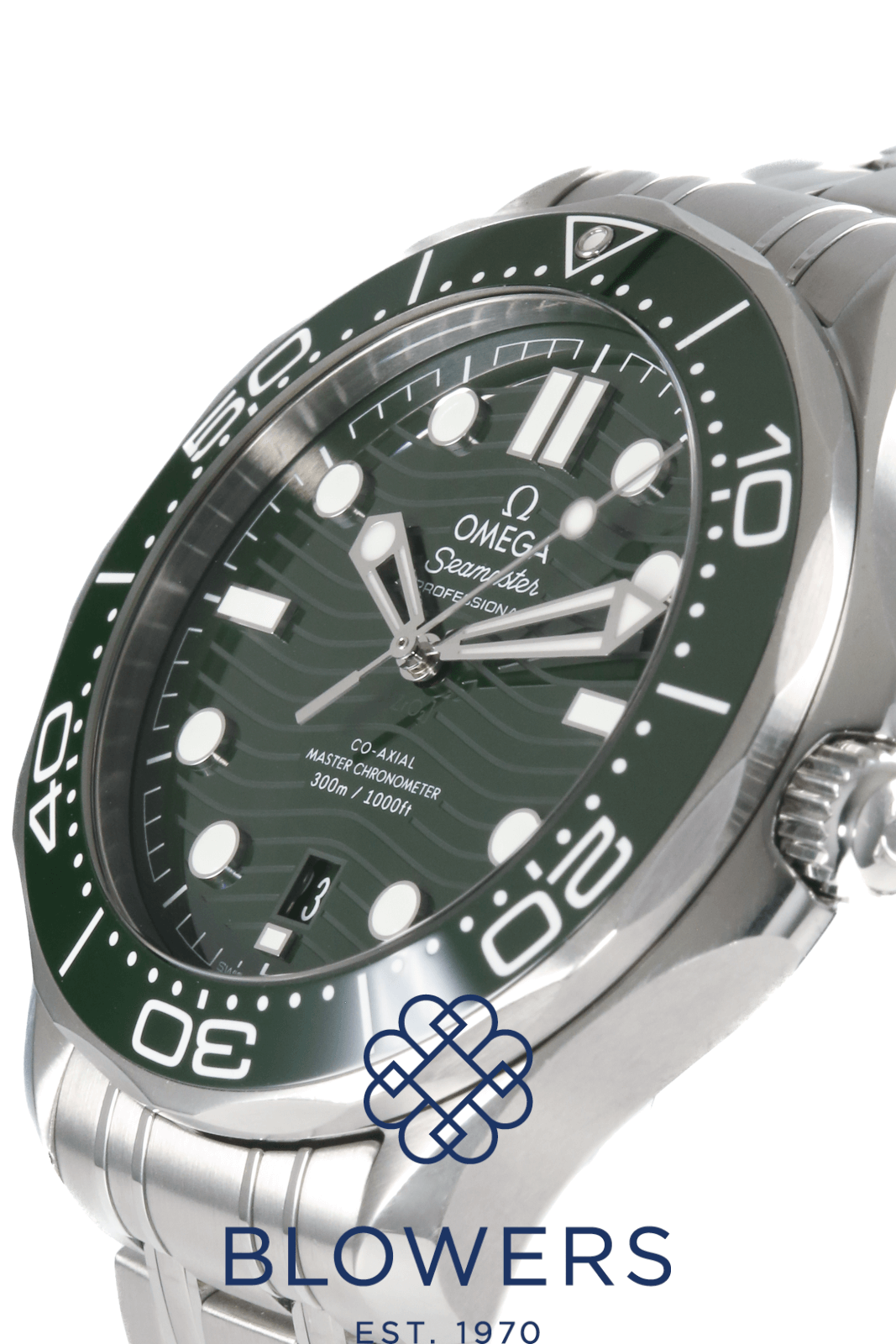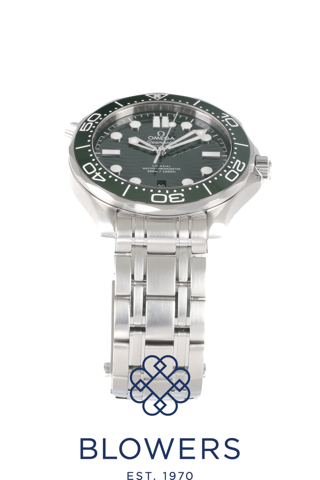 Omega Seamaster 300m 210.30.42.20.10.001. This 42 mm model is crafted from stainless steel With a green ceramic bezel with a white enamel diving scale. The dial is also polished green ceramic and features laser-engraved waves and a date window at 6 o’clock. The skeleton hands and raised indexes are rhodium-plated and are filled with white Super-LumiNova, while the helium escape valve has been given a conical design. This watch is driven by the OMEGA Master Chronometer Calibre 8800 movement, which can be seen through the sapphire-crystal case back. Steel bracelet with folding clasp. Box and Papers Dated June 2023.