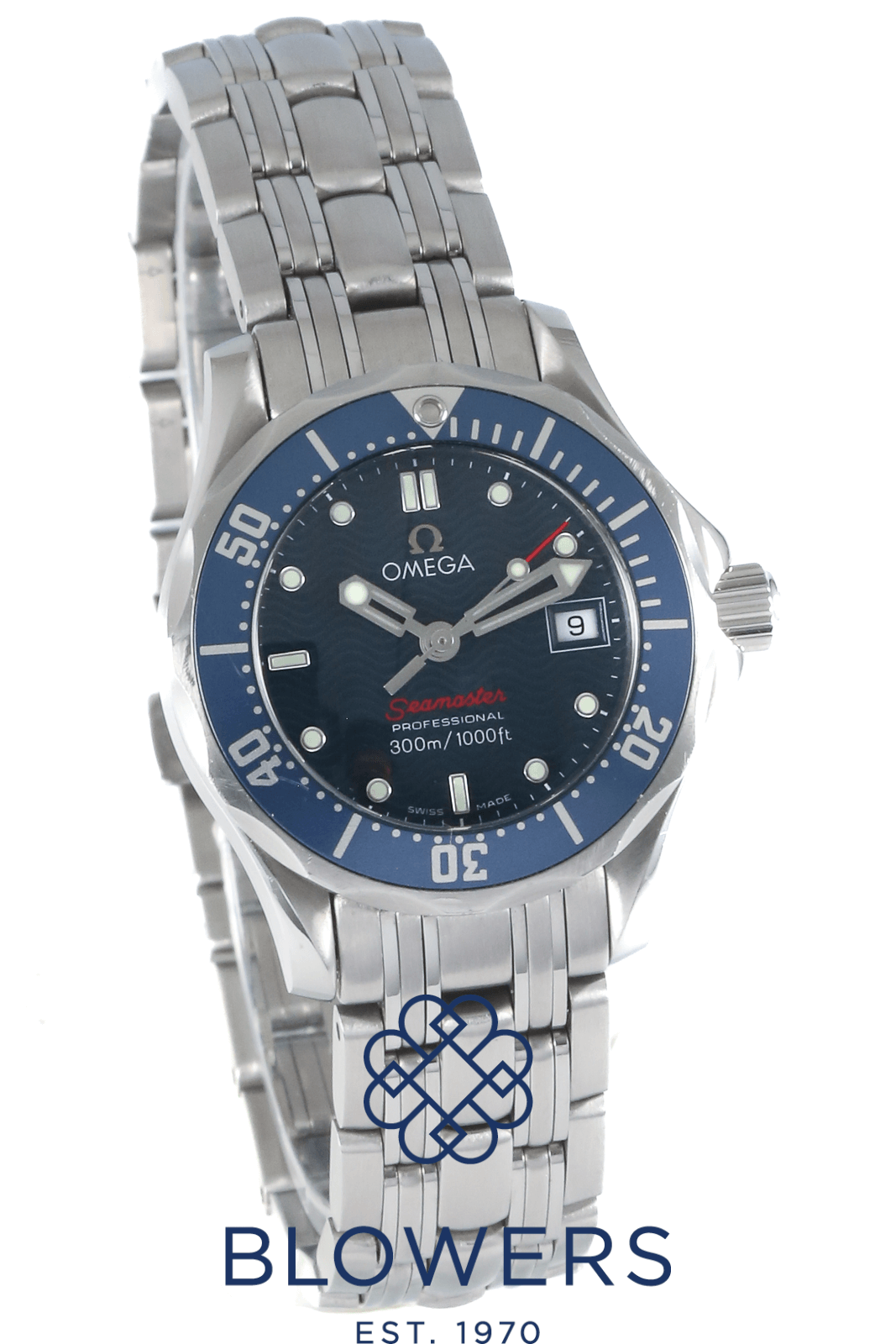 Omega Seamaster Diver 300M 2224.80.00 (Ref. 22248000). Stainless steel 28 mm diameter case with screw-down crown and unidirectional rotating bezel. Water resistant up to 300 metres (30 ATM). Quartz battery-operated calibre 1424 movement with hour, minute, central seconds and date functions, plus “End of Life” battery indicator. Blue ceramic (PVD-coated) bezel with 60-minute diving scale. Blue wave-pattern dial with dot hour markers, luminescent hands and markers, and a date window at the 3 o’clock position. Scratch-resistant sapphire crystal glass. Stainless steel bracelet with brushed and polished finish and deployment clasp. Box and papers dated July 2018.