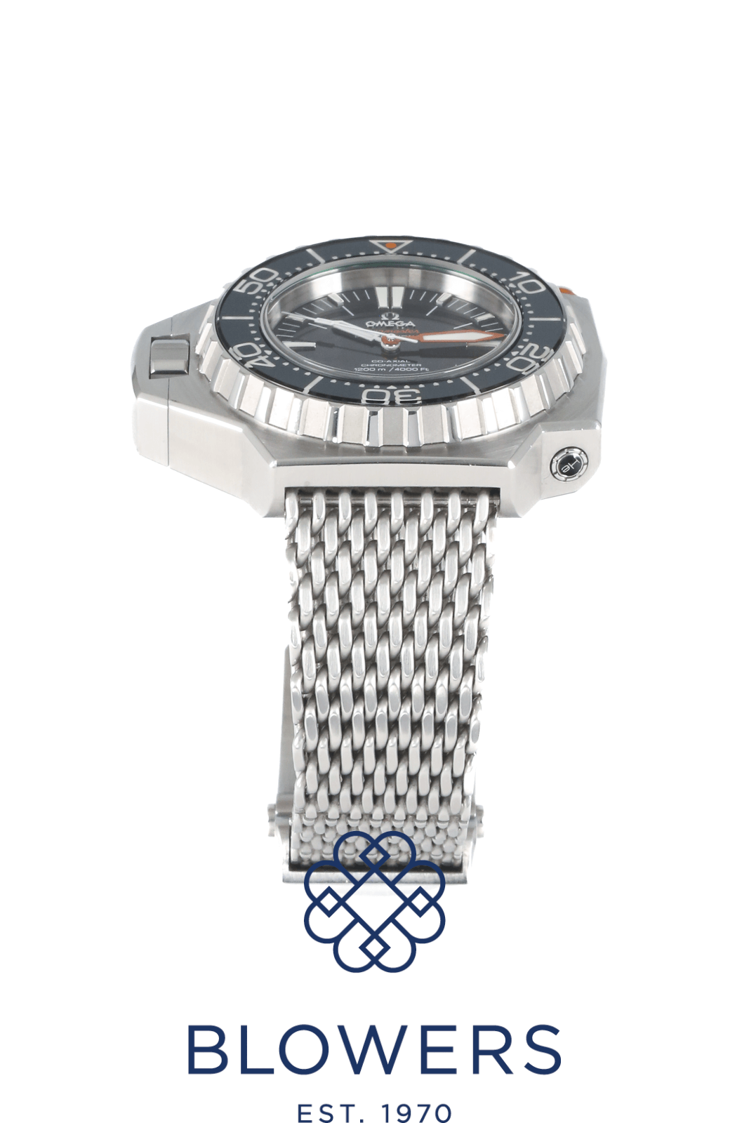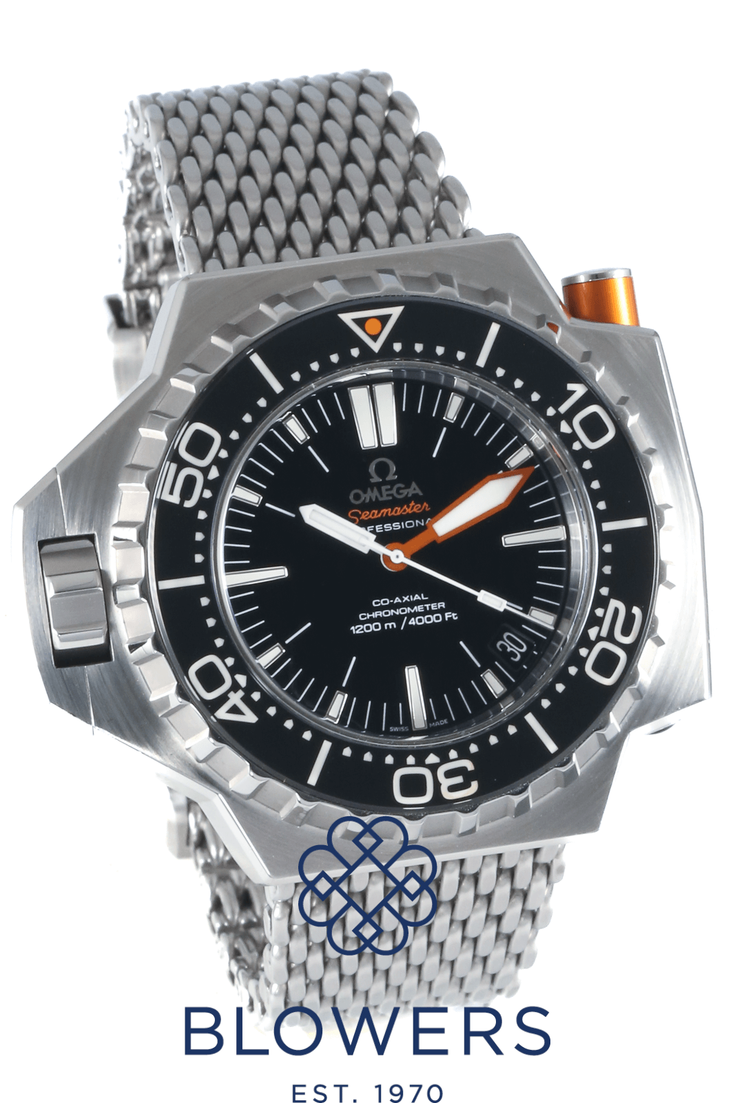 Omega Seamaster PloProf 224.30.55.21.01.001. Automatic movement. 55 x 48 mm case. Calibre 8500. Black dial with the date display between 4 o’clock and 5 o’clock position. Black bezel with its numerals and diving scale painted with white Super-Luminova inside the sapphire bezel ring. Luminous hands, Water resistant up to 1200 metres, Screw-in crown, Helium escape valve. On a ‘Sharkproof’ steel bracelet with a folding clasp. Also comes with an additional black Omega rubber strap. Box and Papers dated December 2015.
