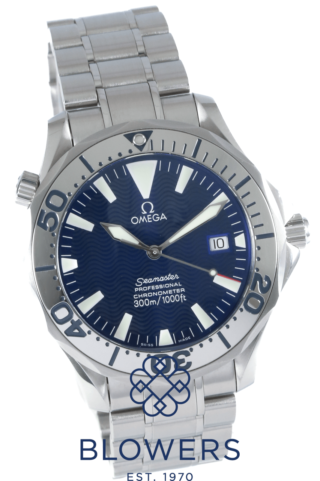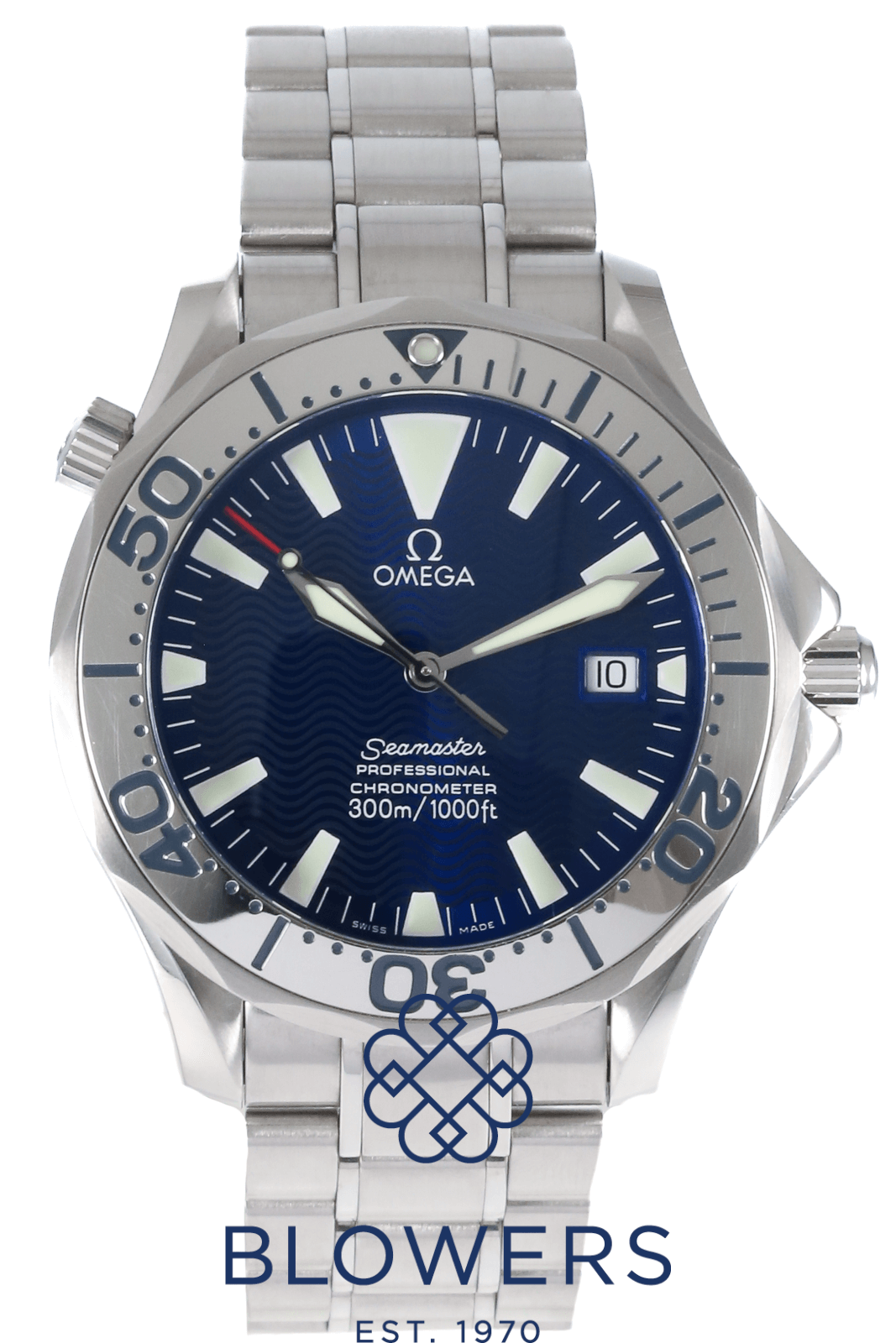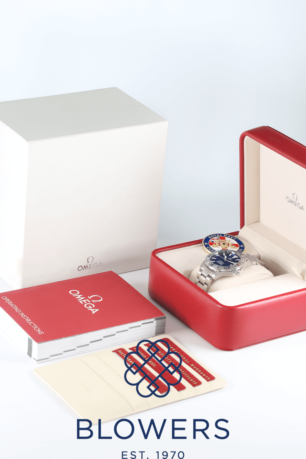 Omega Seamaster Professional Diver 300M Royal Navy Clearance Edition 2257.80.00. Limited edition of 150 pieces created exclusively for the Royal Navy Clearance Divers of the United Kingdom. Stainless steel 41mm diameter case with screw-down crown and helium escape valve at 10 o’clock. Water resistant up to 300 metres. Self-winding chronometer-certified Omega calibre 1120 movement with a 44-hour power reserve. Based on the Seamaster 2255.80.00, this special edition features a distinctive “electric” blue dial with applied luminous hour markers and skeletonised luminous hands. Uni-directional stainless steel diver’s bezel with engraved diving-style inlay. Central hours, minutes and seconds hands. Sapphire crystal glass with anti-reflective coating. Date window positioned at the 3 o’clock position. Sapphire crystal case back printed from the inside with the Royal Navy Clearance Diver (RNDB) logo. Stainless steel bracelet, folding clasp. Box and papers undated.