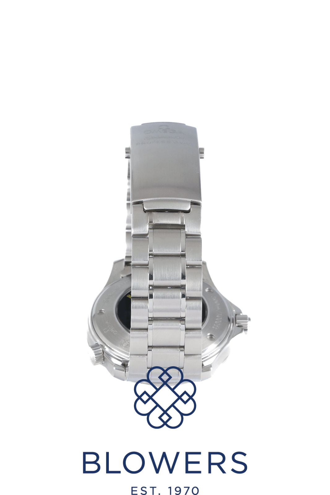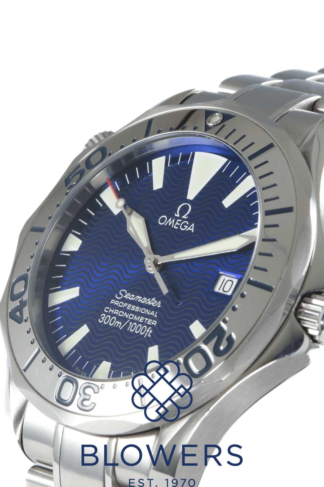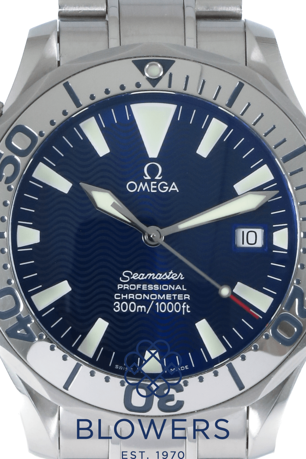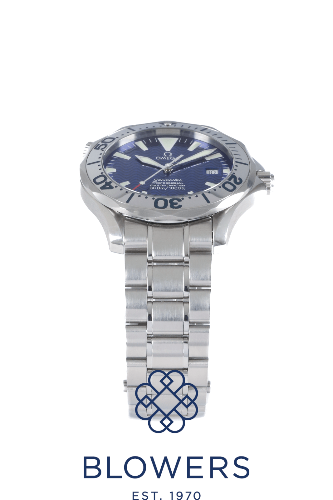 Omega Seamaster Professional Diver 300M Royal Navy Clearance Edition 2257.80.00. Limited edition of 150 pieces created exclusively for the Royal Navy Clearance Divers of the United Kingdom. Stainless steel 41mm diameter case with screw-down crown and helium escape valve at 10 o’clock. Water resistant up to 300 metres. Self-winding chronometer-certified Omega calibre 1120 movement with a 44-hour power reserve. Based on the Seamaster 2255.80.00, this special edition features a distinctive “electric” blue dial with applied luminous hour markers and skeletonised luminous hands. Uni-directional stainless steel diver’s bezel with engraved diving-style inlay. Central hours, minutes and seconds hands. Sapphire crystal glass with anti-reflective coating. Date window positioned at the 3 o’clock position. Sapphire crystal case back printed from the inside with the Royal Navy Clearance Diver (RNDB) logo. Stainless steel bracelet, folding clasp. Box and papers undated.
