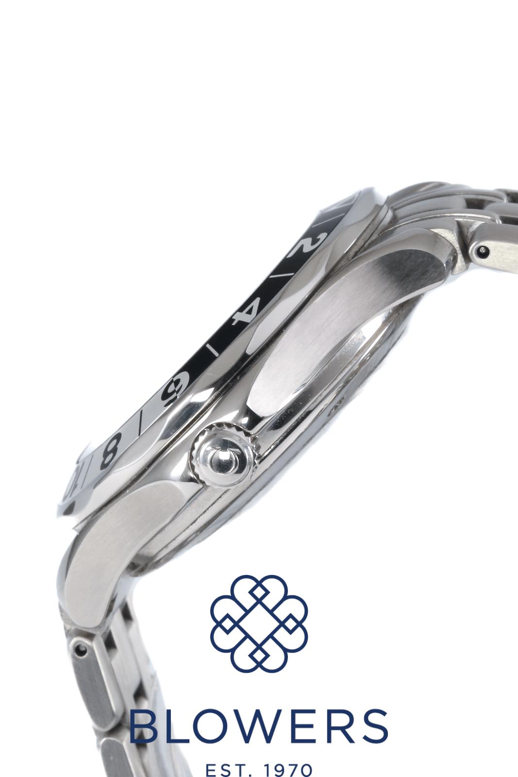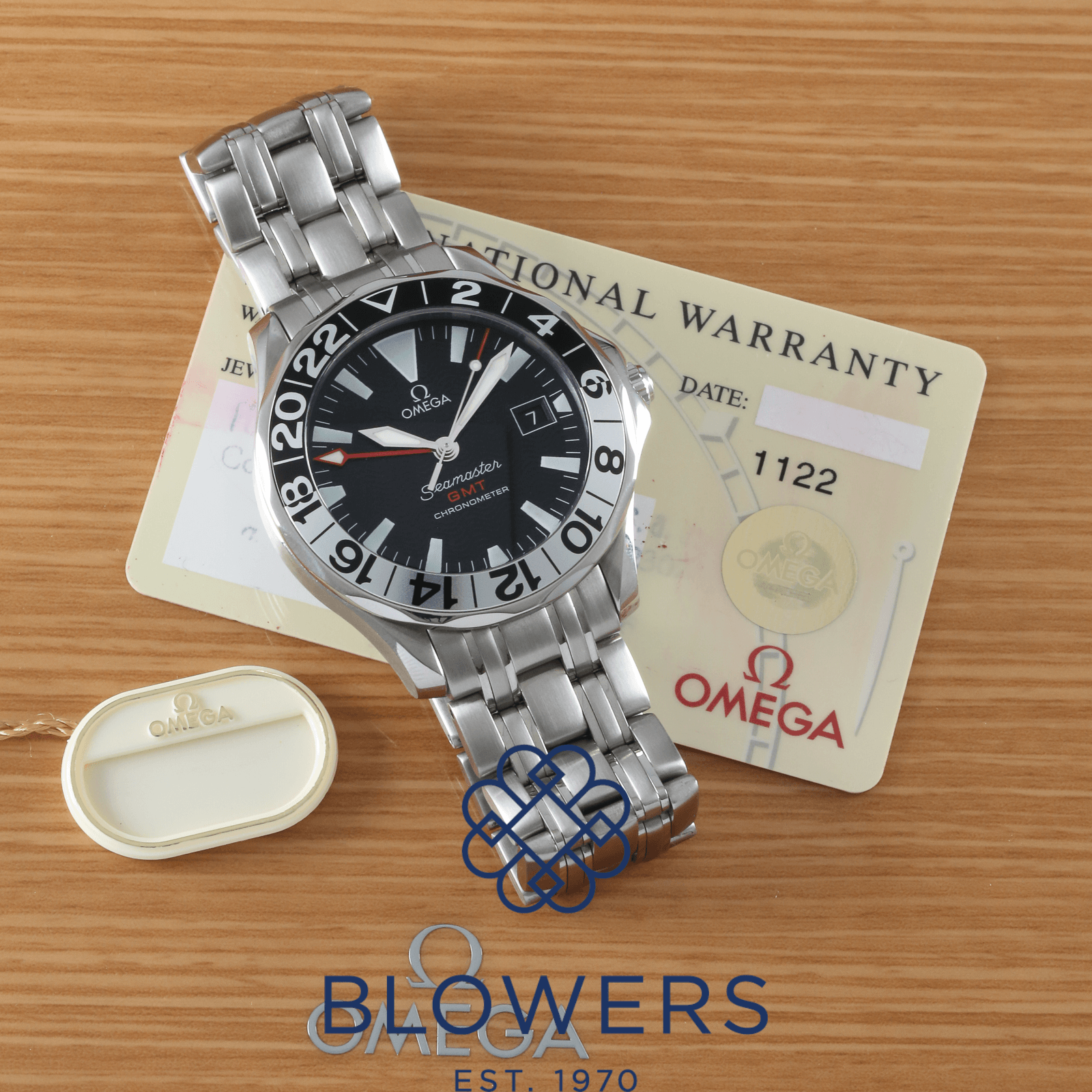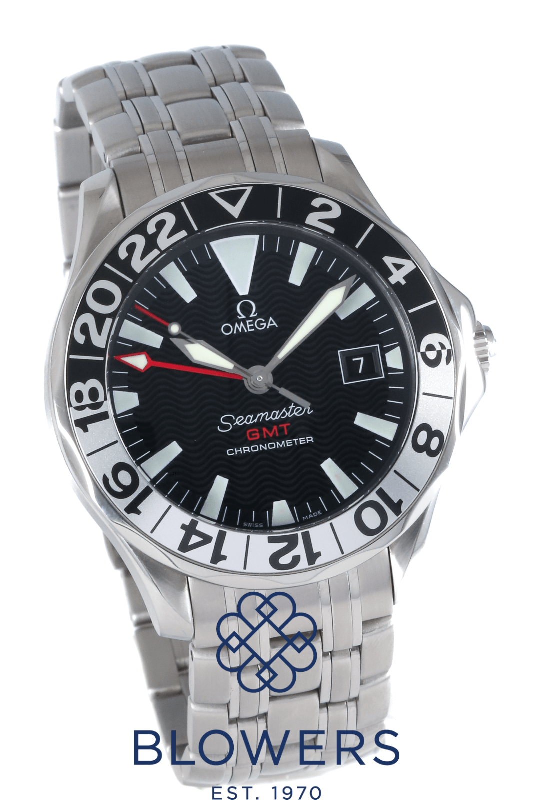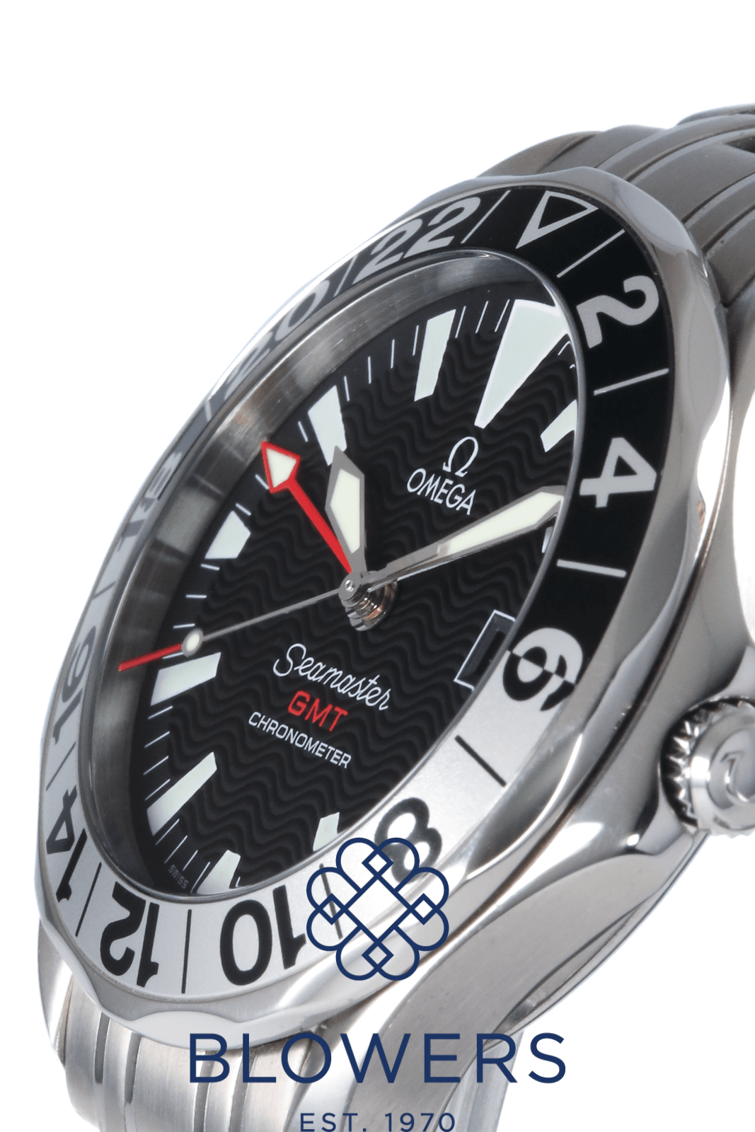 Omega Seamaster Professional GMT 50th Anniversary 2534.50.00. Stainless steel 41.5mm diameter case with screw-down crown and helium escape valve, water resistant up to 300 metres. Self-winding chronometer-certified Omega calibre 1128 GMT movement with independent 24-hour hand and a 44-hour power reserve. Uni-directional rotating bezel with black aluminium insert and 24-hour GMT scale. Black wave-pattern dial with luminescent hour markers and skeletonised hands. Central hours, minutes and seconds hands with red GMT hand for tracking a second time zone. Sapphire crystal glass with anti-reflective coating. Date window positioned at the 3 o’clock location. Stainless steel bracelet with folding clasp and diver’s extension. Box and papers dated 2003.