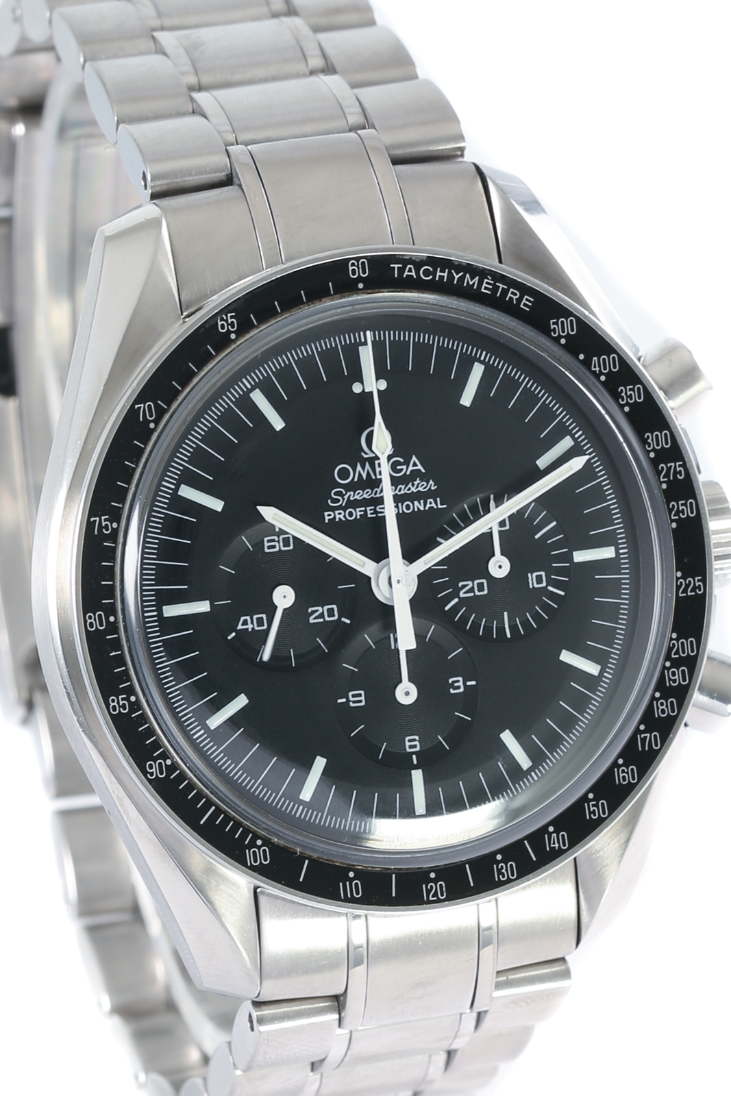 Omega Speedmaster Professional Moon Watch 3570.50.00. Mechanical hand wound 1861 chronograph movement. 48 powers reserve. Case diameter 42mm water resistant to 50 metres. Black dial covered by a Hesalite crystal and graced by a small seconds sub-dial, 30-minute recorder and 12-hour recorder along with a central chronograph hand. Black bezel with tachymetric scale. Steel bracelet with folding clasp. Box and paper dated July 2010. Omega Service Papers September 2023 providing a 24 month Warranty.