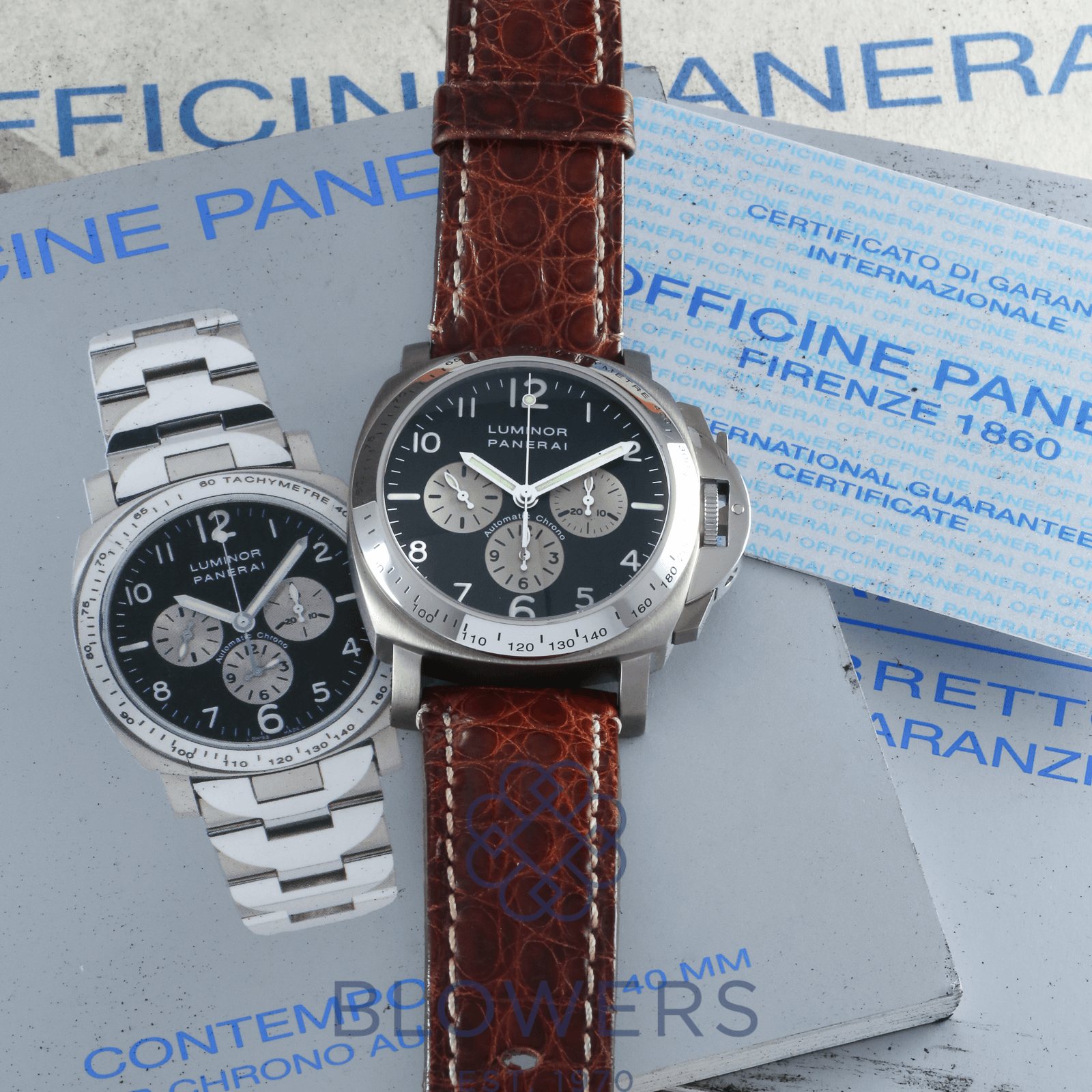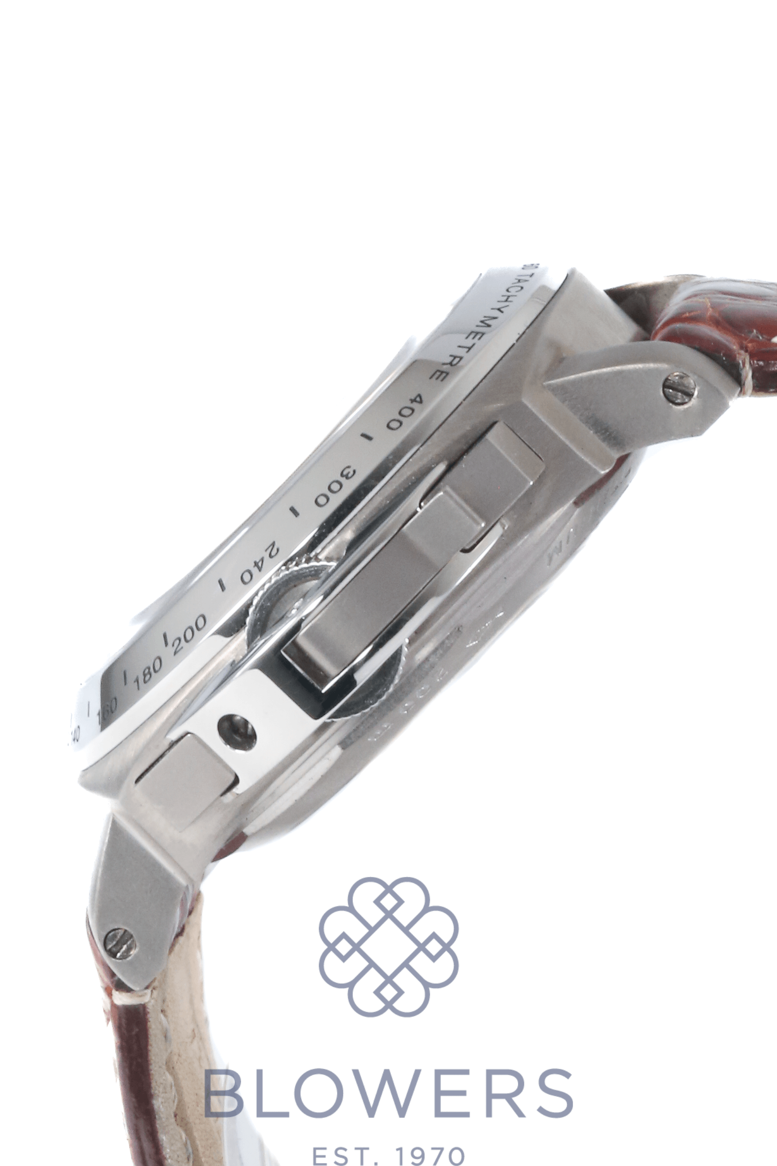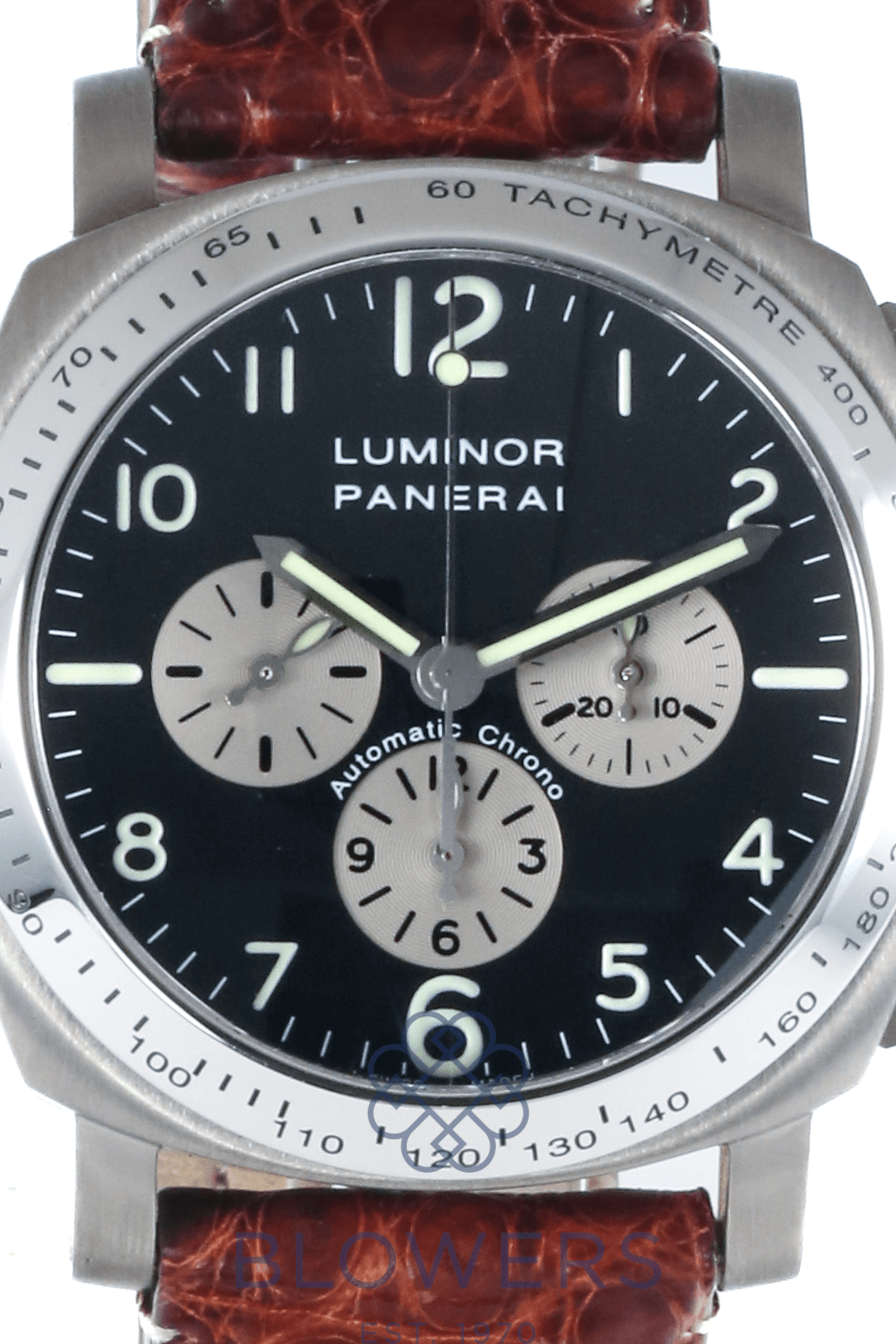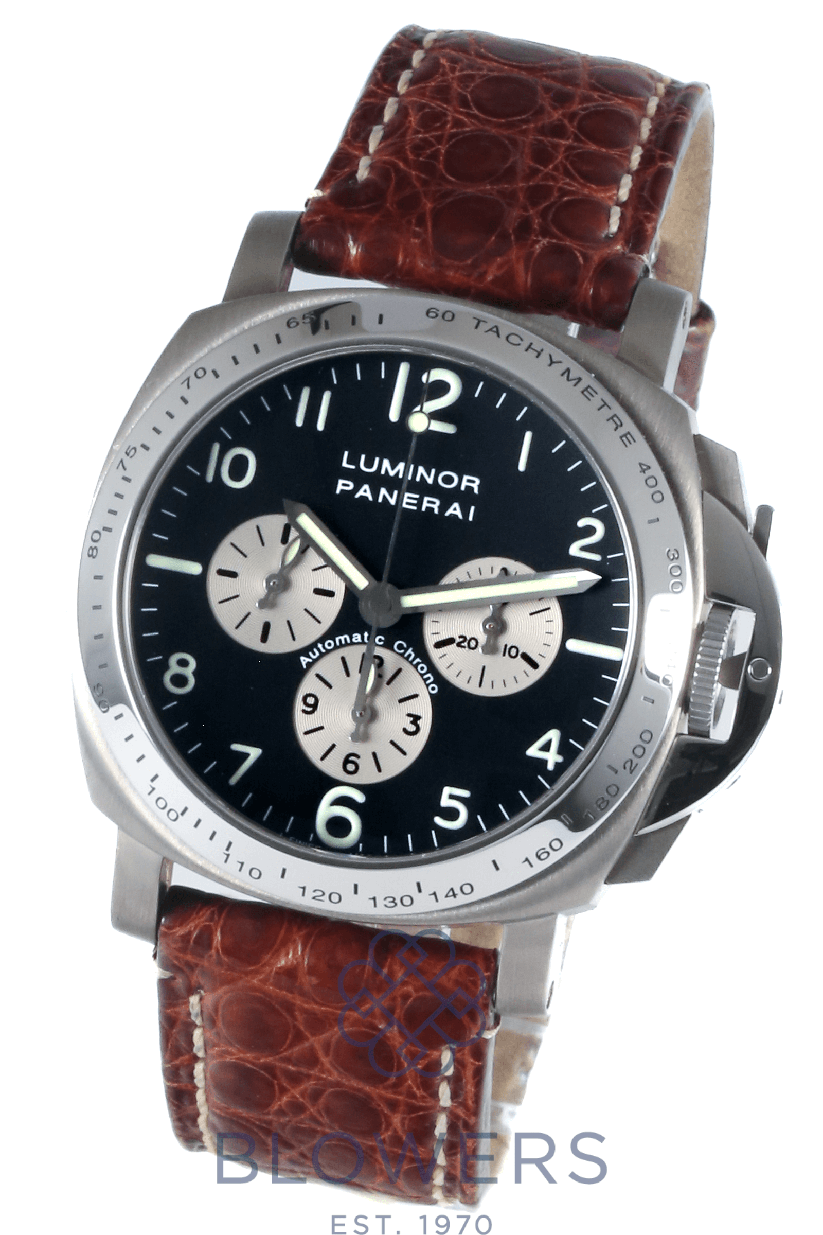 Panerai Luminor PAM00052. Automatic chronometer caliber chronograph movement. 44mm Titanium case diameter with a polished steel tachymetre bezel. Anti-reflective domed sapphire crystal glass. Black dial, silver sub-dials with luminescent Arabic numerals and baton markers. Power reserve of up to approx. 48 hours. Brown croc leather strap with a double folding clasp.