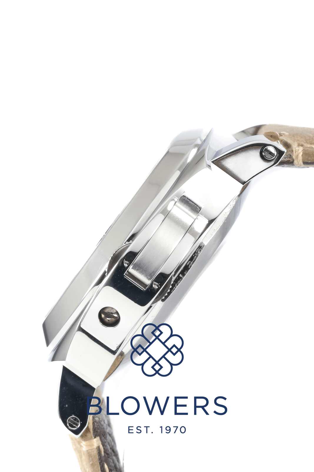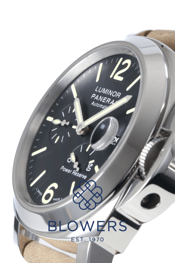 Panerai Luminor Power reserve PAM00090. Case Diameter 44mm. Water Resistant To 300 Meters. Automatic Movement. Black Sandwich Dial, Luminous Hour Markers And Numerals, Second Sweep Sub-Dial, Date Display, power reserve at 5 o’clock position that last up to 50 hours. Polished Steel Bezel, Case Brushed Steel. Comes with an additional black rubber strap. Beige Leather Strap with Steel Buckle. Box and papers June 2021.