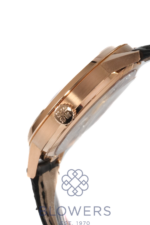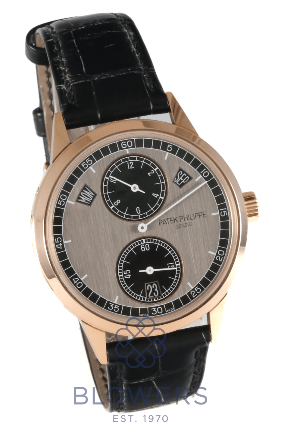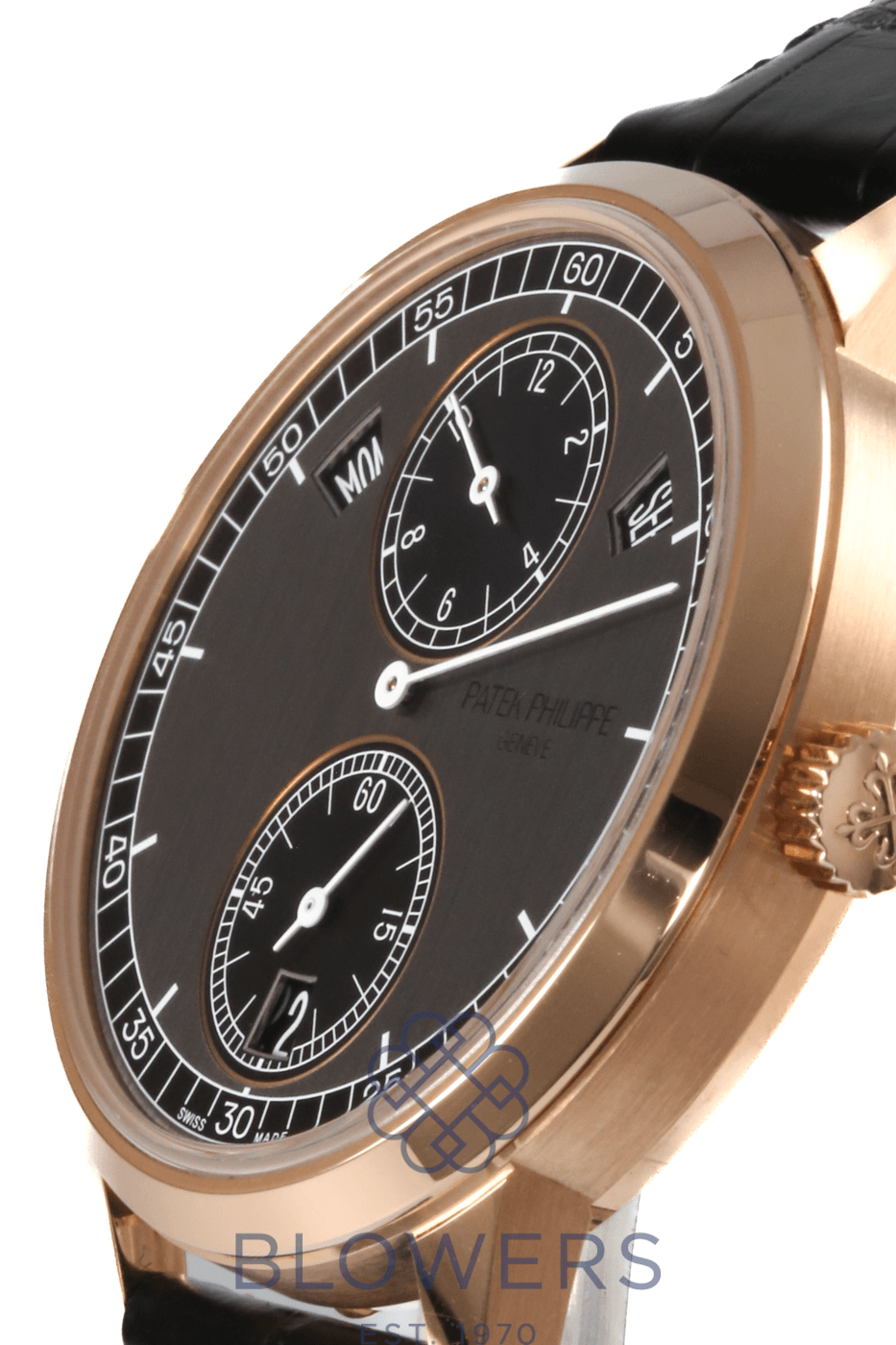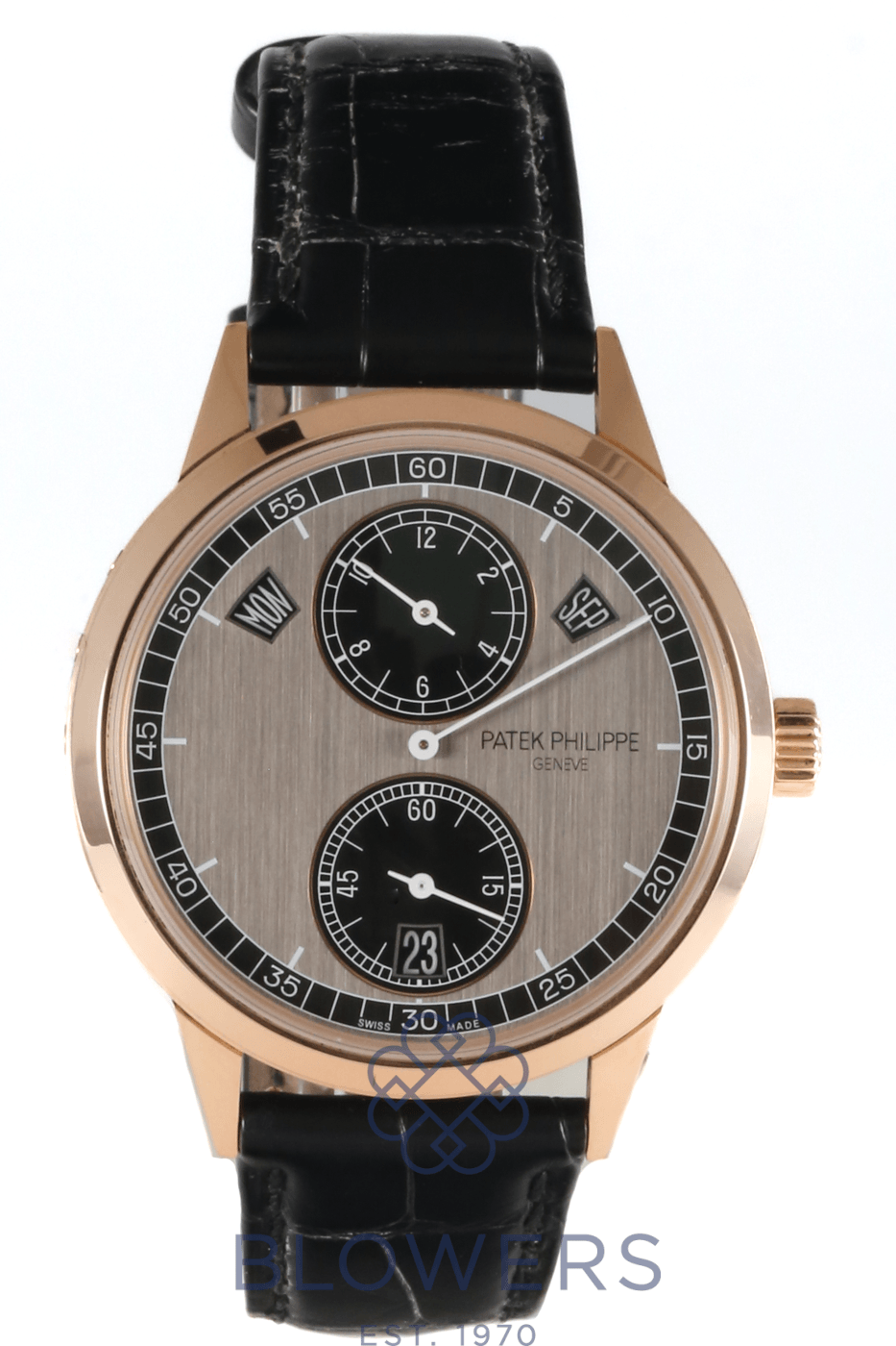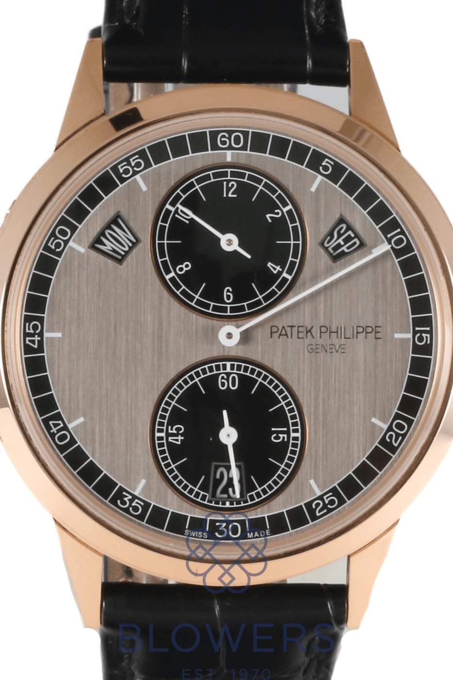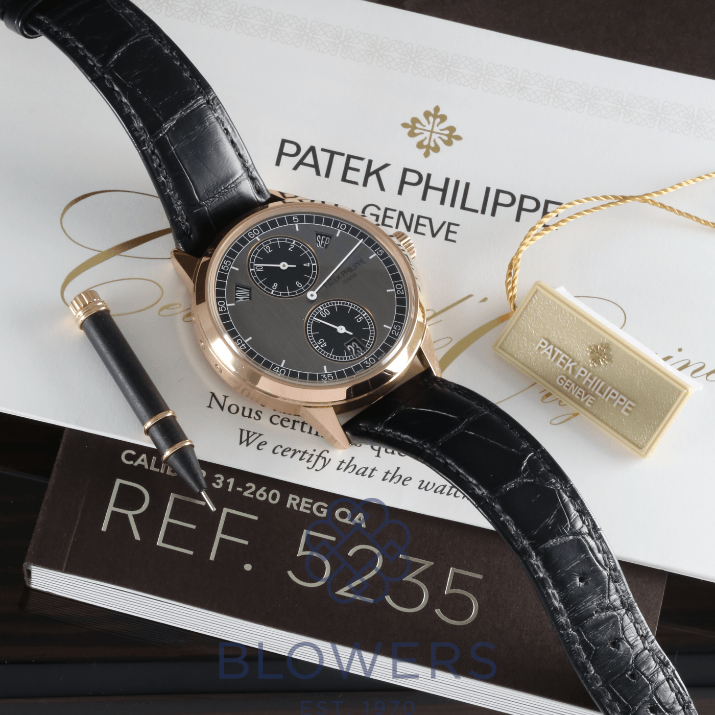 Patek Philippe Annual Calendar Regulator 5235/50R-001. 40.5mm Case In 18ct Rose Gold. Two-tone graphite and ebony black dial with vertical satin-finish, white transfer-printed hour markers. White gold baton-style hands, white varnished. Date Aperture at 6 oclock position, Day Aperture at the 10 o’clock position. Month Aperture at the 2 o’clock Position. Automatic Calibre 31-260 REG QA Movement. Water Resistant to 30 Meters. Black Alligator Strap With 18ct Rose Gold Buckle. Box and Papers Dated December 2019.