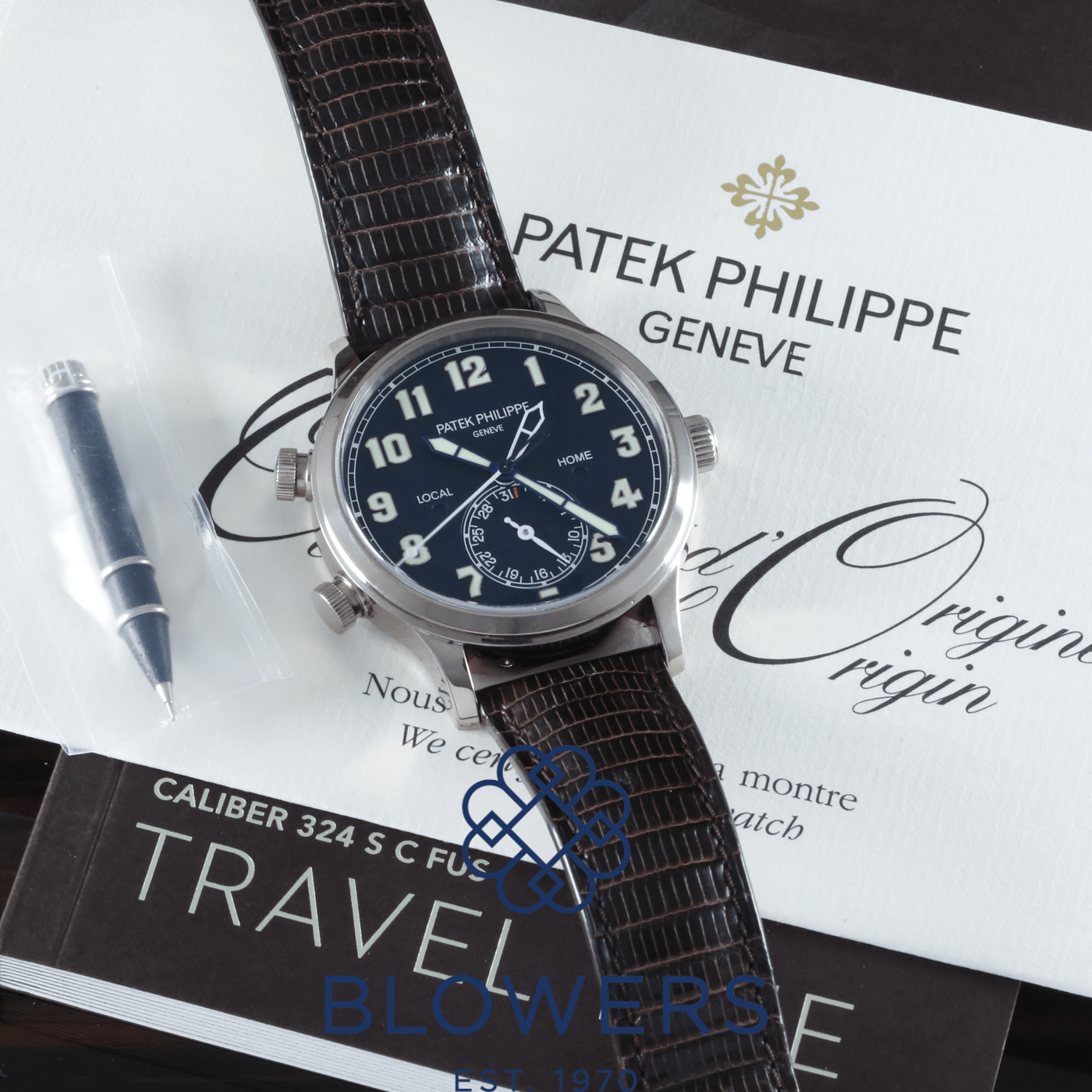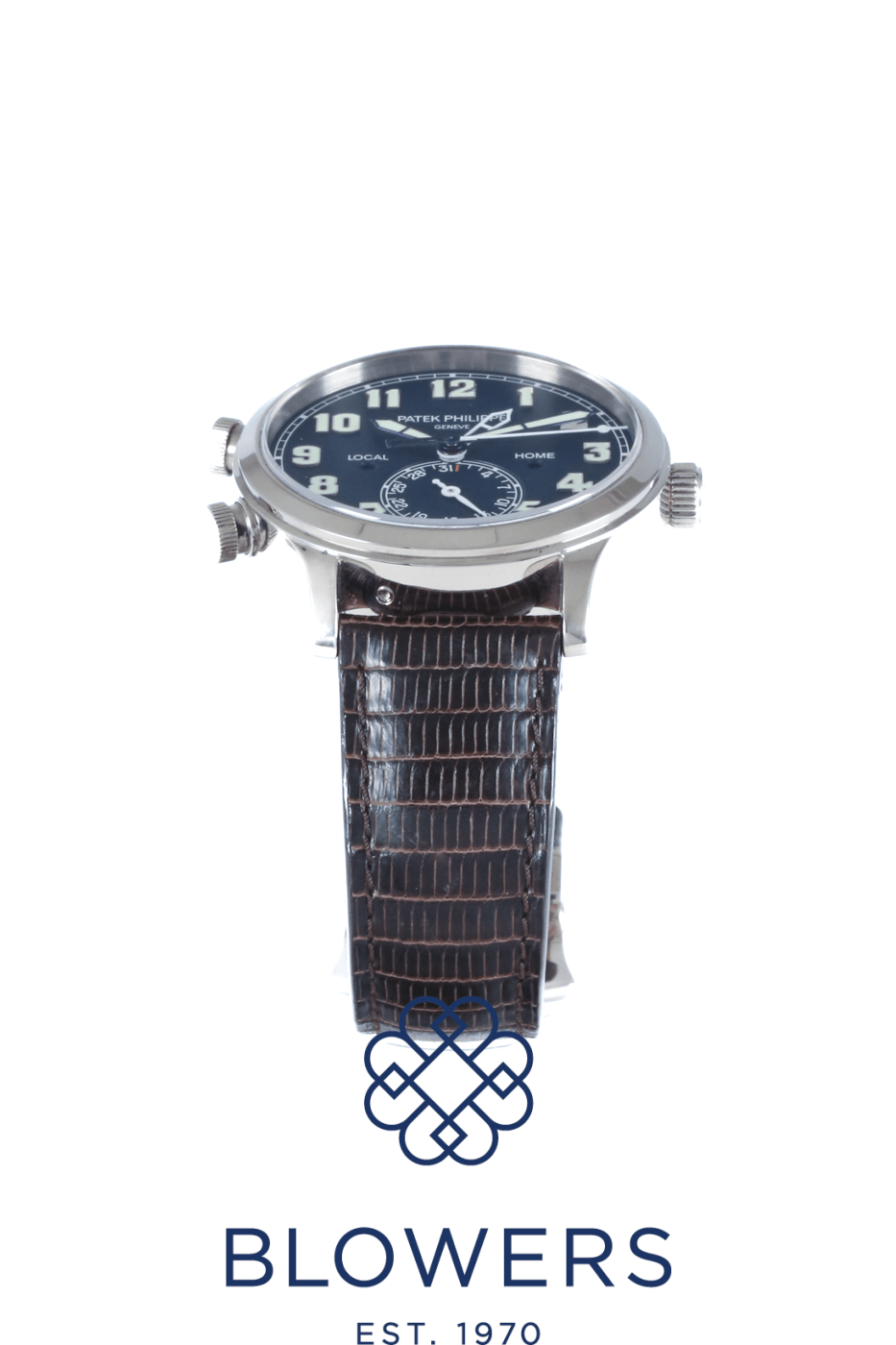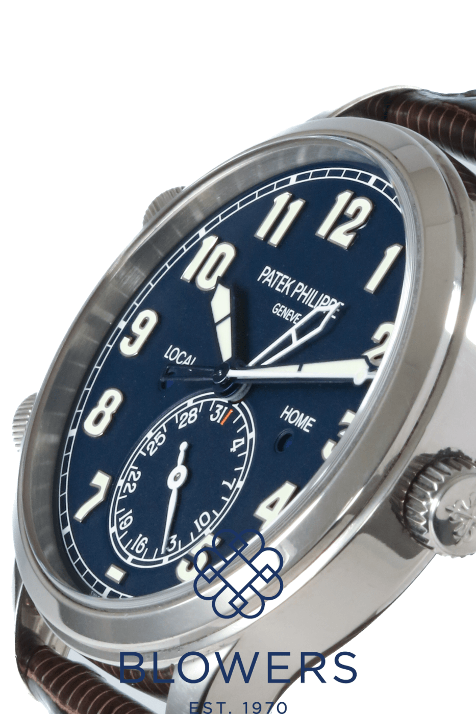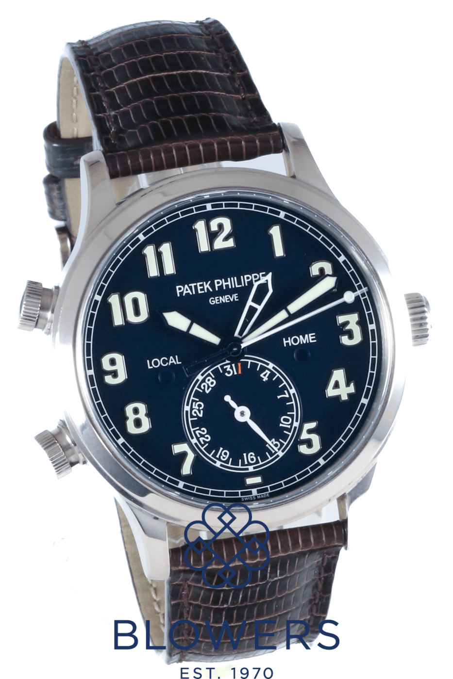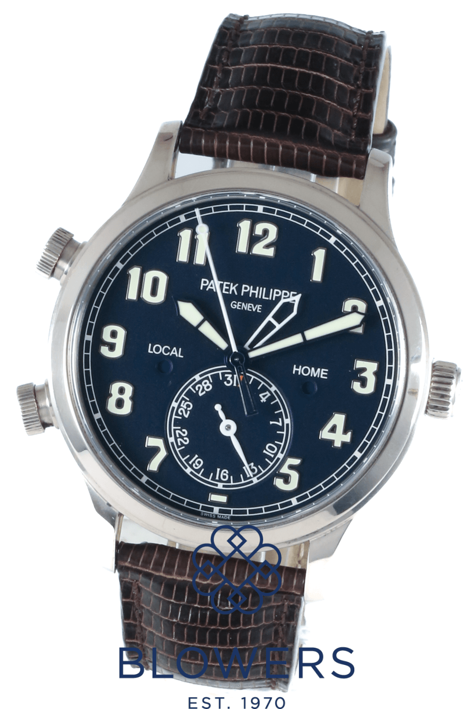 Patek Philippe Calatrava Pilot Travel Time 5524G-001. Automatic, 42mm 18k white gold case. Deep navy blue dial with large luminous Arabic numerals and contrasting hands. Local and home dual time zones. Smooth, polished white gold bezel. Sapphire crystal case back. Gold rotor, Gyromax balance, Spiromax silicon balance spring. Powers reserve of approx 35 – 45 hours. On a Vintage brown leather strap with a white gold clevis prong buckle. Box and Papers dated December 2015.