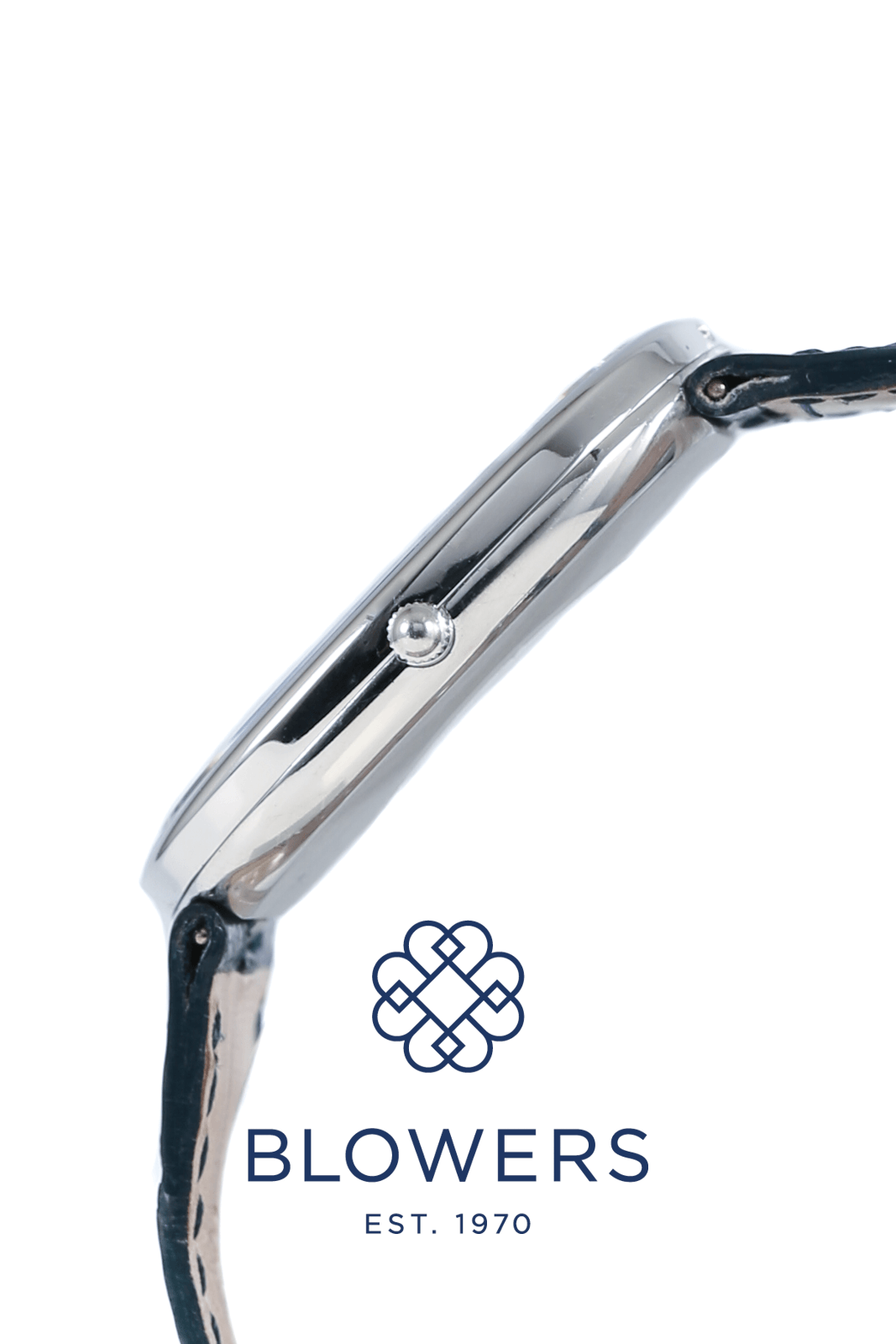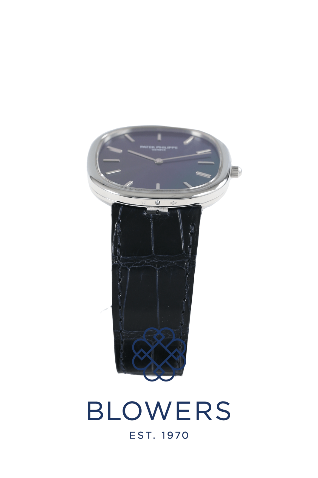 First introduced in 1968, the Golden Ellipse aesthetic proportions are inspired by the mathematical works of Luca Pacioli, and the theoretical concept of the “Golden Proportion”, which marks the beginning of modernised geometry beyond the circle, the mathematically conscious creation incorporates the 1 / 1.6181 ratio as a primary concept of its timeless design. Sustained by a self-winding calibre 240 movement of 27 jewels, and a 48 -hour power reserve, this extraordinary timepiece accomplishes both elegance and functionality- featuring a radiant blue sunburst dial with gold applied hour markers, upon an 18k gold dial plate. A solid case-back, upon a navy Patek Philippe alligator leather strap with a Platinum prong buckle clasp. Accompanied by its Patek Philippe box and papers, dated December 2013 and comes with our two year guarantee.