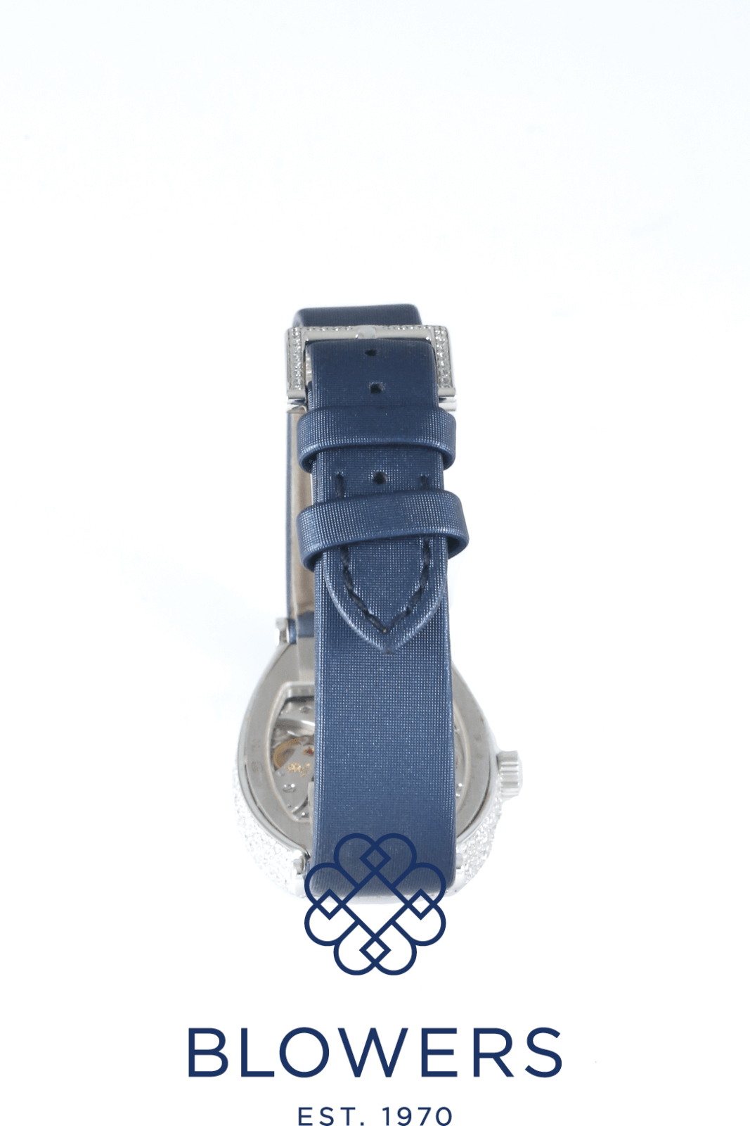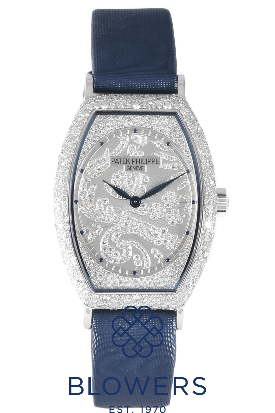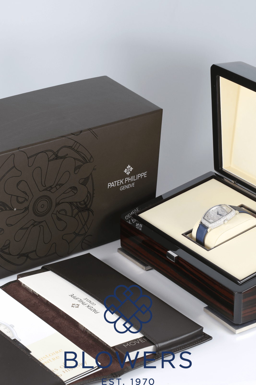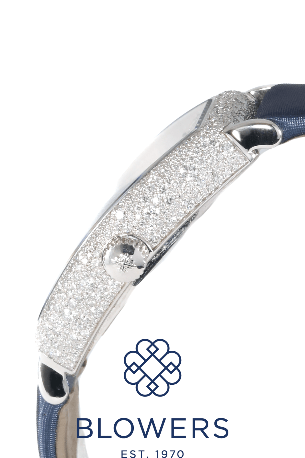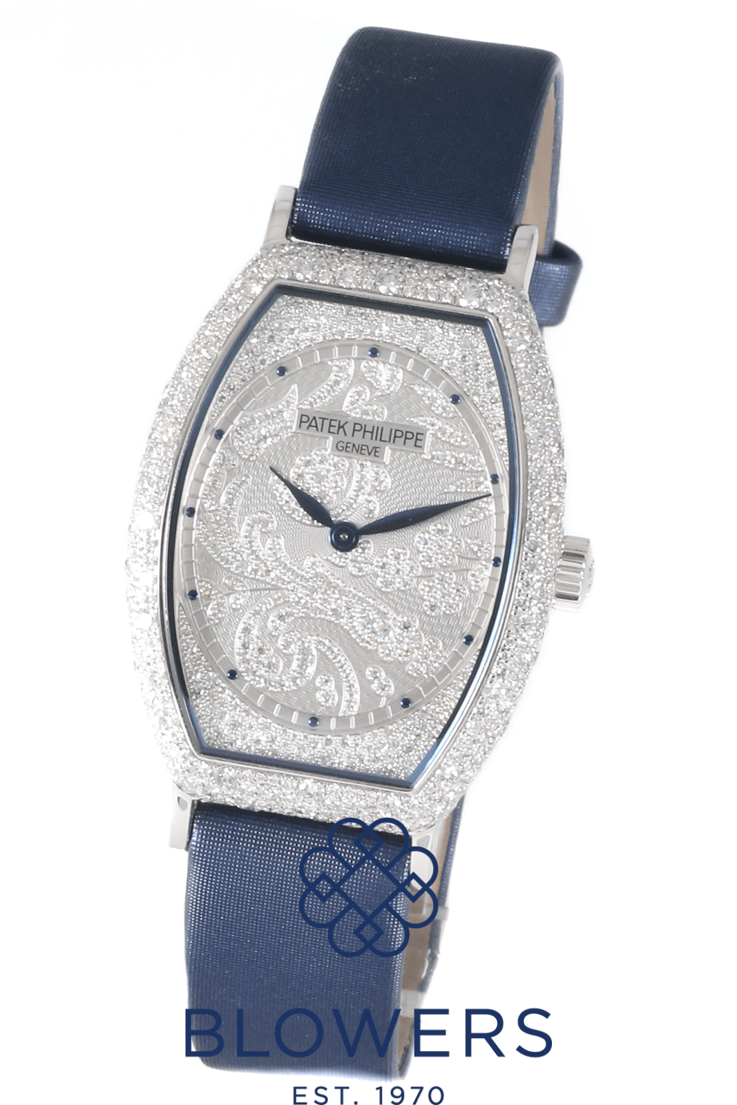 Patek Philippe Gondolo 7099G-001. 39mm 18ct white gold cases set with diamonds. Powered by a manually-wound mechanical movement. The hand-guilloched gold dial is embellished with 367 individual diamonds that combine for a total carat weight of 0.56ct. Cabochon hour markers provide additional, luxurious detailing. Water resistant to 30 metres. Blue, brushed satin strap with a White Gold buckle set with diamonds. Box and Papers Dated March 2015.