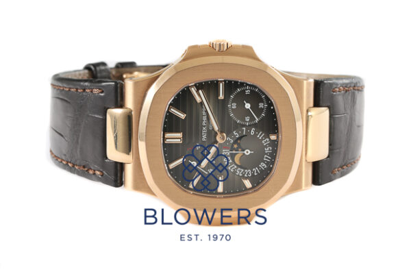 Patek Philippe Nautilus 5712R-001. Case diameter 40mm water resistant to 60 meters, screw down crown. Mechanical self winding movement PP Caliber 240 PS IRM C LU. Dark brown dial with gold applied hour markers with luminous coating. Functions: Hours, minutes, second sweep subsidiary, power reserve, date and moon phase display. Brown alligator leather strap with rose gold folding clasp. Sapphire crystal case back. Box and papers dated December 2019.