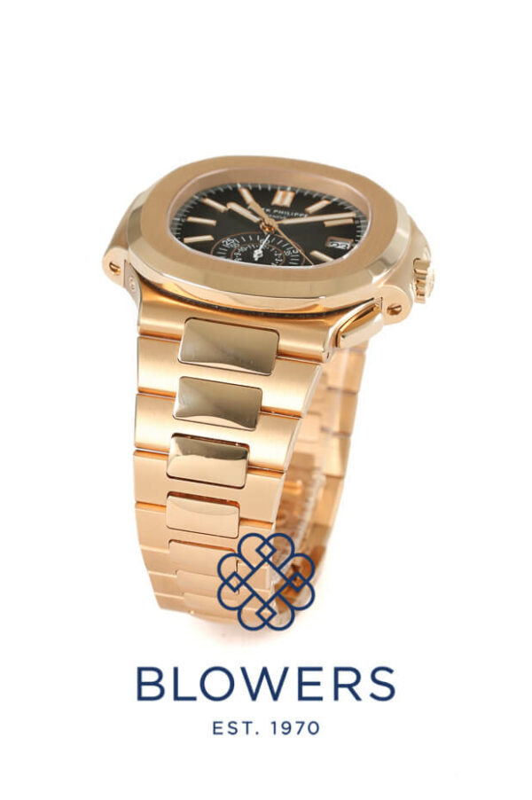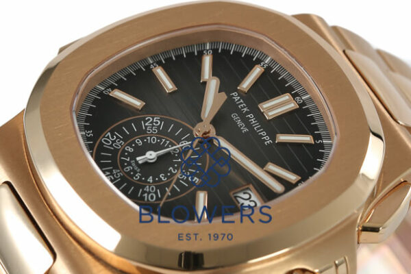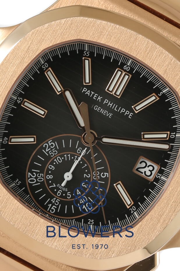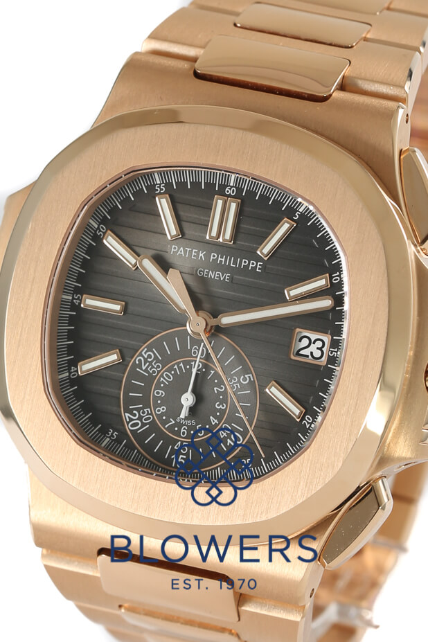Patek Philippe Nautilus 5980/1R-100. 18ct Rose Gold Case, Diameter 40.5mm. Automatic Patek Philippe Caliber Ch 28-250 C, 35 Jewels, 28,800 Vph, Between 45 And 55 Hours Power Reserve. Functions, Hours, Minutes, Sweep Seconds, Chronograph And Date. Chocolate Gradient Dial With Gold Applied Hour Markers With Luminescent Coating. Brushed And Polished 18ct Rose Gold Bracelet With Double Folding Clasp And Safety. Box and Papers Dated March 2015.