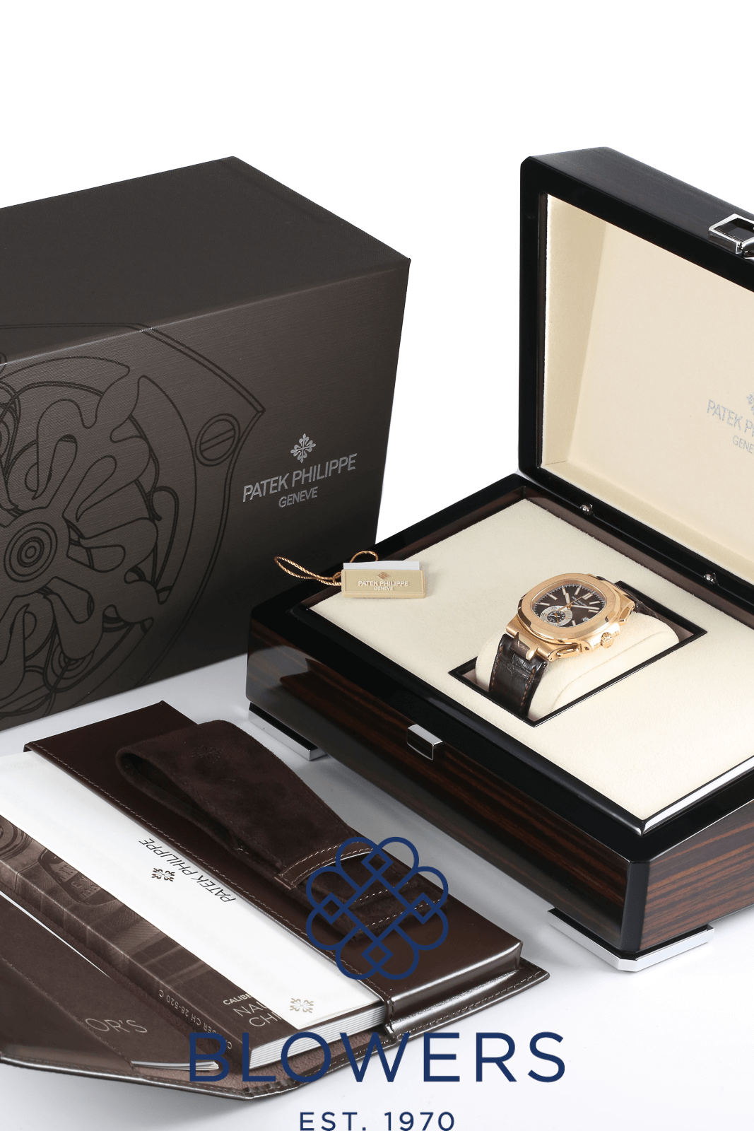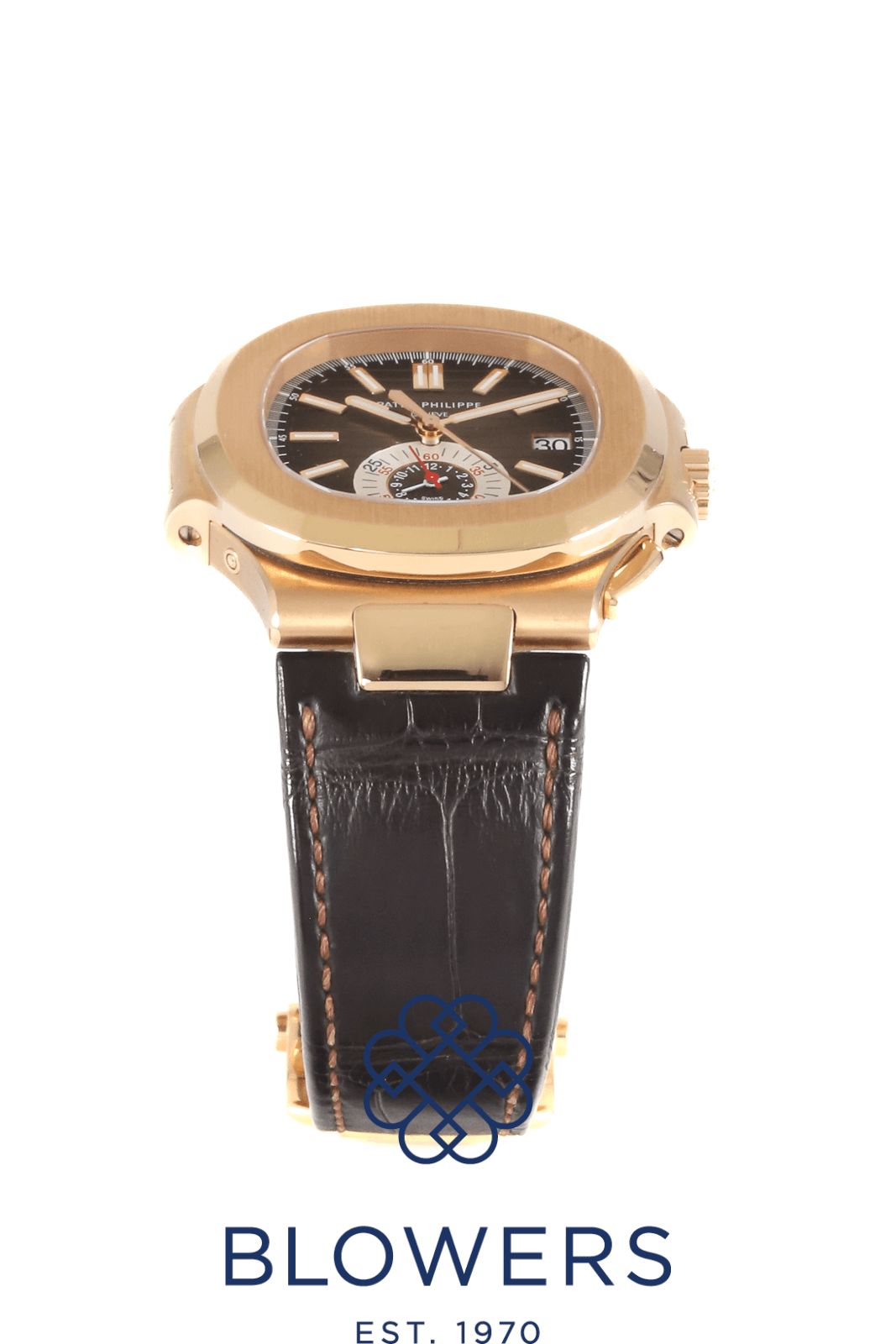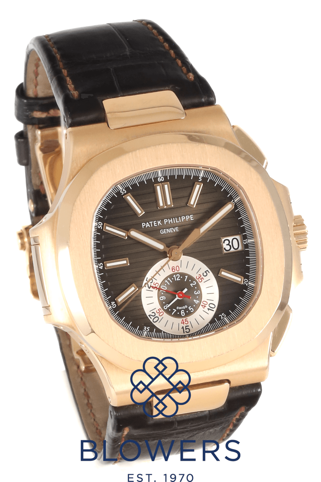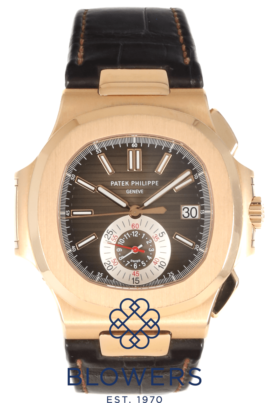 Patek Philippe Nautilus 5980R-001. 18k Rose Gold 40.5mm case, 12.2 mm thick. Automatic, self-winding with flyback chronograph function and date. Brown gradient horizontally embossed dial with gold applied hour markers and luminescent coating. Date display at the 3 o’clock position. Central chronograph seconds, combined 60-minute/12-hour sub-dial at 6 o’clock. Sapphire crystal case back. On a Brown Croc strap with a 18k buckle and folding clasp. Box and papers dated December 2019.