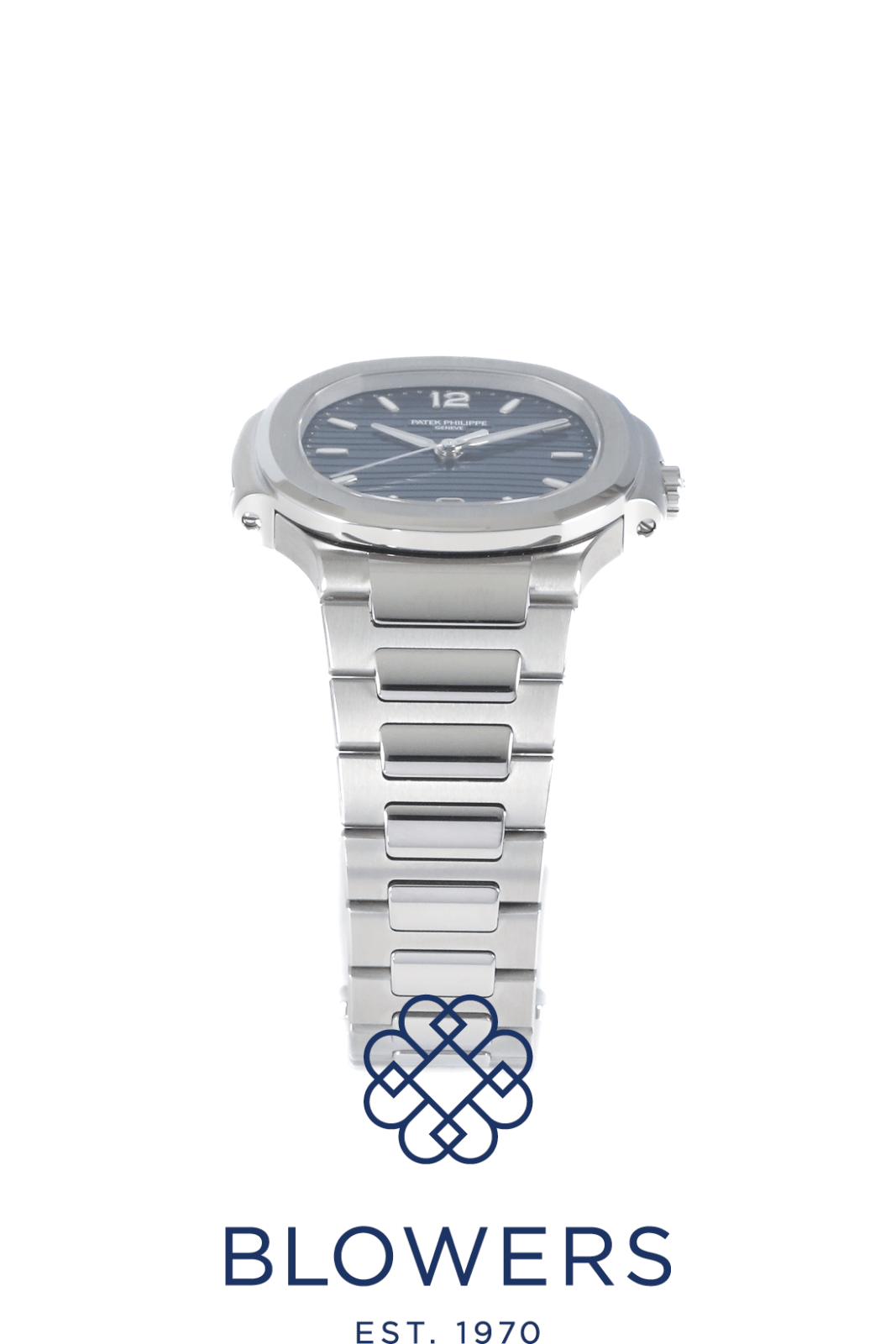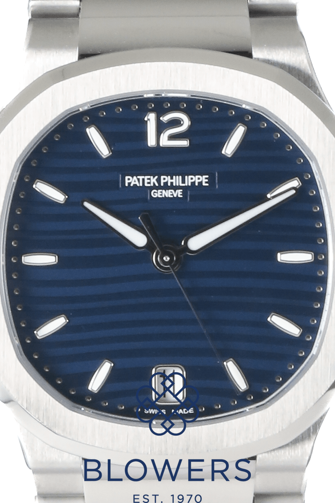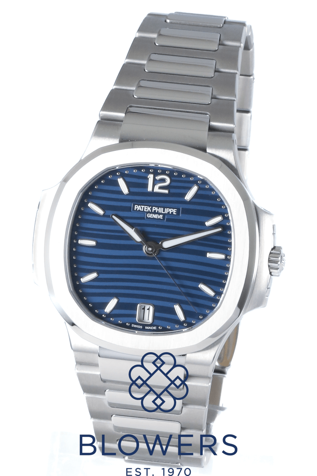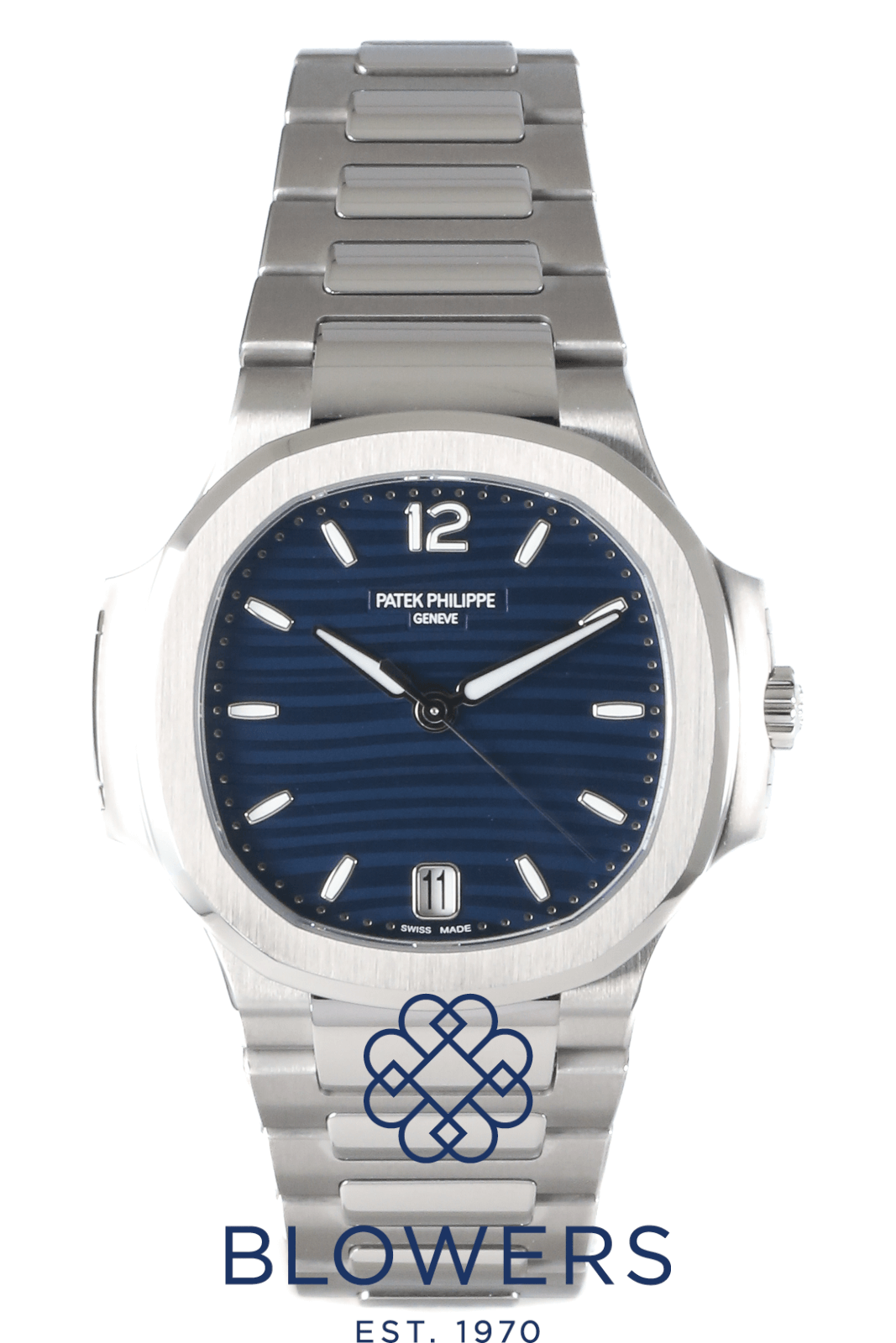 Patek Philippe Ladies Nautilus 7118/1A-001. Steel, 32.5mm case. Self winding movement. Blue opaline ‘wave’ dial, white gold applied numerals and hour markers with white luminescent coating. Date function at the 6 o’clock position. Sapphire crystal case-back. Winding rotor: 21K gold central rotor. Number of jewels: 30. Water resistant up to 30 metres. Steel bracelet with a steel patented fold-over clasp. Box and Papers dated March 2025.