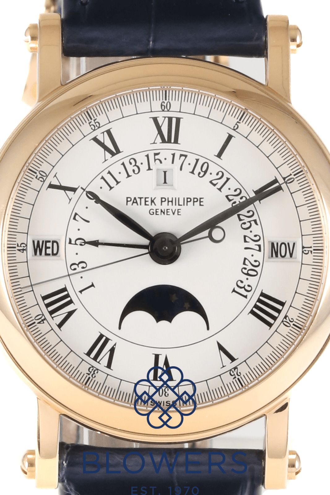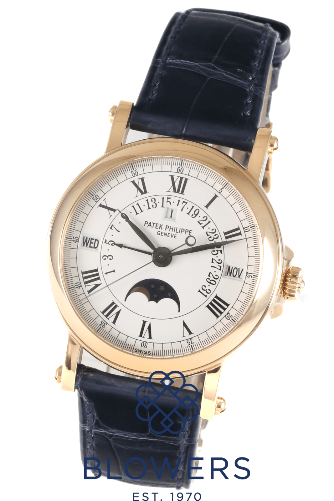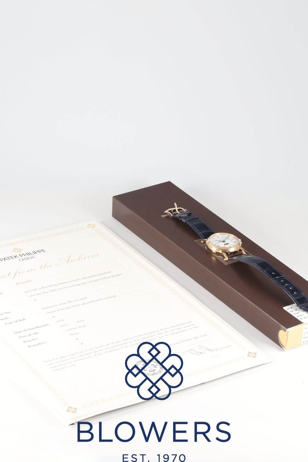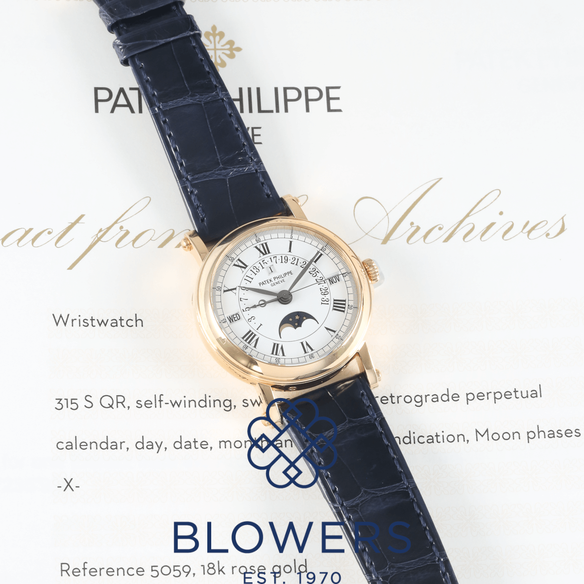 Patek Philippe Perpetual Calendar 5059R. 36mm diameter 18ct rose gold ‘officer’s case. Self-winding calibre 315 S-QR movement that can be viewed through the hinged case-back. White dial with black Roman numerals and a black outer minutes track. Central black hours, minutes and seconds hands. Functions include the perpetual calendar complication, the retrograde date display, and the moonphase indicator above the six o’clock position. Navy alligator leather strap with an 18ct rose gold pin buckle. Additional black alligator leather strap with an 18ct rose gold pin buckle. Accompanied by its Patek Philippe ‘Extract from the Archives’ papers, and Patek Philippe service papers dated November 2025 providing a Patek Philippe warranty for 24 months.