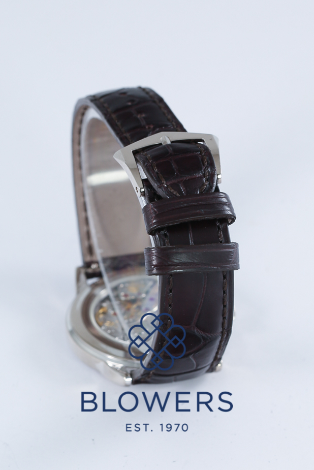 Presented on a white alligator strap with white gold ardillon buckle, also comes with an additional brown alligator strap. This watch is a Patek Philippe classic.