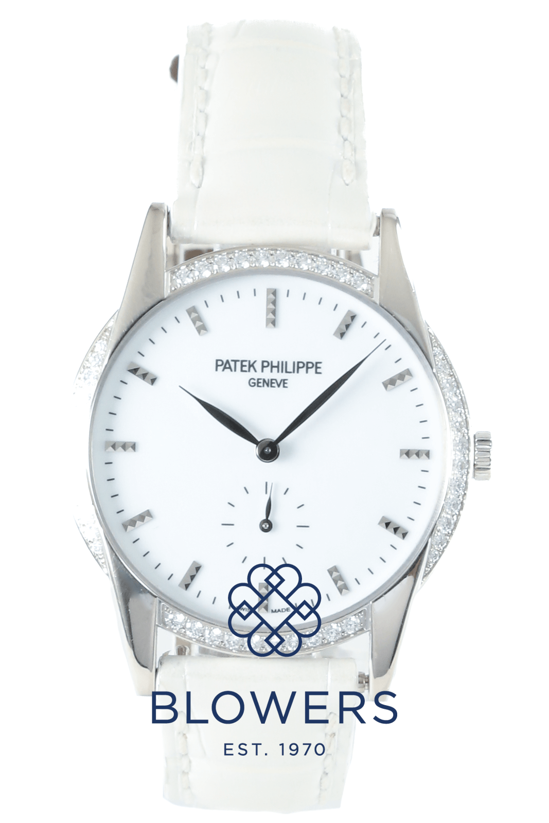 This watch is 33mm in diameter, 7mm thick and water-resistant to 30 metres. The white lacquered dial, with small seconds subdial at 6 o’clock, features applied hobnail-patterned hour markers which catch the light and complement the wonderful bezel set with 44 brilliant-cut diamonds (~0.47 ct). To increase their brilliance, the case below each diamond is slightly hollowed out, allowing reflected light to escape more easily (a Patek patent). The Caliber 215PS manually-wound movement, embellished with the PP seal, is accurate to -3/+2 seconds per day; its beauty is visible through the sapphire-crystal, exhibition case back.