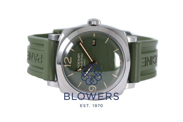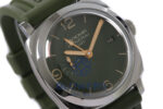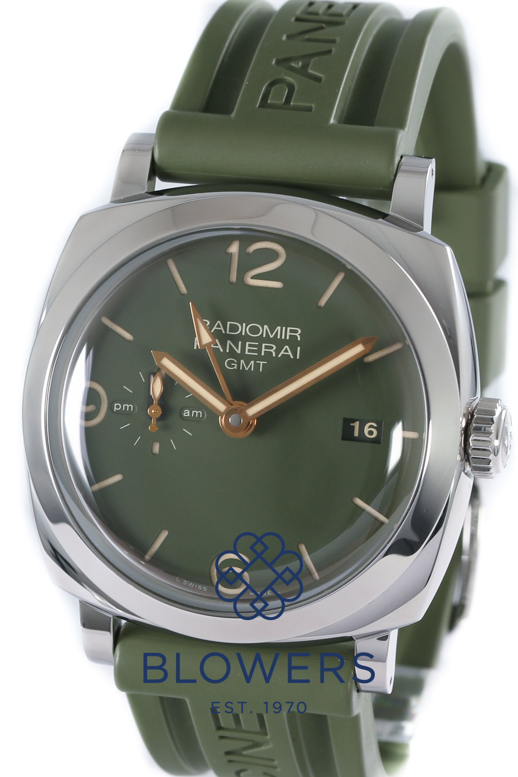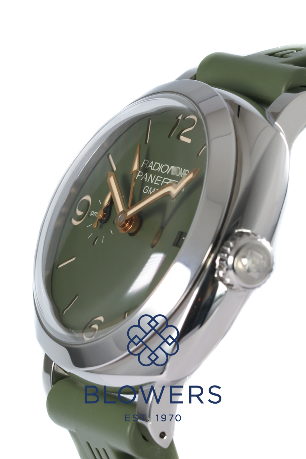 Radiomir GMT PAM00998. 45mm polished steel case. Military green dial with luminous Arabic numerals and hour markers. Date at 3 o’clock, 24h indicator at 9 o’clock. Automatic mechanical, P.4001 calibre movement, created by Panerai. Power reserve 3 days, water resistant to 100m. Hours, minutes, small seconds, date, GMT, 24h indicator, seconds reset. See-through sapphire crystal case-back. Green rubber strap with steel buckle. Box and papers dated July 2021. PAM 998.