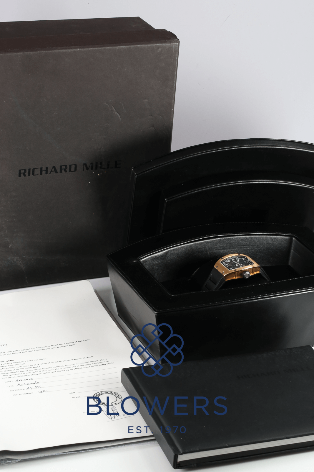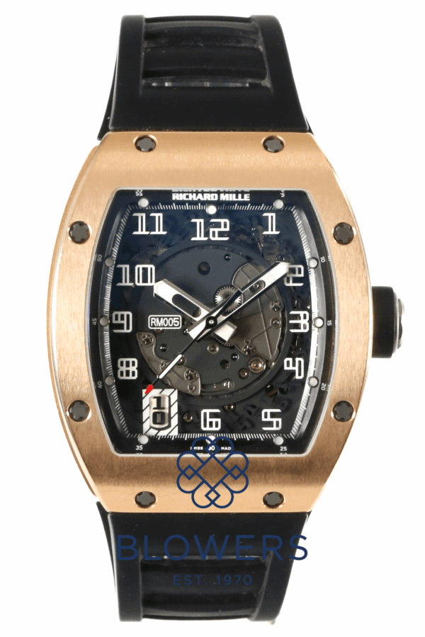 Richard Mille RM 005 AF PG. 38mm x 45 mm Rose Gold Case. Automatic RM 005 Movement, 32 Jewels, 55 Hour Power Reserve with Hours, Minutes, Seconds, Date And Adjustable Rotor Geometry, this Patented Invention Enables the Optimisation and Personalisation of the Movement’s Winding Efficiency by Allowing Adjustment of the Six-position Rib Placement Setting. By Modifying the Rotor’s Inertia, the Mechanism Adapts to the Wearer’s Lifestyle—Enhancing Winding Performance during Periods of Low Wrist Activity or Reducing it During High-Intensity Physical Movement. Sapphire Crystal Dial with White Numeral Hour Markers, Exhibiting The Movement, See Through Case Back. Black Rubber Richard Millie Strap with 18ct Rose Gold Richard Millie 005 Tang Buckle. Complete with Box and Papers. Service Papers dated October 2017.