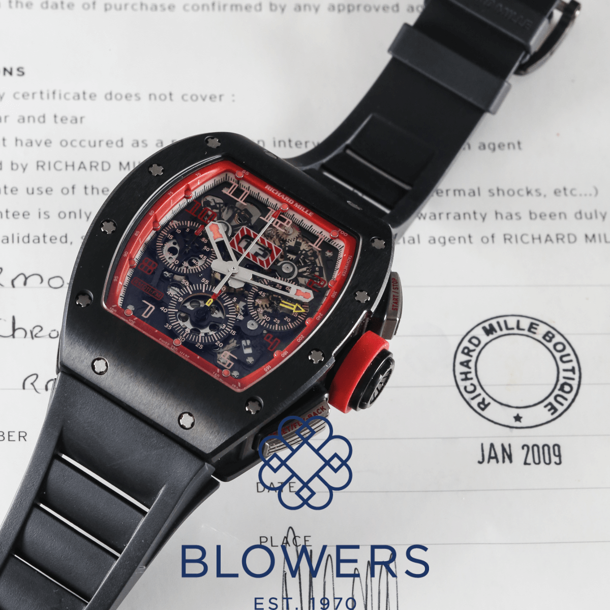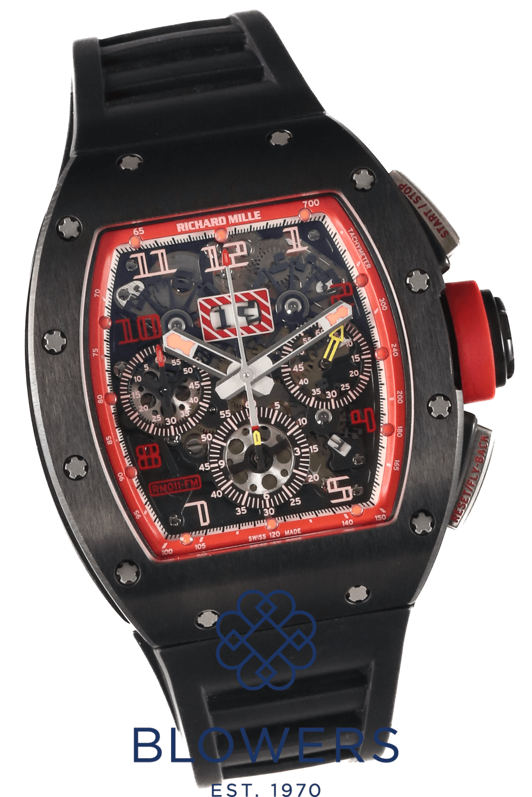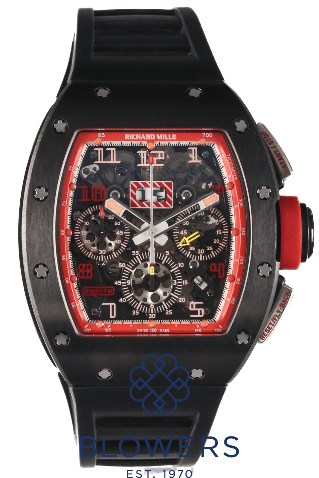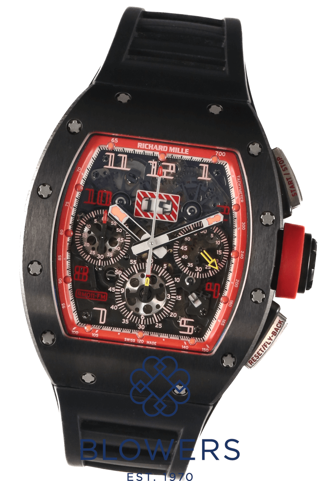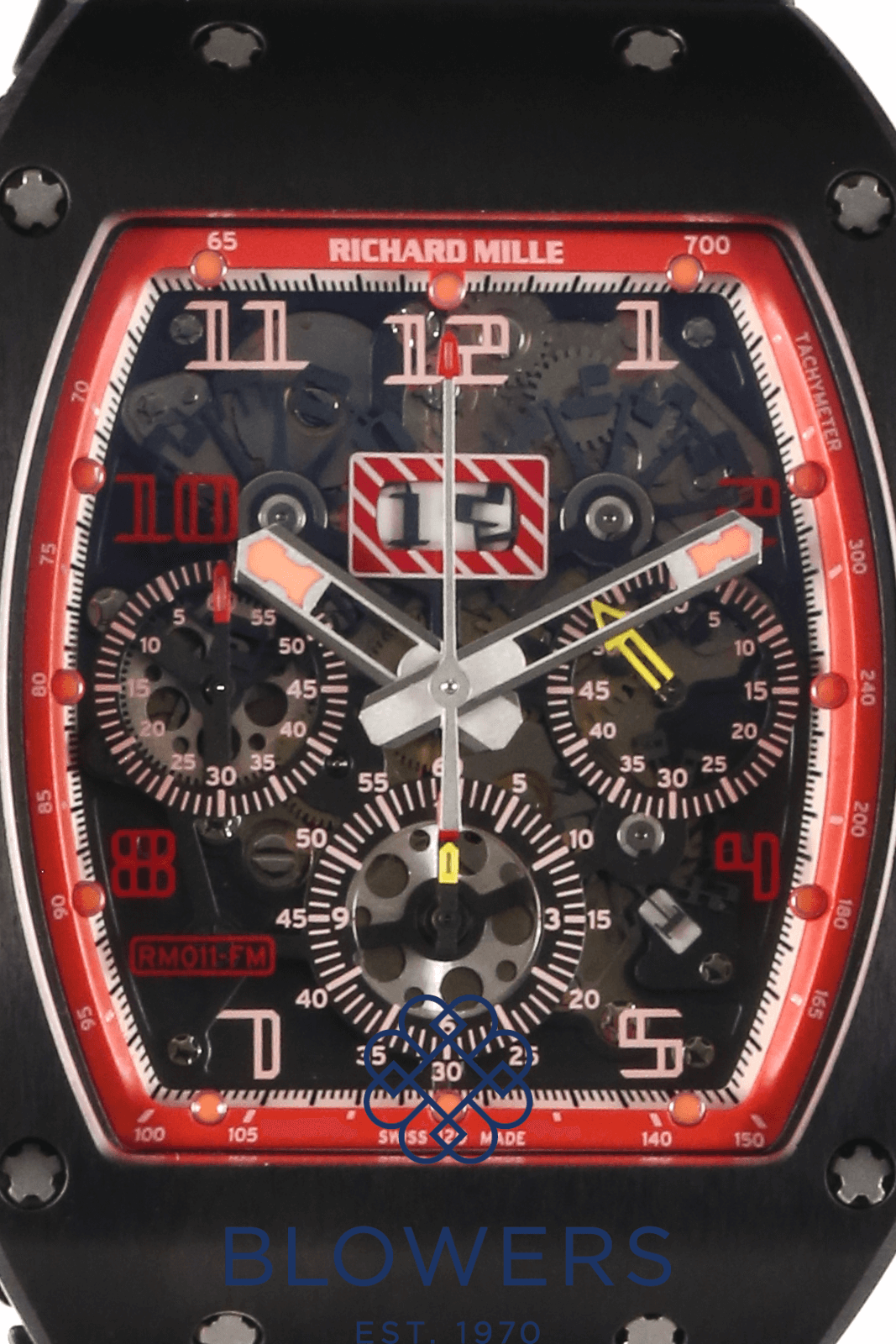 Richard Mille RM011 AH TI Felipe Massa Flyback Chronograph. Titanium Case. Diameter Length 50 MM X 40 MM. Water Resistant To 50 Meters. Automatic Chronograph Movement. Skeletonized Dial With White And Red Arabic Numeral Hour Markers. Adjustable Rotor Geometry, Offering Hours, Minutes, Seconds, Chronograph, 60-Minute Countdown Timer, 12-Hour Totalise. Date Window Located At The 12 O’clock Position. Black Rubber Strap With Folding Clasp. Box And Papers Dated January 2009.