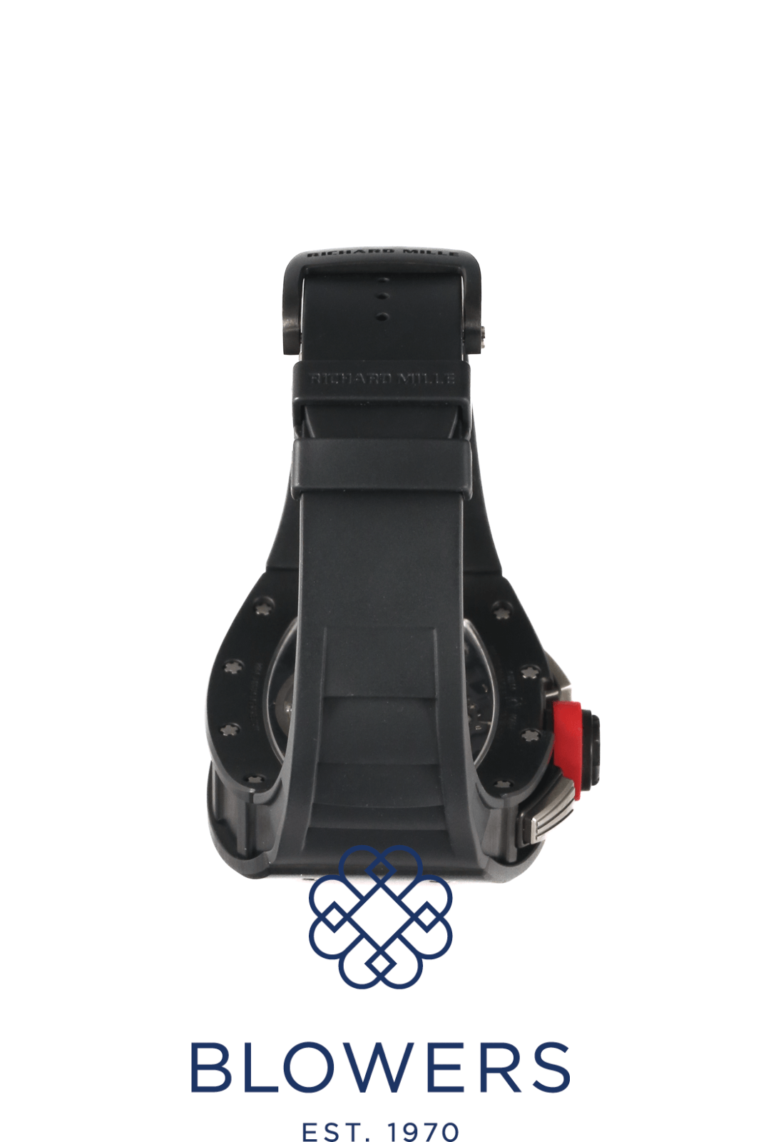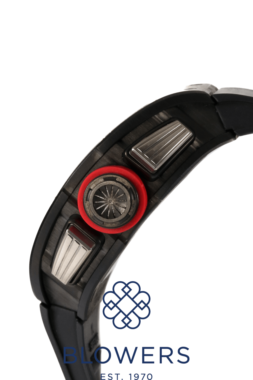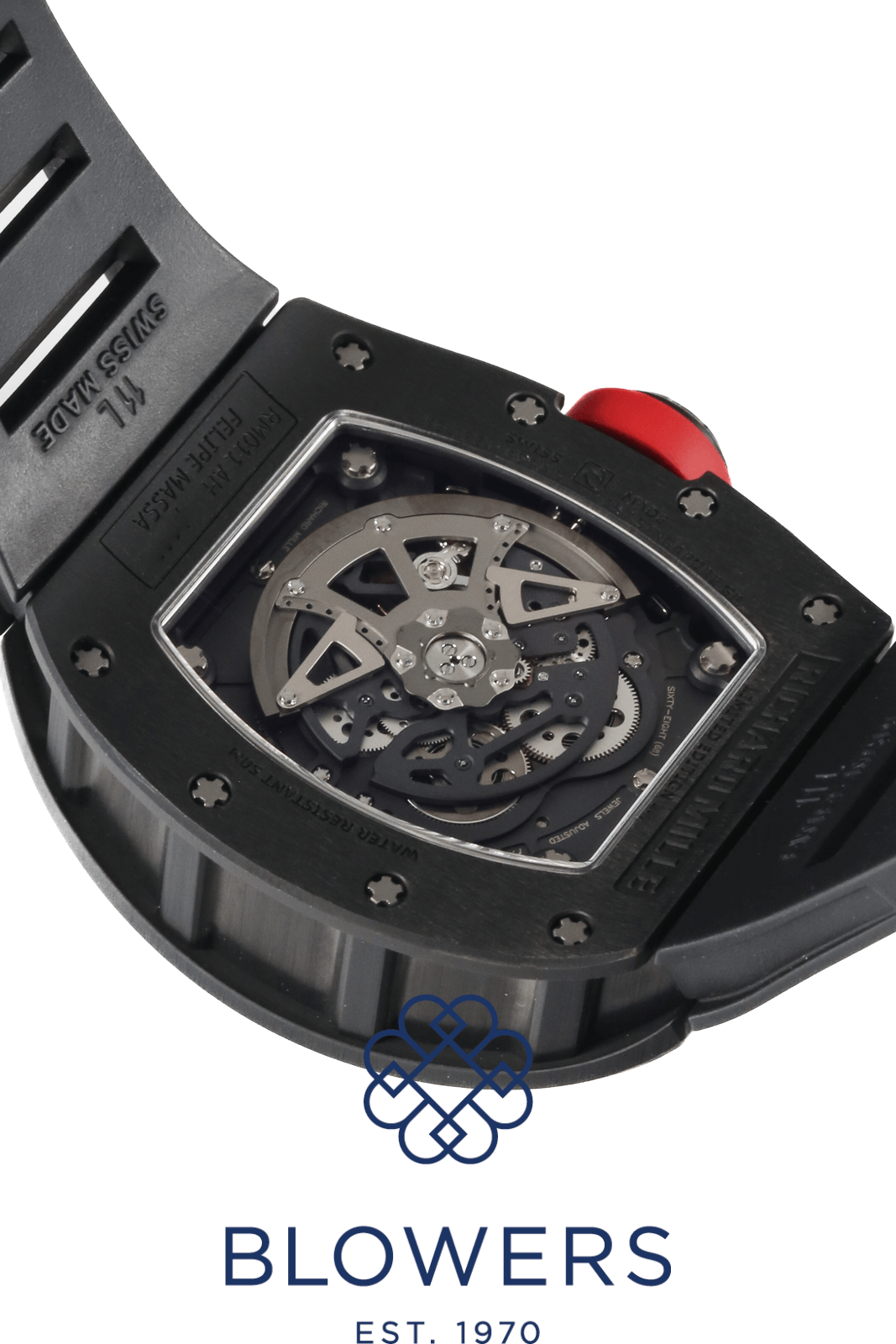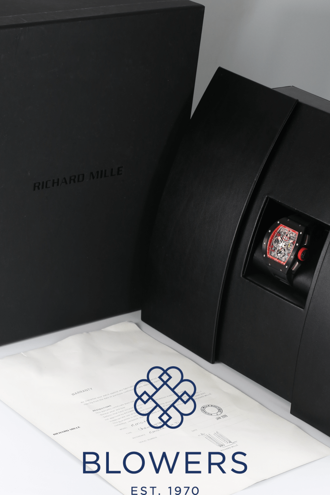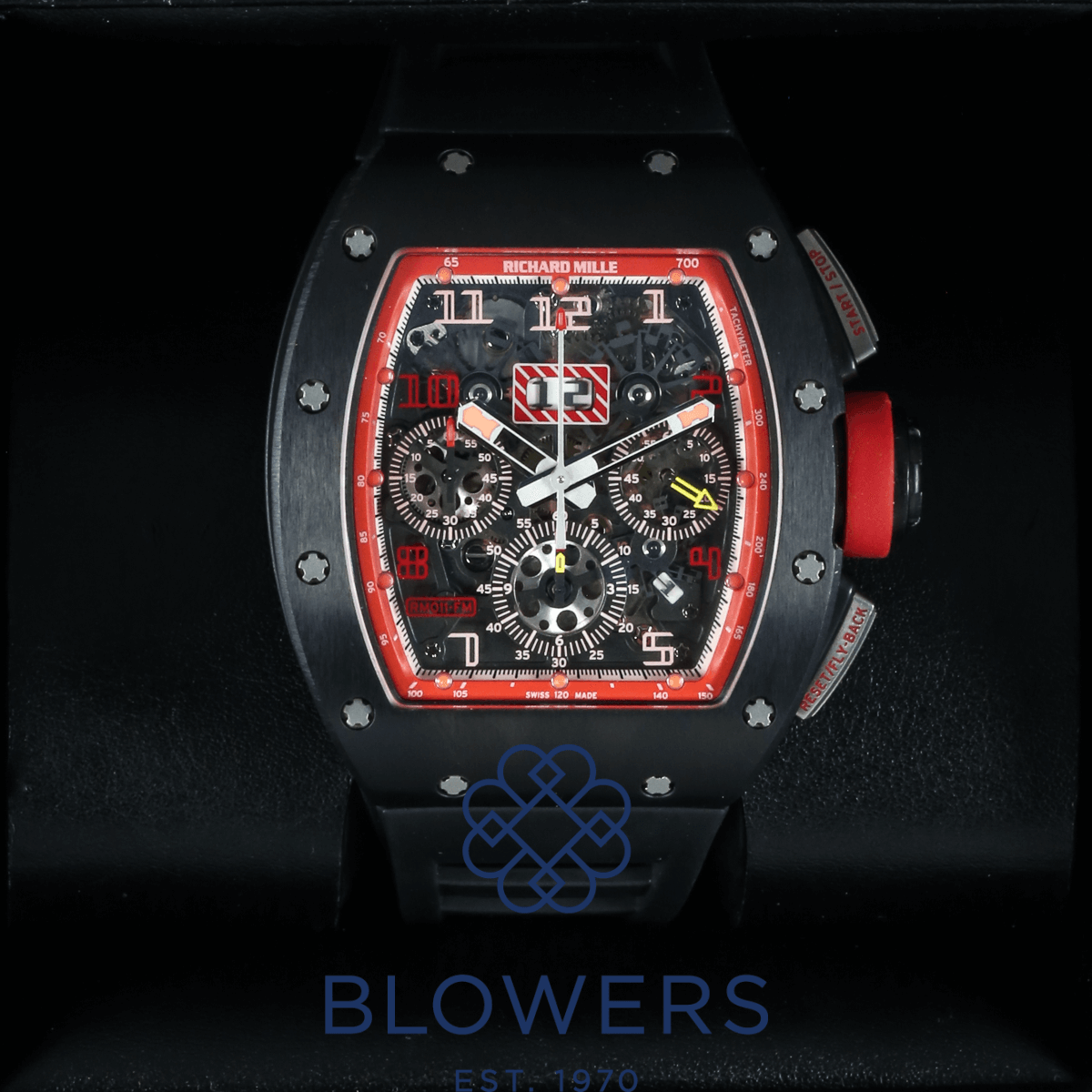 Richard Mille RM011 AH TI Felipe Massa Flyback Chronograph. Titanium Case. Diameter Length 50 MM X 40 MM. Water Resistant To 50 Meters. Automatic Chronograph Movement. Skeletonized Dial With White And Red Arabic Numeral Hour Markers. Adjustable Rotor Geometry, Offering Hours, Minutes, Seconds, Chronograph, 60-Minute Countdown Timer, 12-Hour Totalise. Date Window Located At The 12 O’clock Position. Black Rubber Strap With Folding Clasp. Box And Papers Dated January 2009.