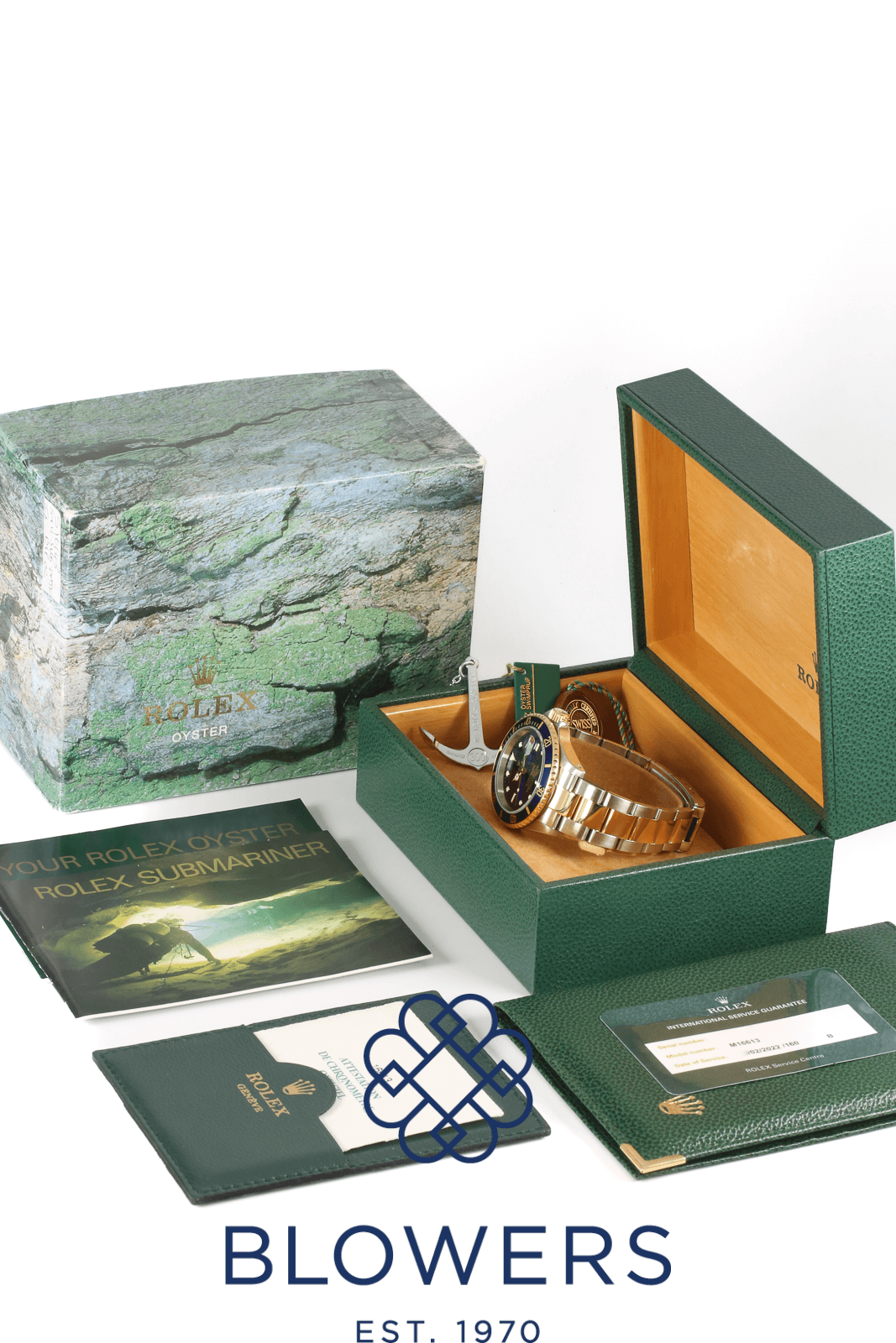 Rolex Bi-Metal Submariner Date 16613. 40mm case diameter with Blue maxi dial and blue uni-directional ceramic bezel. Water resistant to 300 meters. Automatic chronometer 3135 movement. 48 hour power reserve. Bi-Metal Oyster lock bracelet with comfort adjust. Comes complete with Rolex anchor, Red COSC swing tag, booklet, instruction manual, Rolex hang tag and bezel protector. Box and papers June 2002. Service papers dated February 2022.