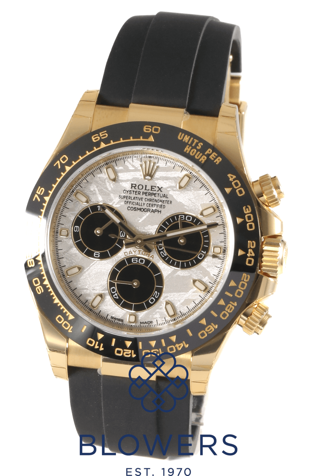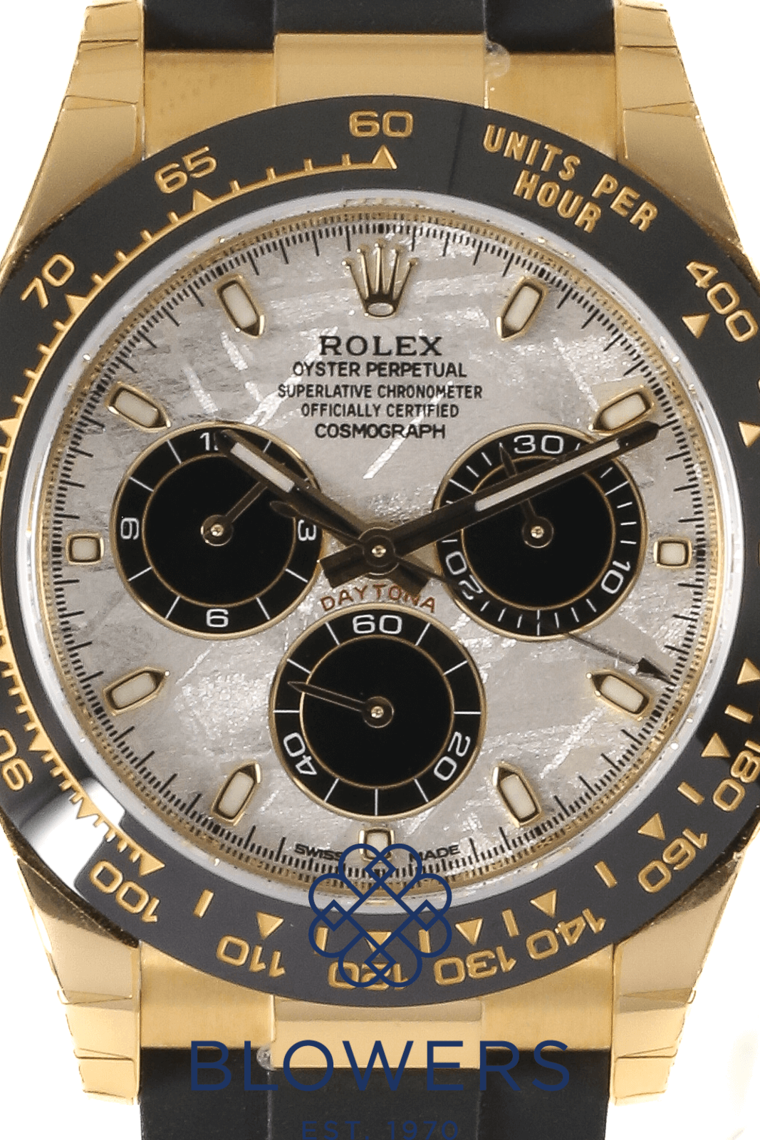 Pairing this rare dial with a full 18ct yellow gold case only amplifies the significance. While steel Daytonas tend to grab mainstream attention, many collectors consider the precious-metal models to be the true connoisseur’s choice—lower production numbers, richer materials, and configurations that feel more intentional. The contrast between the warm gold case and the technical, silvery meteorite texture is one of the most admired combinations in the modern lineup.