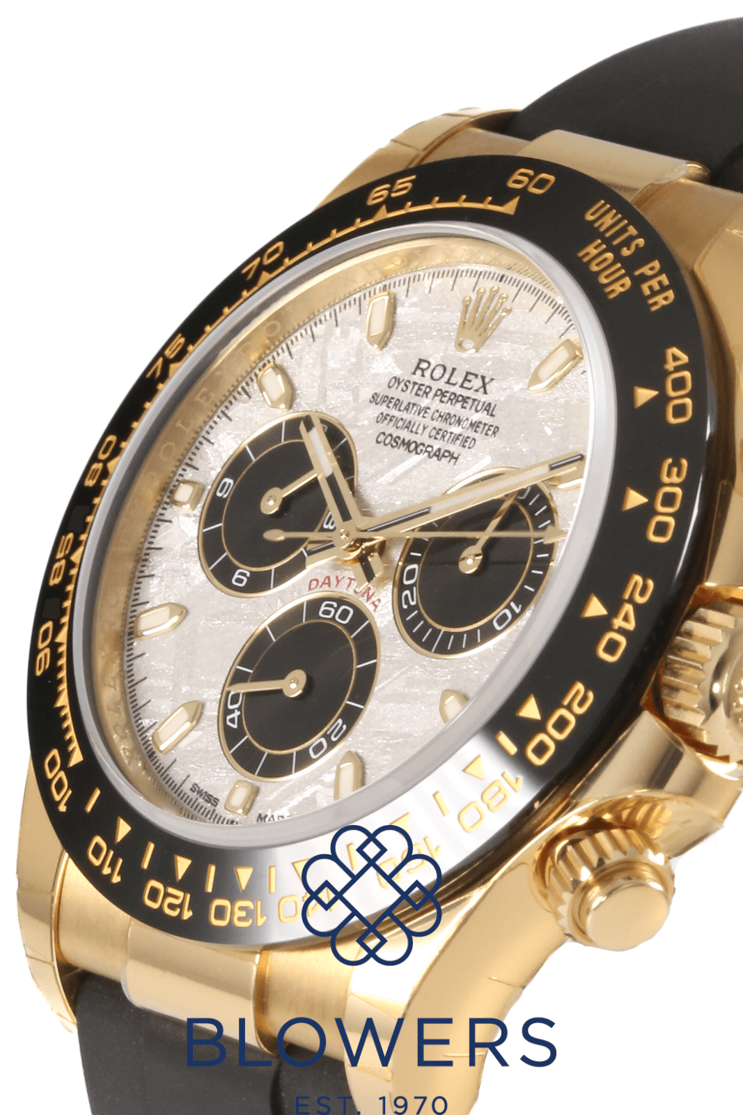 Rolex Cosmograph Daytona 116518LN-0075 “Meteorite Dial”. 18ct yellow gold 40mm diameter case with screw-down crown and screw-down chronograph pushers, water resistant up to 100 metres. Self-winding chronograph calibre 4130 movement with approximately 72-hour power reserve. Fixed black Cerachrom bezel with engraved tachymetric scale in gold. Meteorite dial with chromalight luminescent hour markers and yellow-gold hands. Central hours, minutes and chronograph seconds hands, with 30-minute counter at 3 o’clock, 12-hour counter at 9 o’clock and small seconds at 6 o’clock. Sapphire crystal glass. Fitted on a black Oysterflex bracelet with 18ct yellow gold Oysterlock folding safety clasp and Easylink comfort extension. Fully factory sealed and unworn. Box and papers dated May 2023.