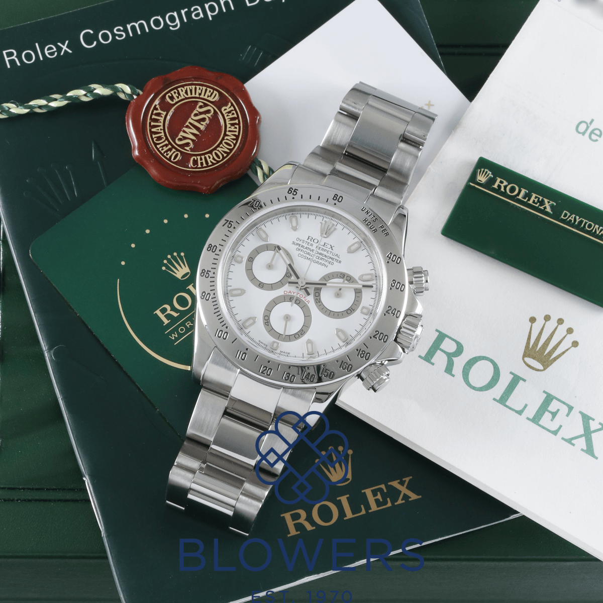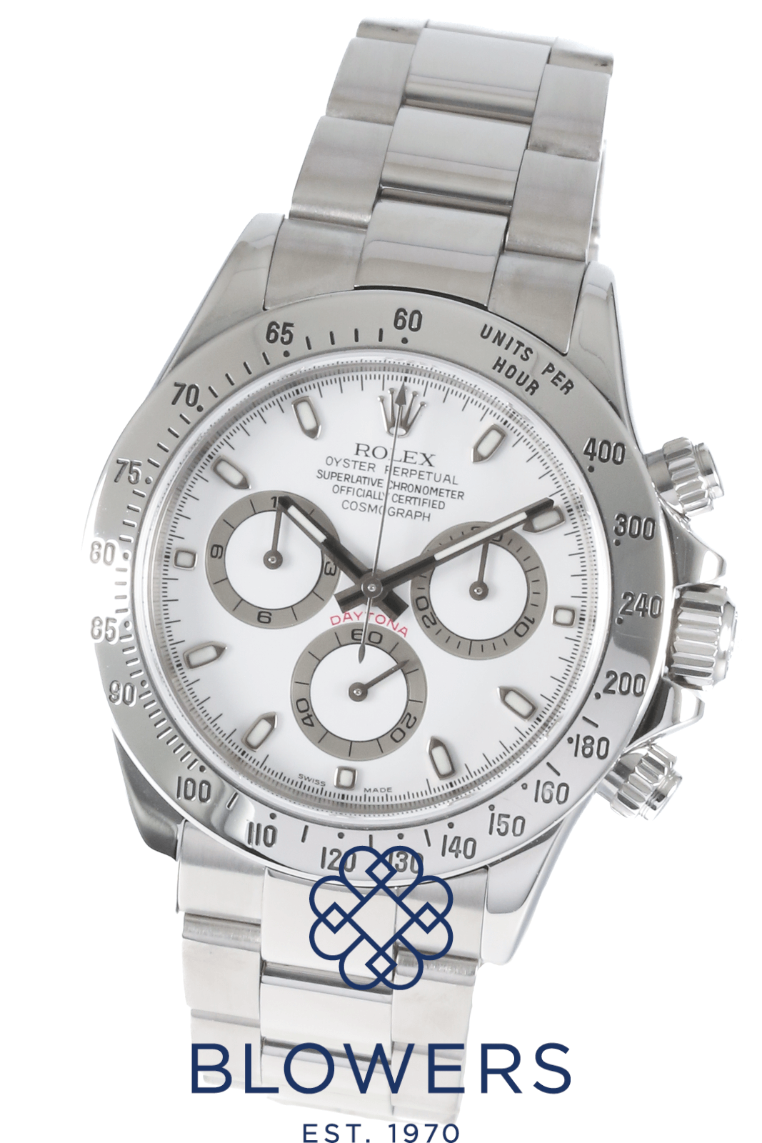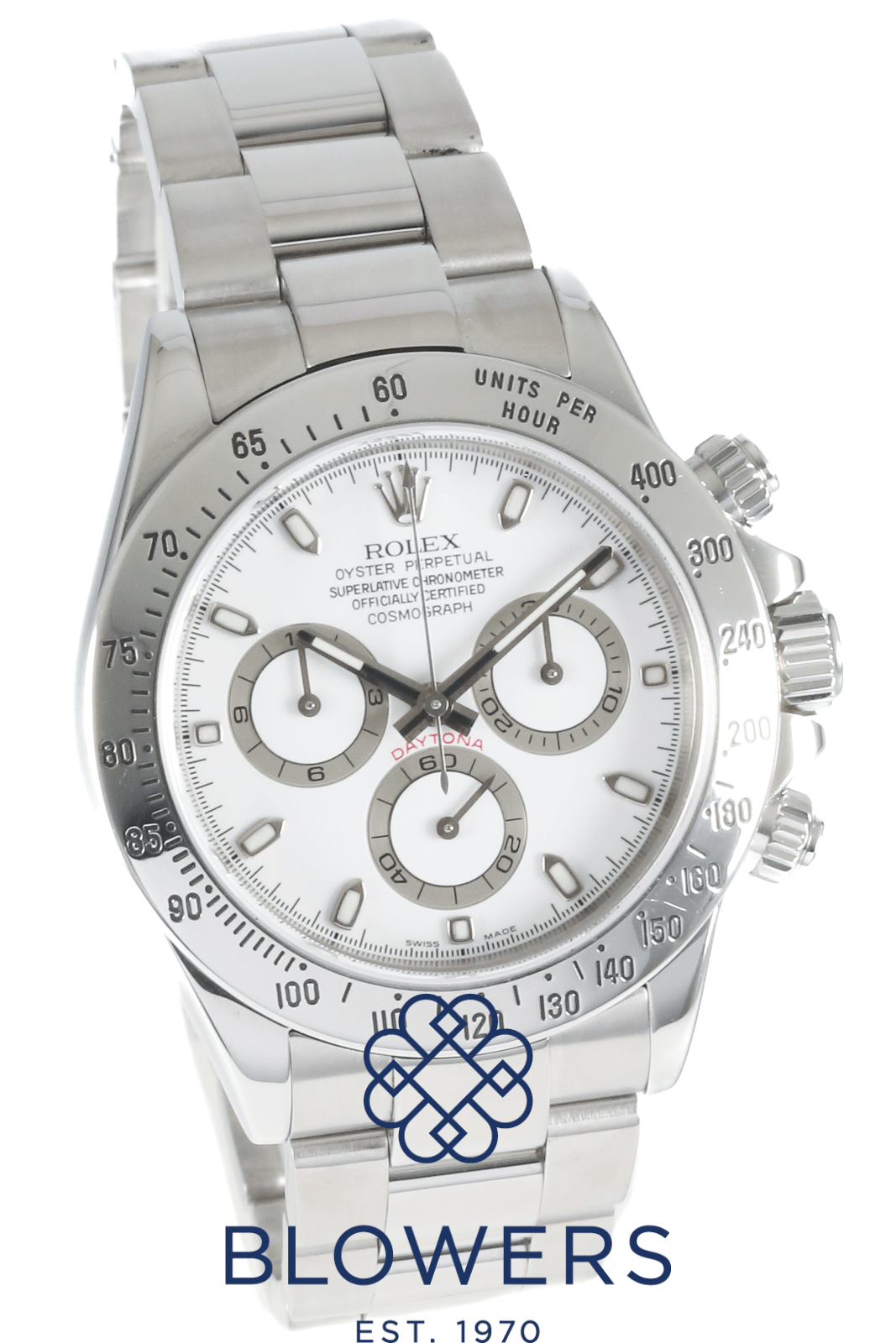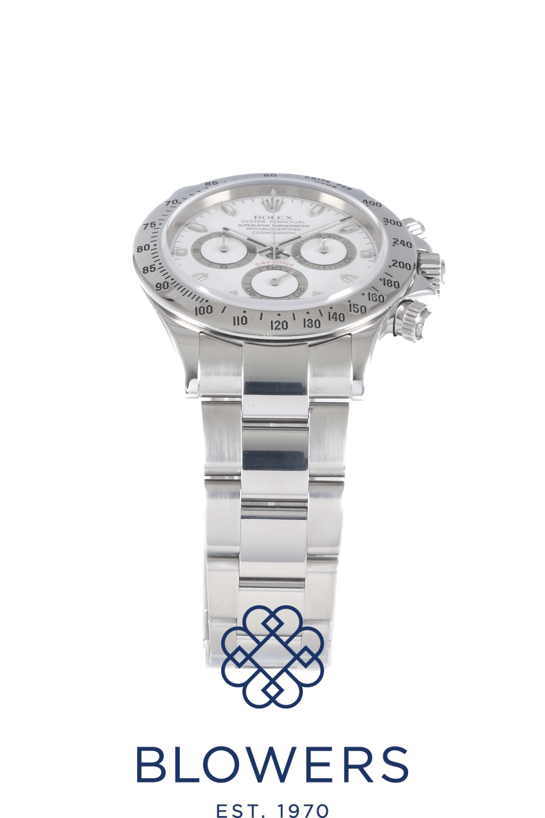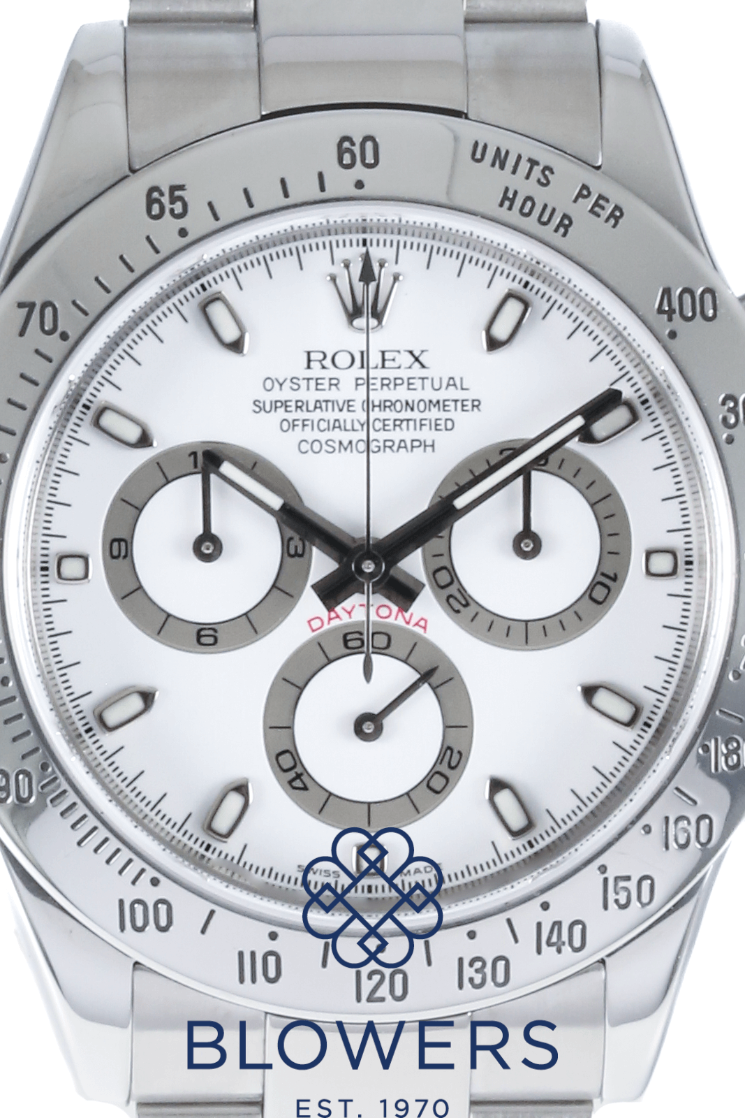 Rolex Oyster Perpetual Cosmograph Daytona 116520. 40mm steel case, which is water resistant to 100 metres. Automatic chronometer chronograph movement. White dial, with steel outlined luminous baton hour markers and hands for chromalight display. Central chronograph hand, accompanied by three silver ring sub-dials (small seconds, 30 minutes, 12 hours). Featuring a steel bezel, engraved with a black tachymetric scale. Steel oyster lock bracelet with new style clasp. Box and papers dated November 2005.