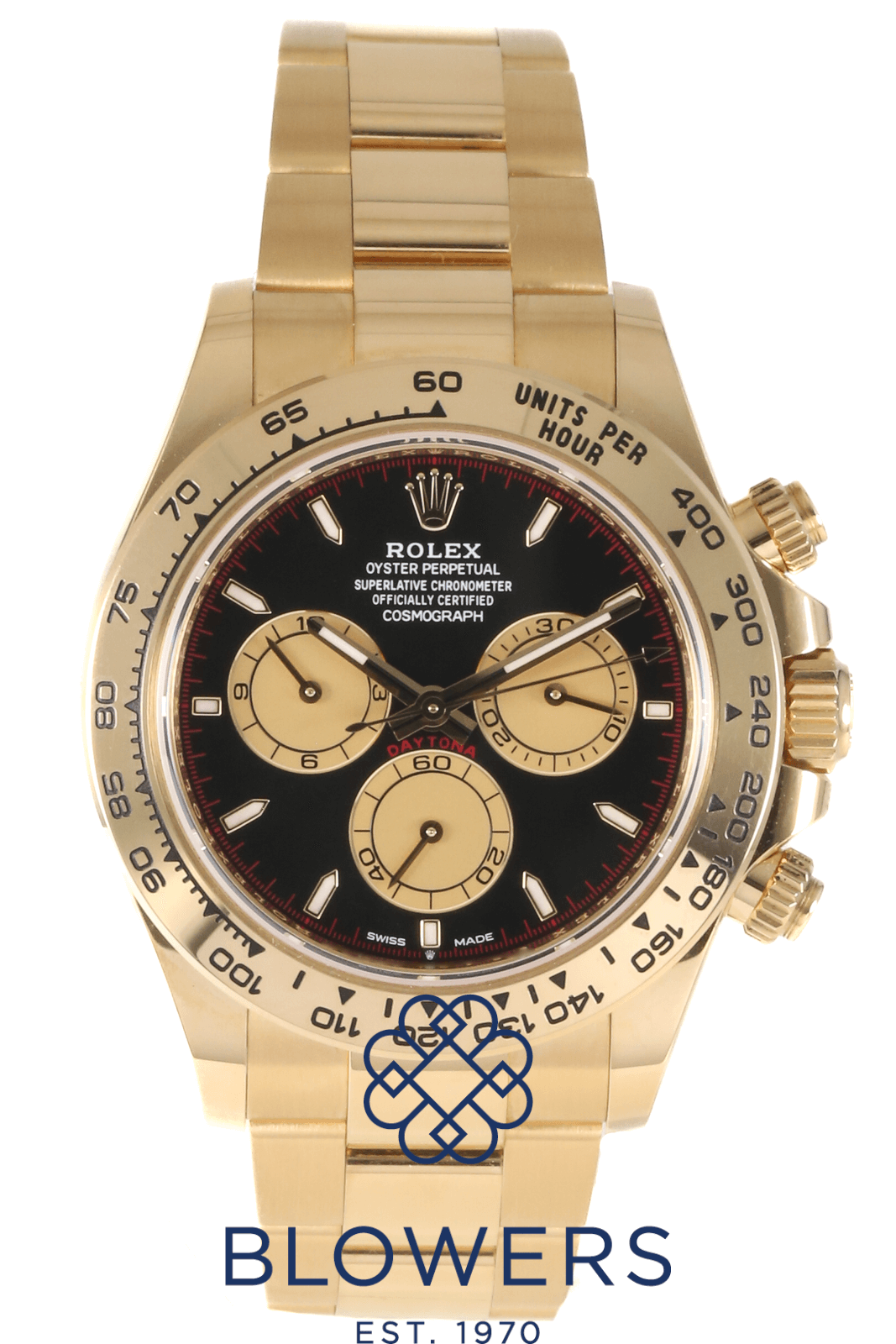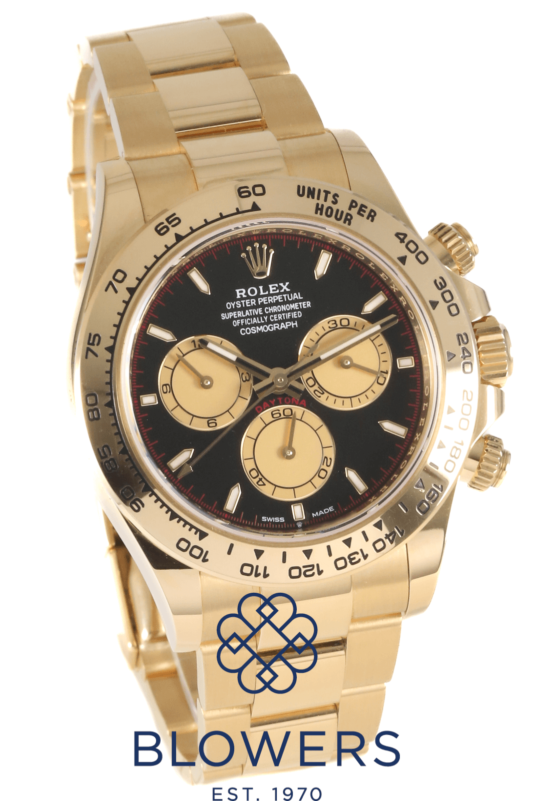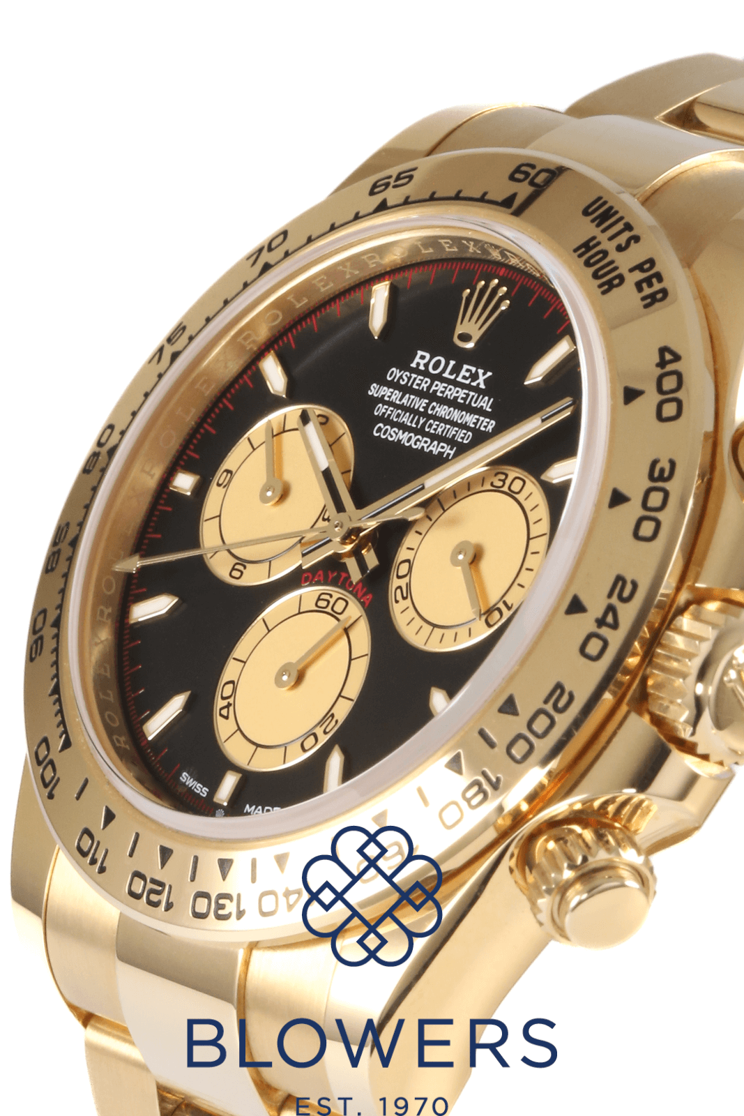 Rolex Oyster Perpetual Cosmograph Daytona 126508. 40mm 18ct Yellow Gold case. 4131 Automatic chronograph movement. Chronograph Paul Newman dial. Yellow gold sub-dials: small seconds, 30 minutes, 12 hours. Luminous index hour markers, Central luminous hours and minutes hands, Central seconds hand for chronograph function. Fixed 18ct yellow gold bezel with engraved tachymetric scale, On a 18ct Yellow Gold Oyster bracelet with a folding clasp. Box & Papers dated March 2024.