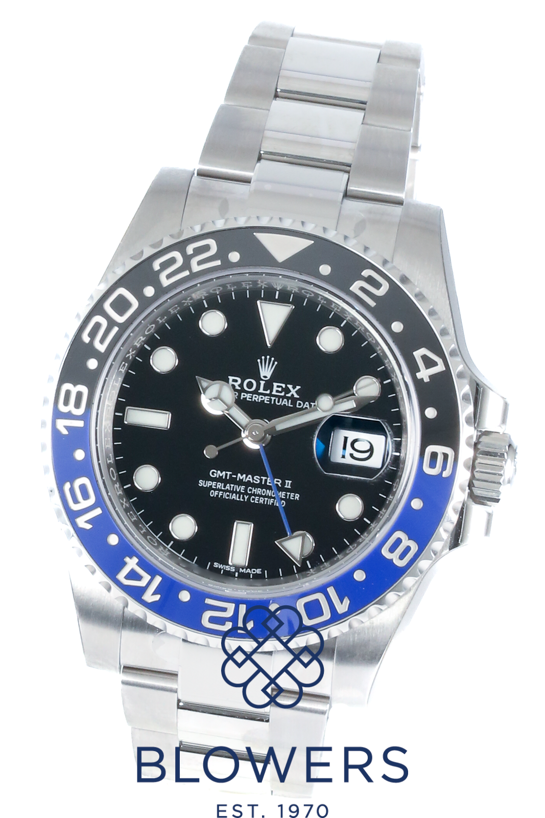 Rolex GMT-Master II 116710BLNR Full Factory Seals. Automatic Chronometer Movement. Polished And Brushed Steel Case, 40mm Diameter With Larger Winding Crown, Water Resistant To 100 Meters. Black Dial With Maxi Luminous Hour Markers And Luminous Hands. Black And Blue Ceramic Bi-Directional Bezel. Steel Oyster Lock Bracelet With Comfort Extension Link And Folding Clasp. Box and Papers Dated May 2017.
