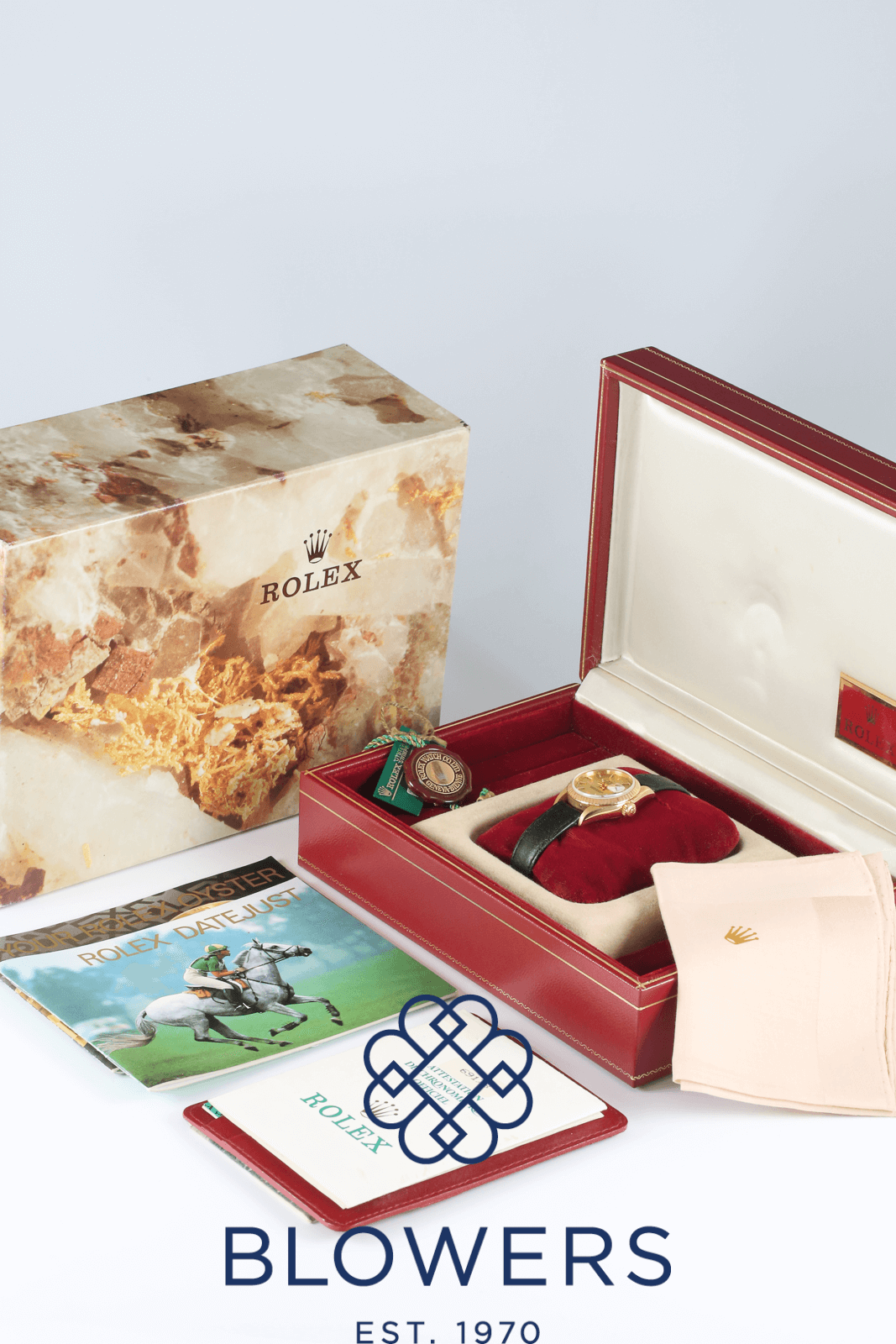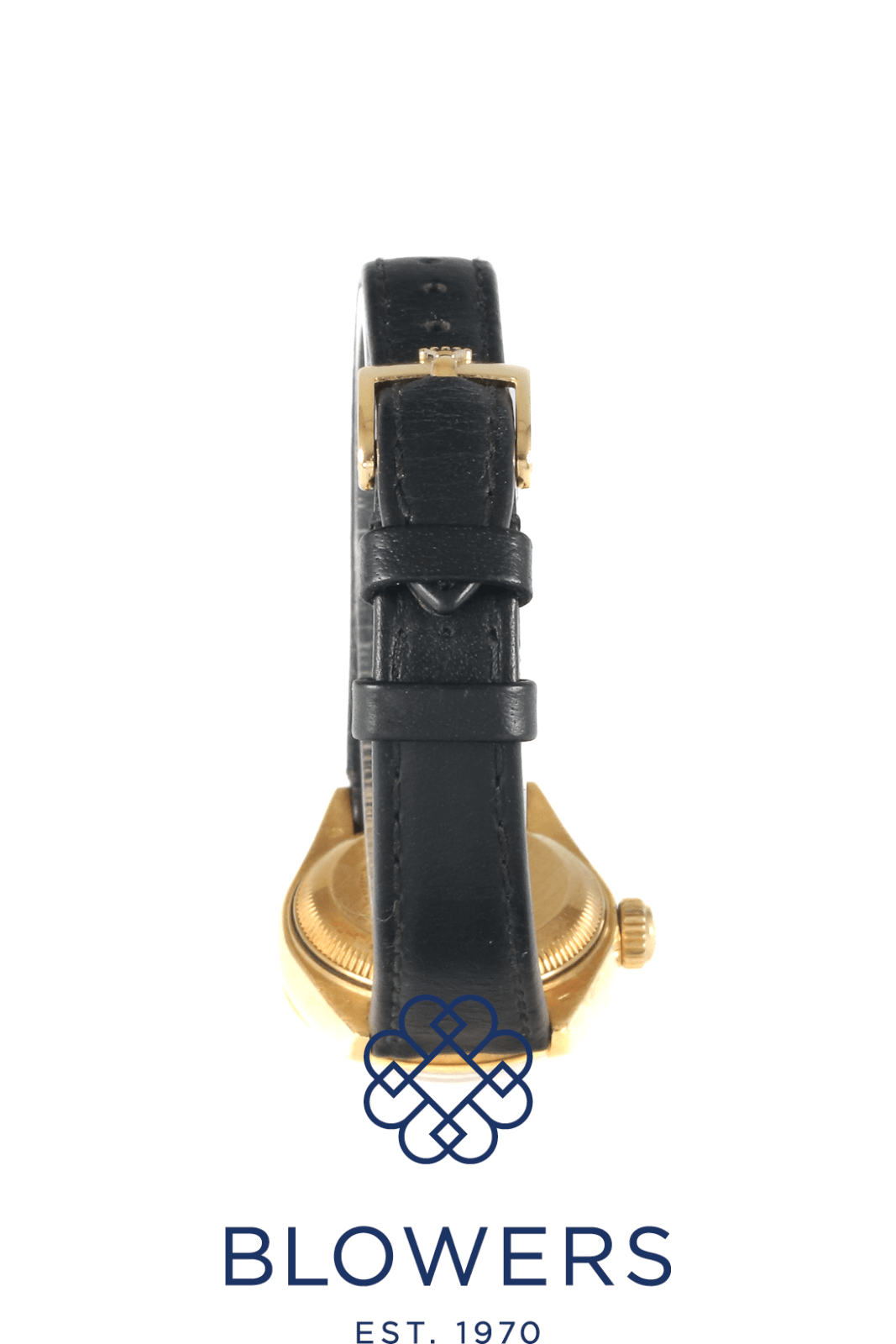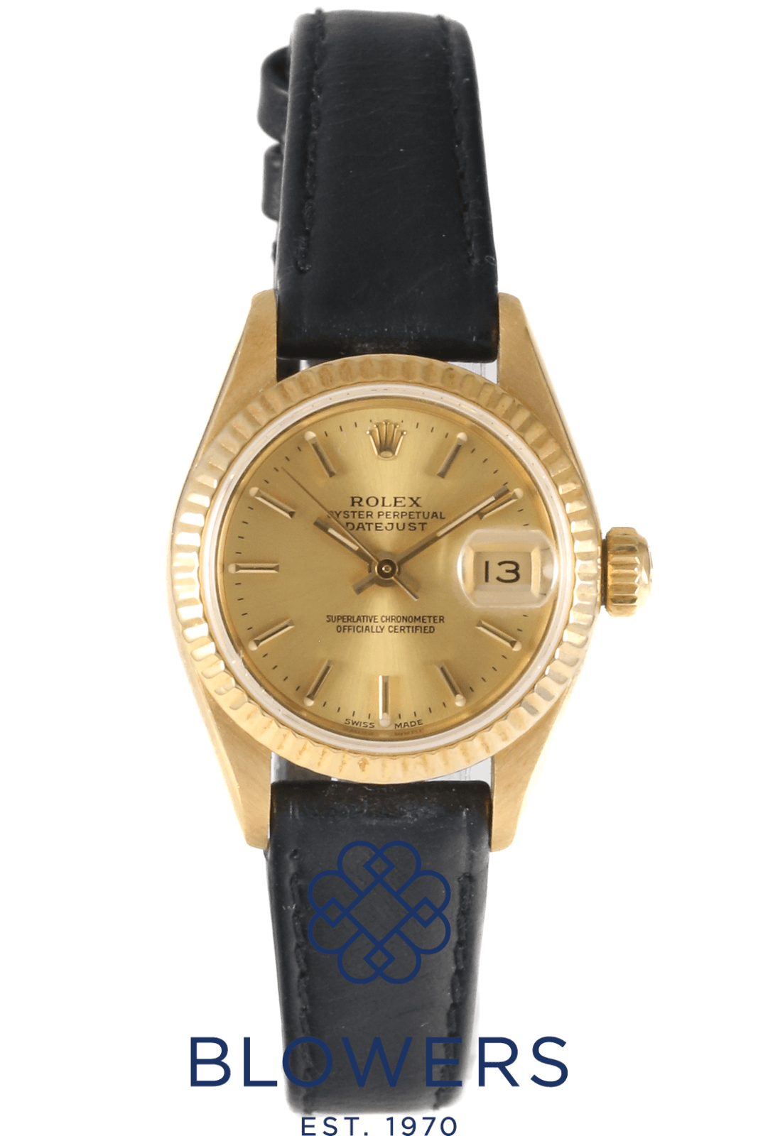 Rolex Lady-Datejust 69178. 18ct yellow gold 26mm diameter case with fluted bezel and screw-down crown, water resistant up to 100 metres. Self-winding chronometer-certified calibre 2135 movement with approximately 42-hour power reserve. Champagne dial with applied gold baton hour markers and gold hands. Central hours, minutes, and seconds hands. Date window located at the 3 o’clock position with readability enhanced by the Cyclops lens. Scratch-resistant sapphire crystal glass. Fitted to a Rolex brown leather strap with 18ct yellow gold Rolex tang buckle. Box and papers dated February 1993.