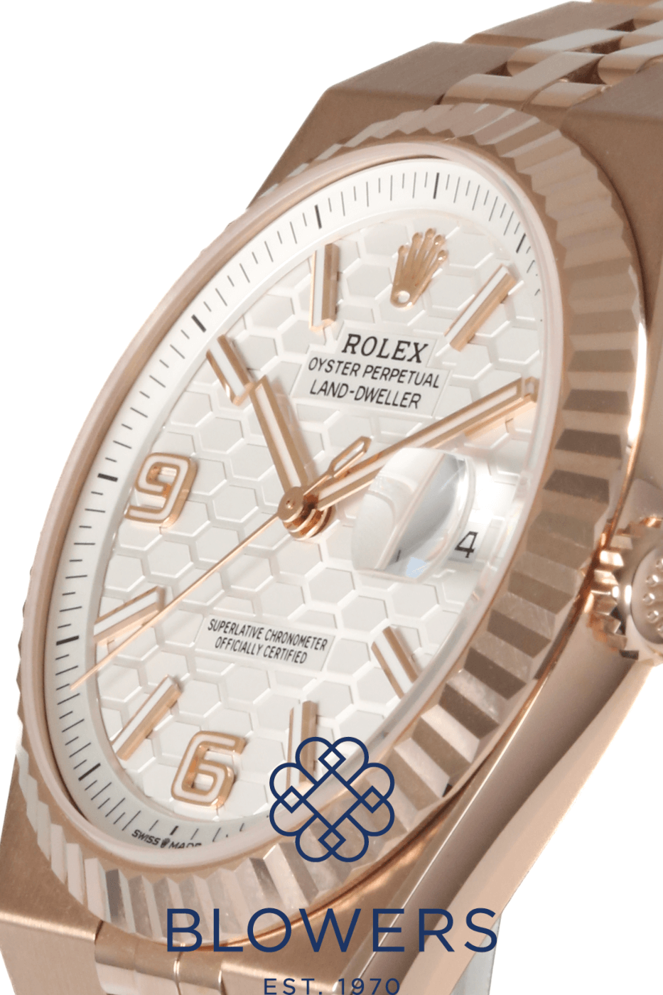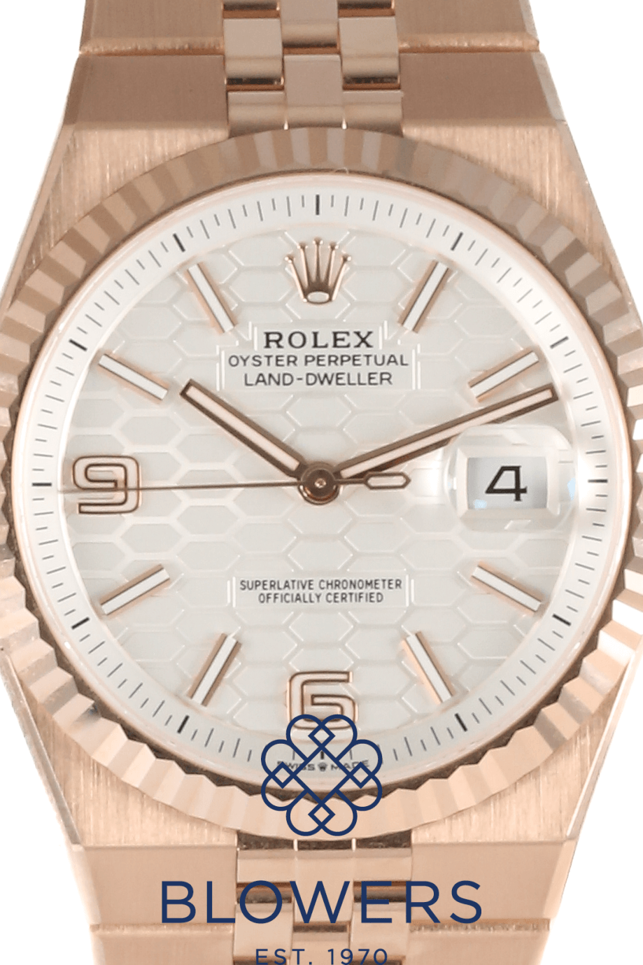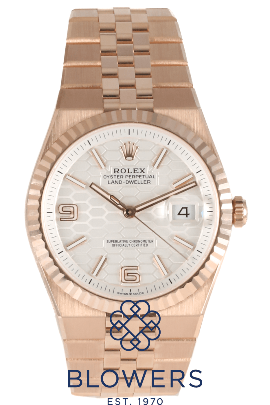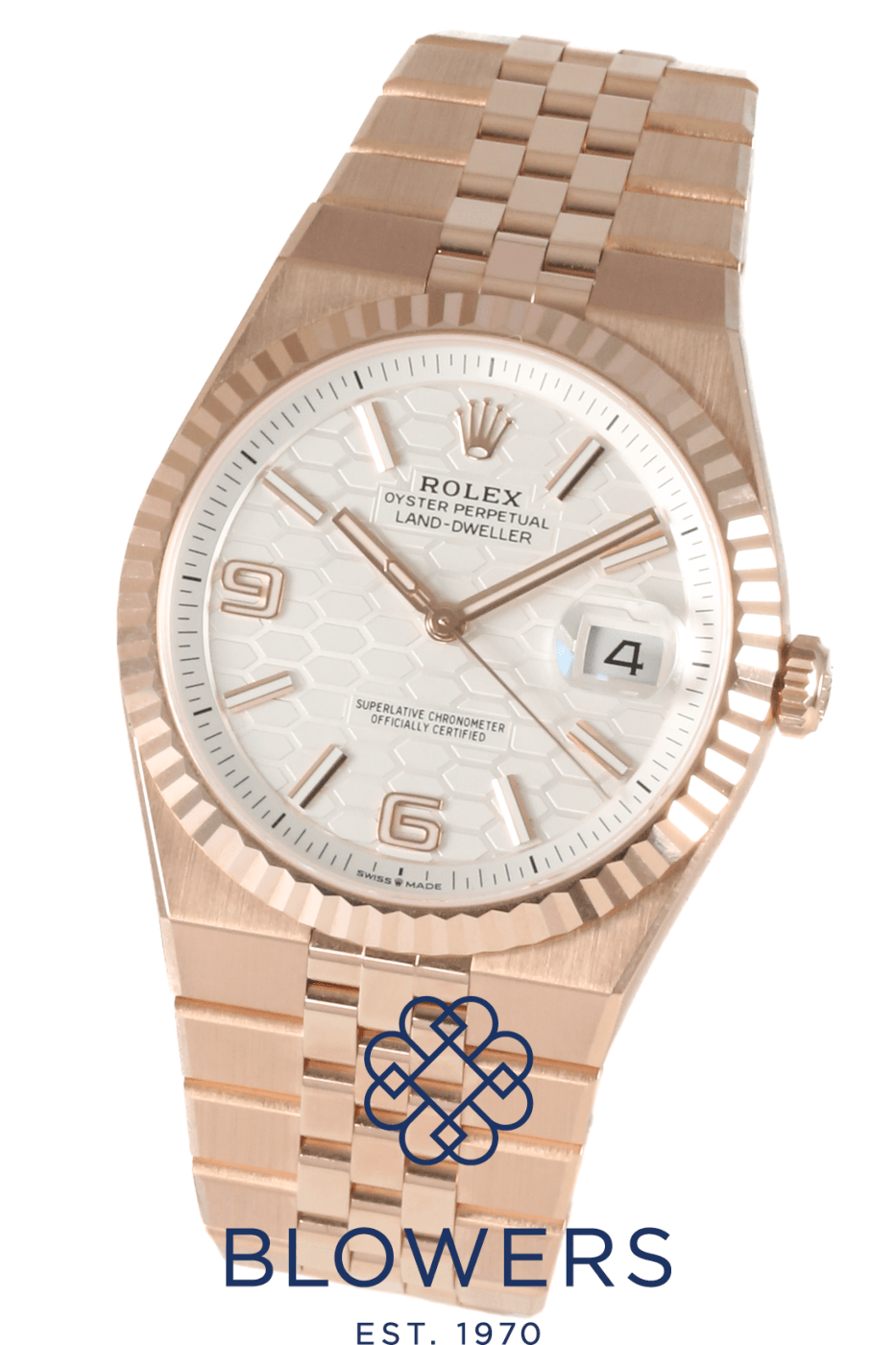 Rolex Land-Dweller 40mm 127335. 18ct Everose gold 40mm diameter case with screw-down crown, water resistant up to 100 metres. Self-winding superlative chronometer calibre 7135 movement, with a 66 hour power reserve. Fluted bezel in 18ct Everose gold. White dial with honeycomb motif, applied baton hour markers and luminescent hands. Central hours, minutes and seconds hands. Sapphire crystal glass. Date window located at the 3 o’clock position with cyclops lens for enhanced readability. 18ct Everose gold Flat Jubilee bracelet with concealed folding Crownclasp. Box and papers dated October 2025.