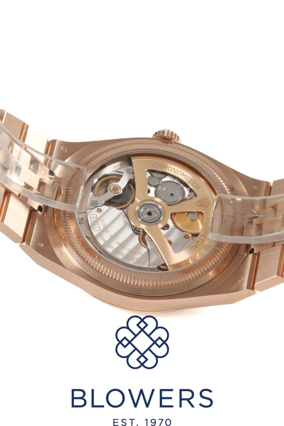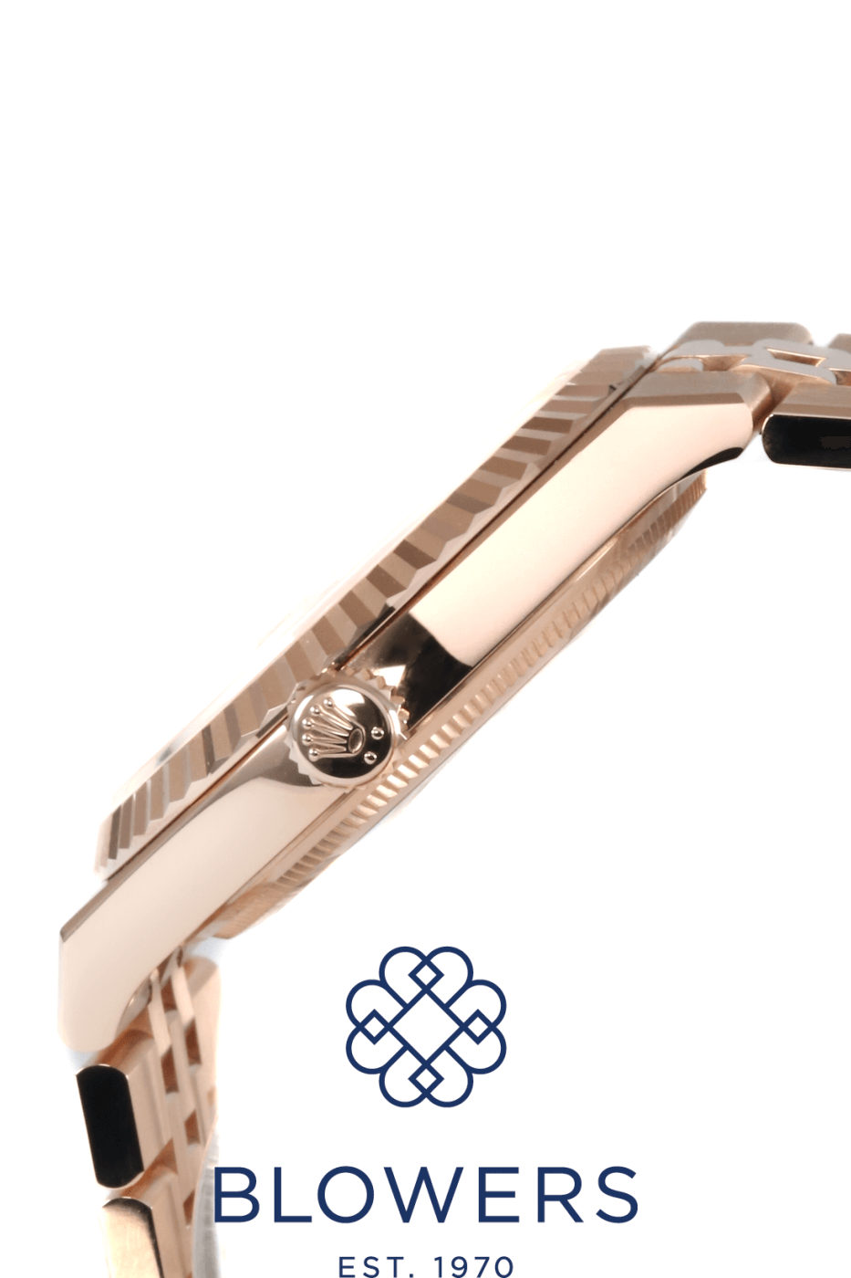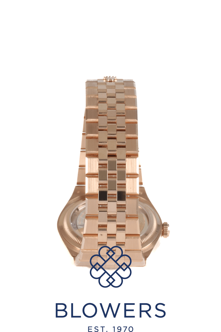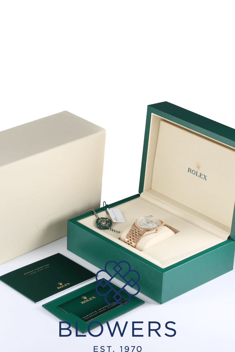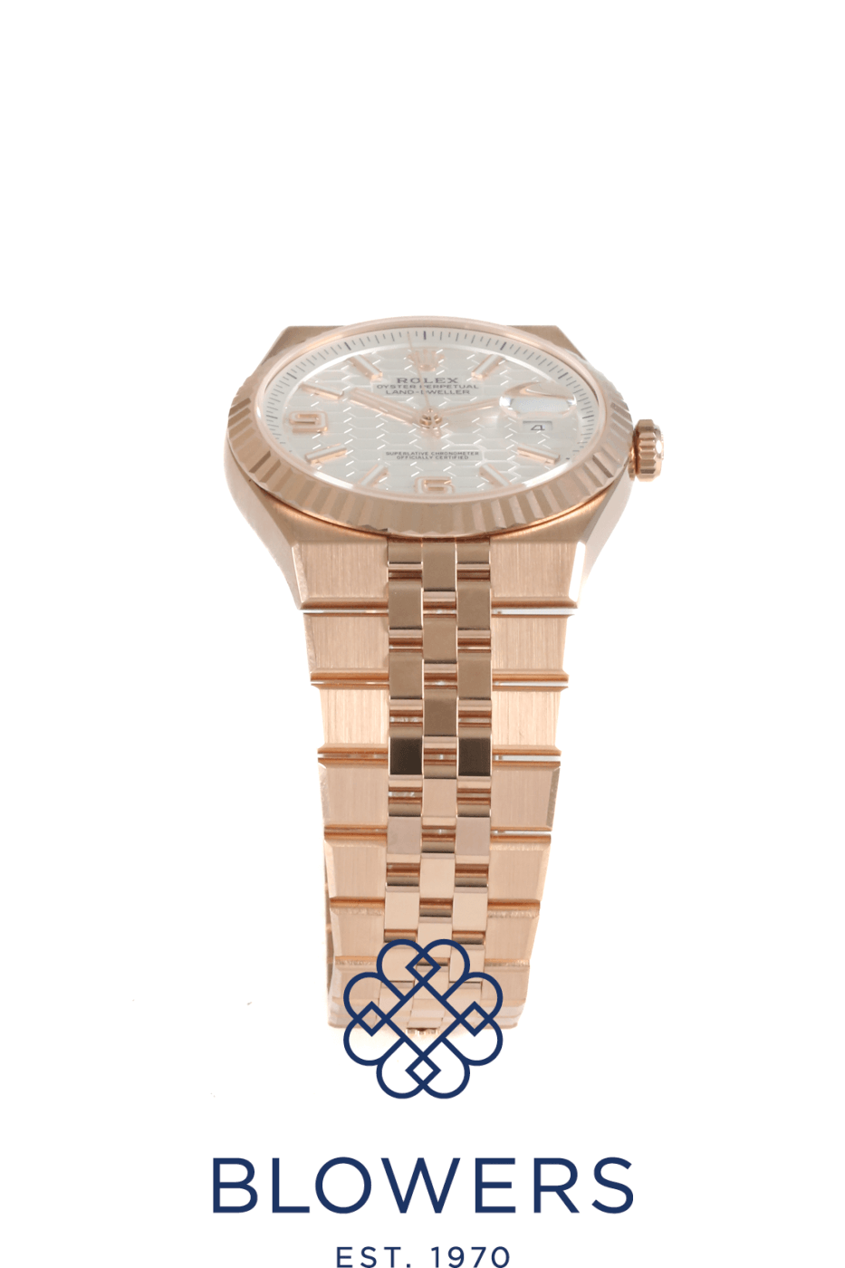 Rolex Land-Dweller 40mm 127335. 18ct Everose gold 40mm diameter case with screw-down crown, water resistant up to 100 metres. Self-winding superlative chronometer calibre 7135 movement, with a 66 hour power reserve. Fluted bezel in 18ct Everose gold. White dial with honeycomb motif, applied baton hour markers and luminescent hands. Central hours, minutes and seconds hands. Sapphire crystal glass. Date window located at the 3 o’clock position with cyclops lens for enhanced readability. 18ct Everose gold Flat Jubilee bracelet with concealed folding Crownclasp. Box and papers dated October 2025.