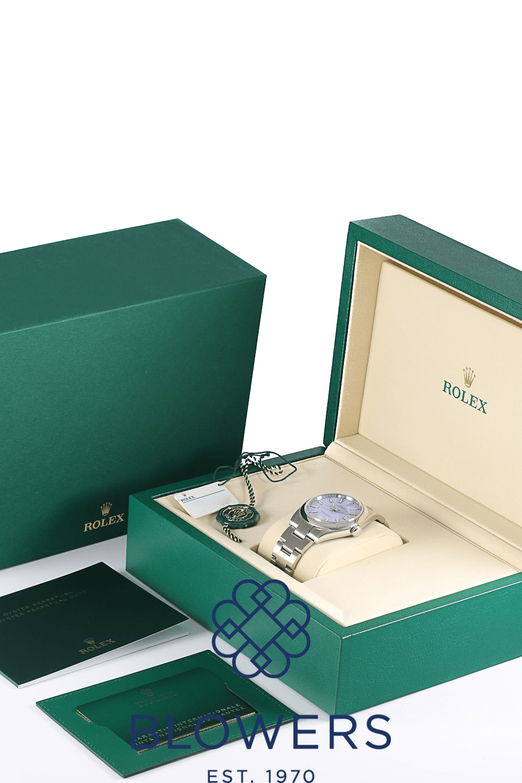 Rolex Oyster Perpetual 134300. Water resistant to 100 meters. 41mm steel casing, housing an automatic calibre 3230 movement: 31 jewels, a power reserve of 70 hours. Featuring new release lilac dial, with luminous baton hour markers and hands for chromalight display. Black outer minutes track. Steel oyster bracelet, with a folding clasp and safety catch. Complete with its box and papers, dated 2026.