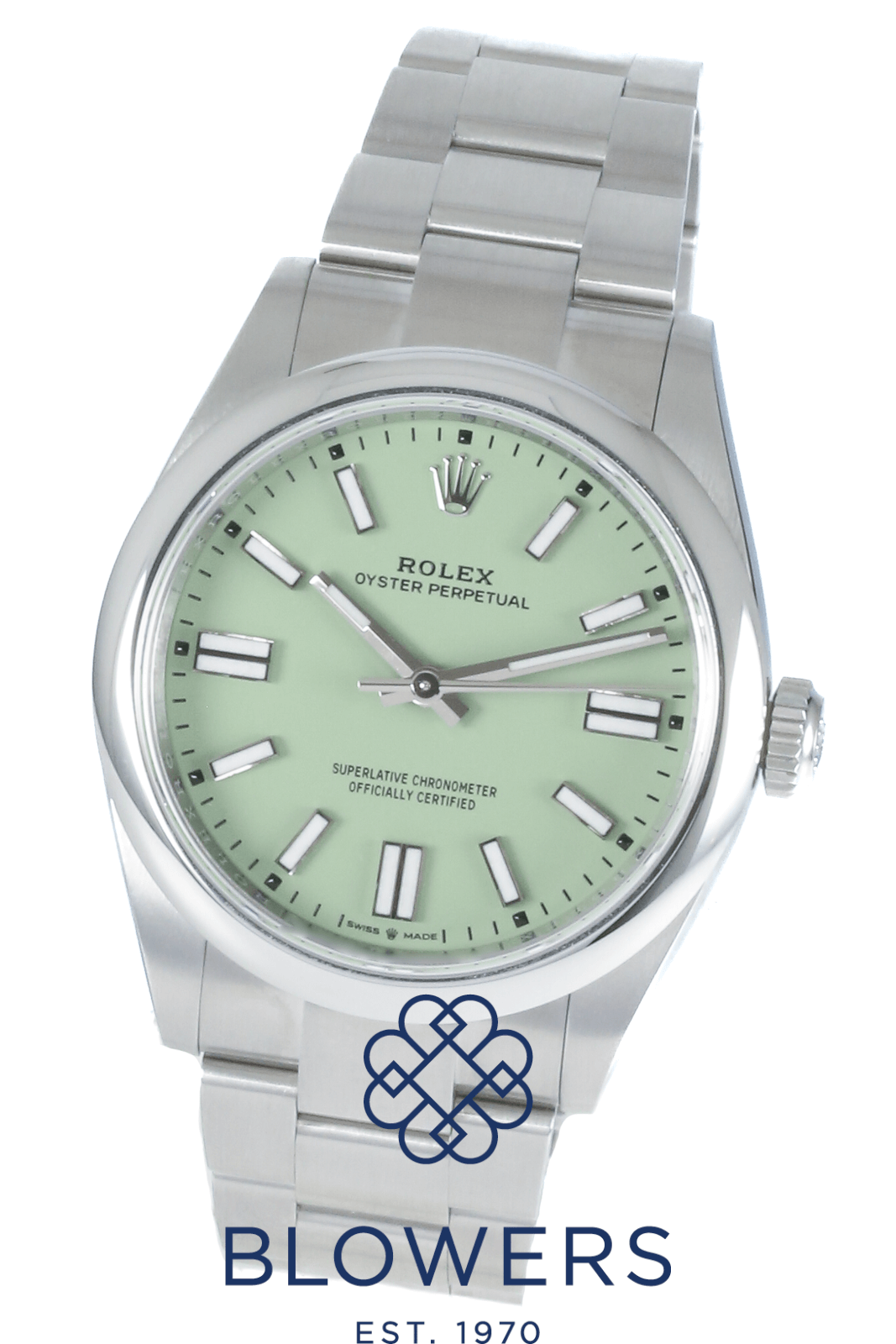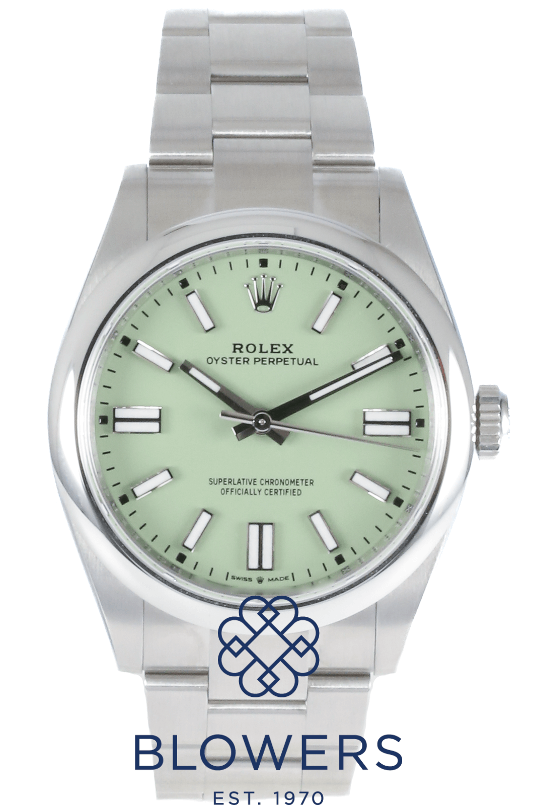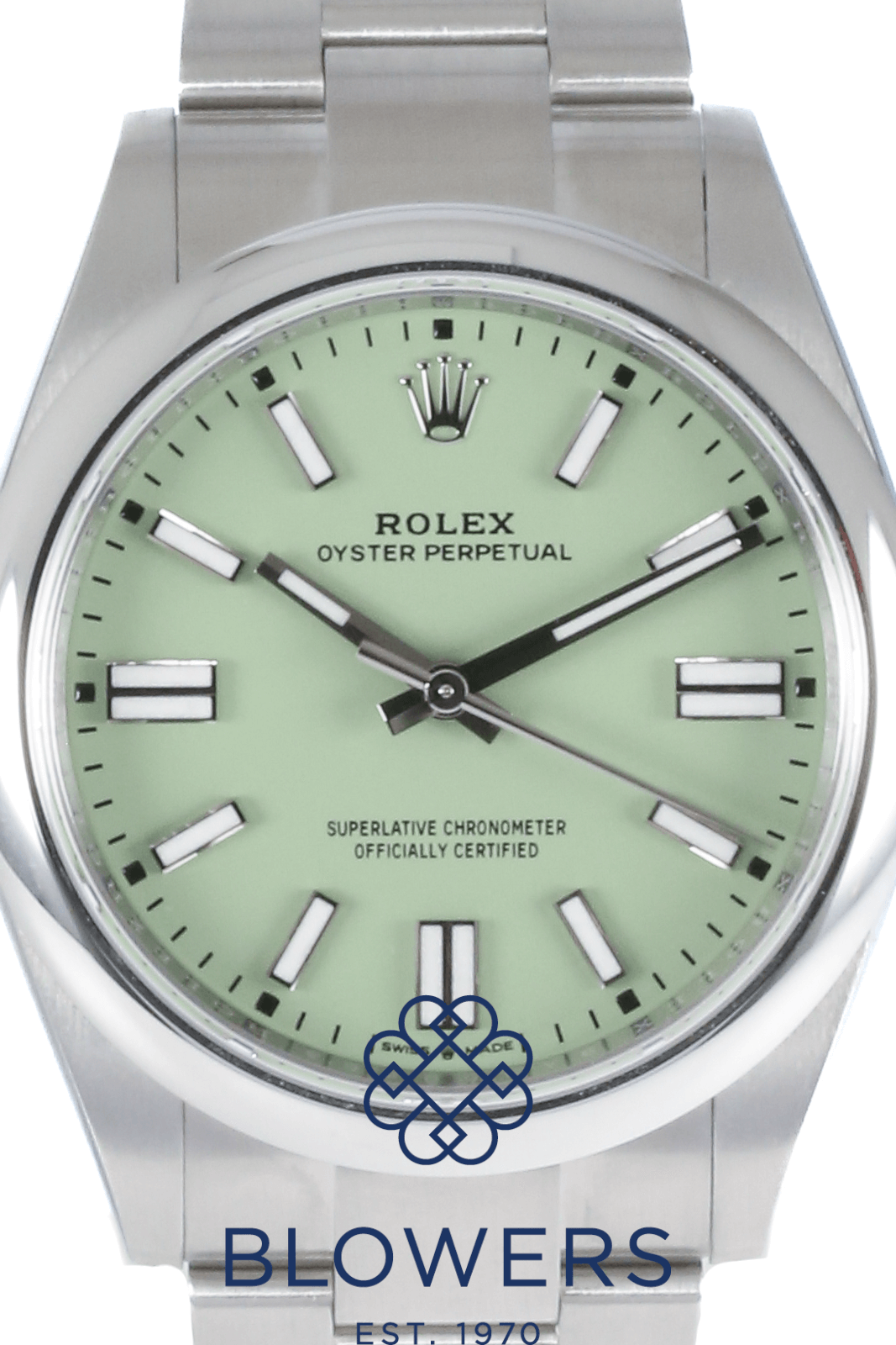 Rolex Oyster Perpetual 134300. Steel 41mm case, domed bezel. Automatic, Rolex Caliber 3230. Water resistant up to 100 metres. Green “Pistachio” dial, baton hour markers with Chromalight, power reserve of approx. 70 hours. On a Steel Oyster bracelet with folding Oysterclasp with Easylink comfort extension link. Box and Papers dated December 2025.