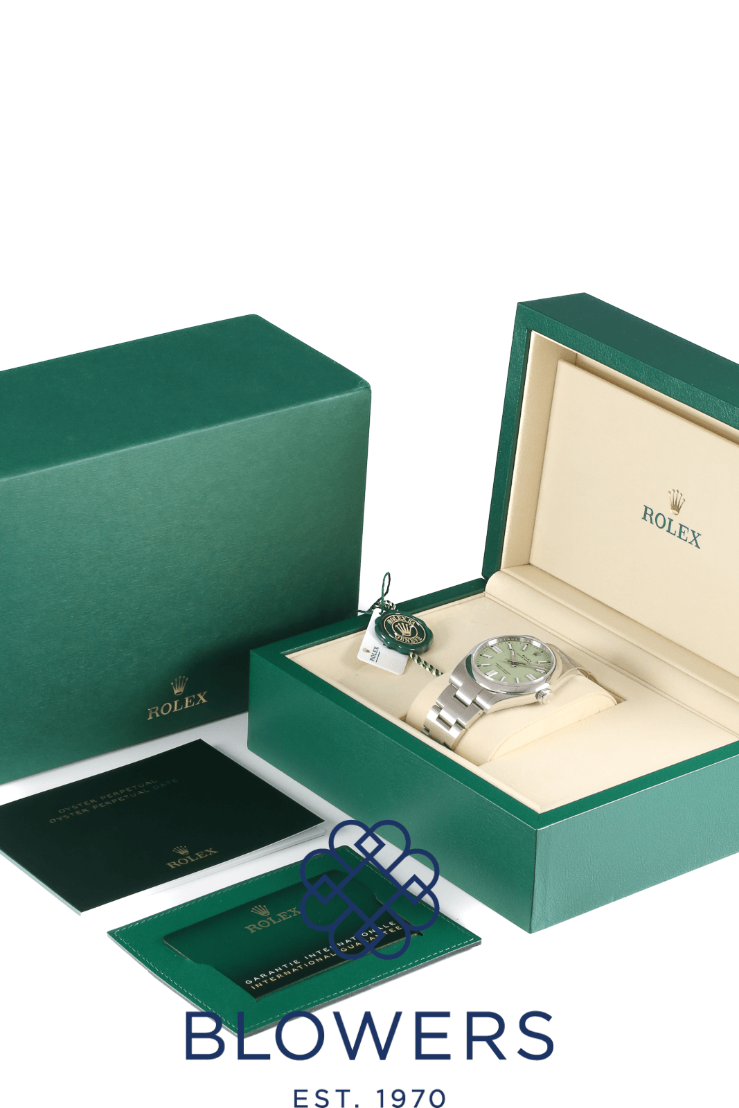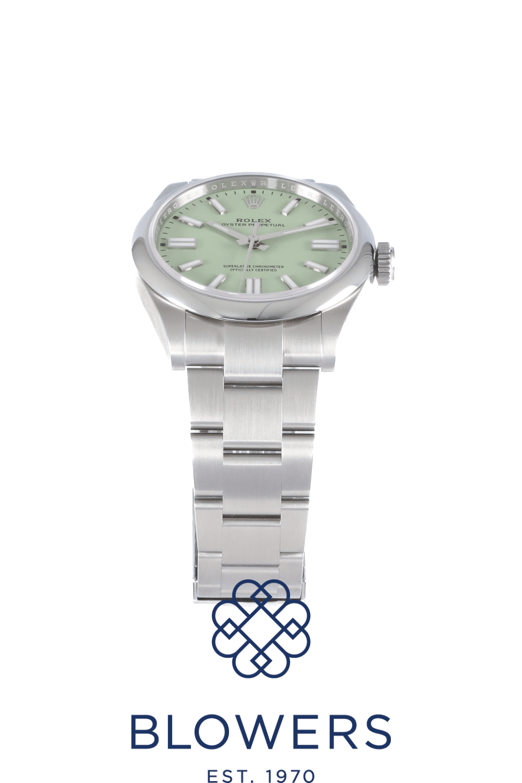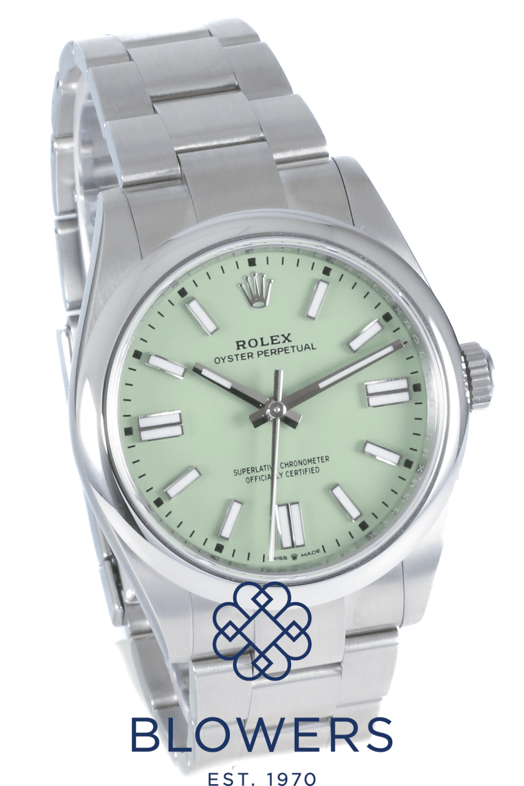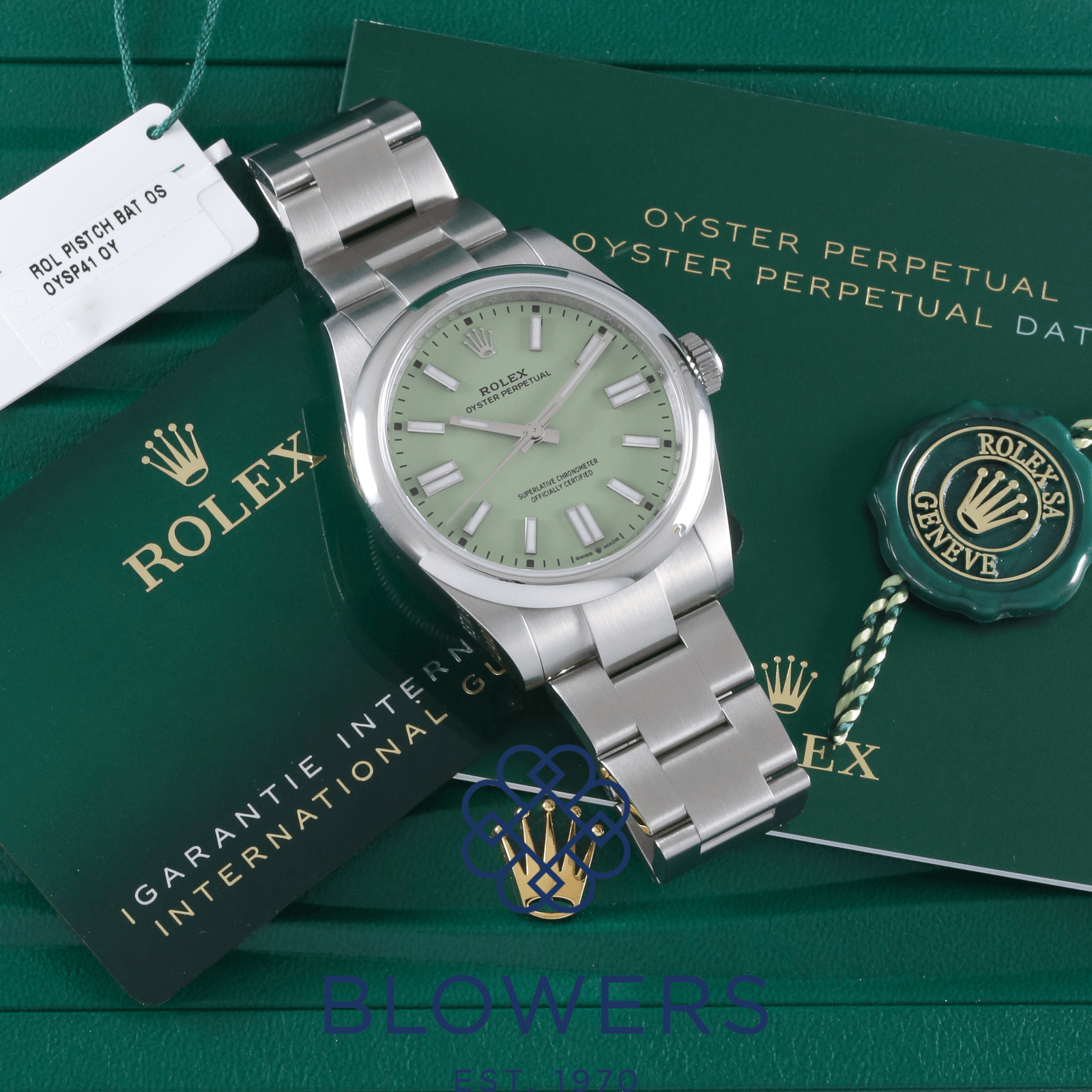 Rolex Oyster Perpetual 134300. Steel 41mm case, domed bezel. Automatic, Rolex Caliber 3230. Water resistant up to 100 metres. Green “Pistachio” dial, baton hour markers with Chromalight, power reserve of approx. 70 hours. On a Steel Oyster bracelet with folding Oysterclasp with Easylink comfort extension link. Box and Papers dated December 2025.
