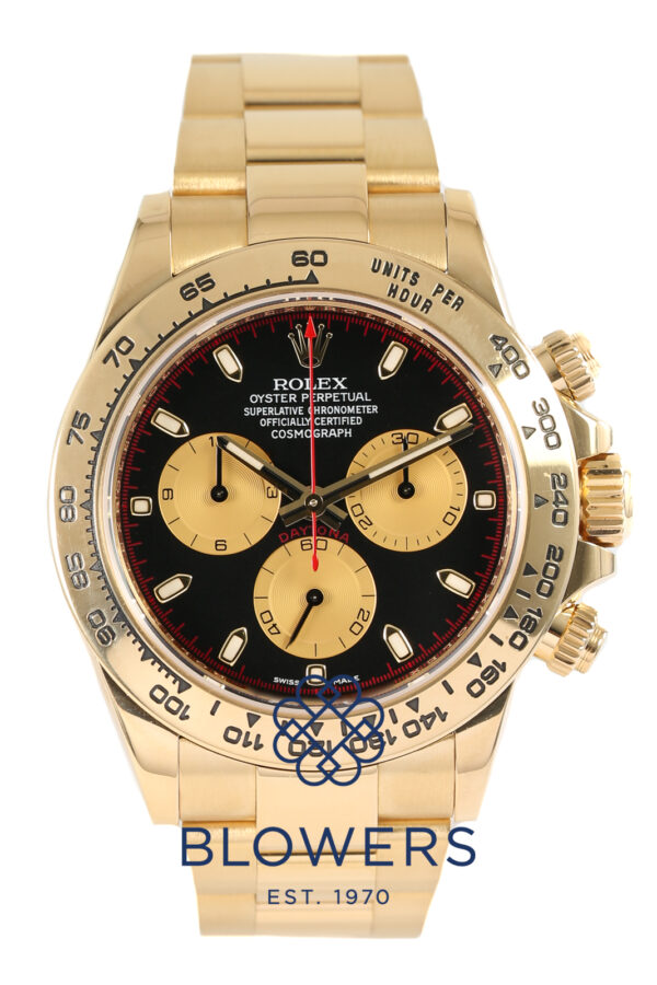 Rolex Oyster Perpetual Cosmograph Daytona 116508. 18ct Yellow Gold 40mm Case. Yellow Gold Polished Case With Matte Shoulders. Automatic Chronometer Chronograph Movement, Rolex Caliber 4130 Power Reserve 72 Hours. Black Dial gold sub-dials and Applied Index Hour Markers And Outer Track Minute Markers. Screw Down Winding Crown And Push Pieces. 18ct Yellow Gold Polished And Matte Oyster Lock Bracelet. Box and Papers Dated August 2019.