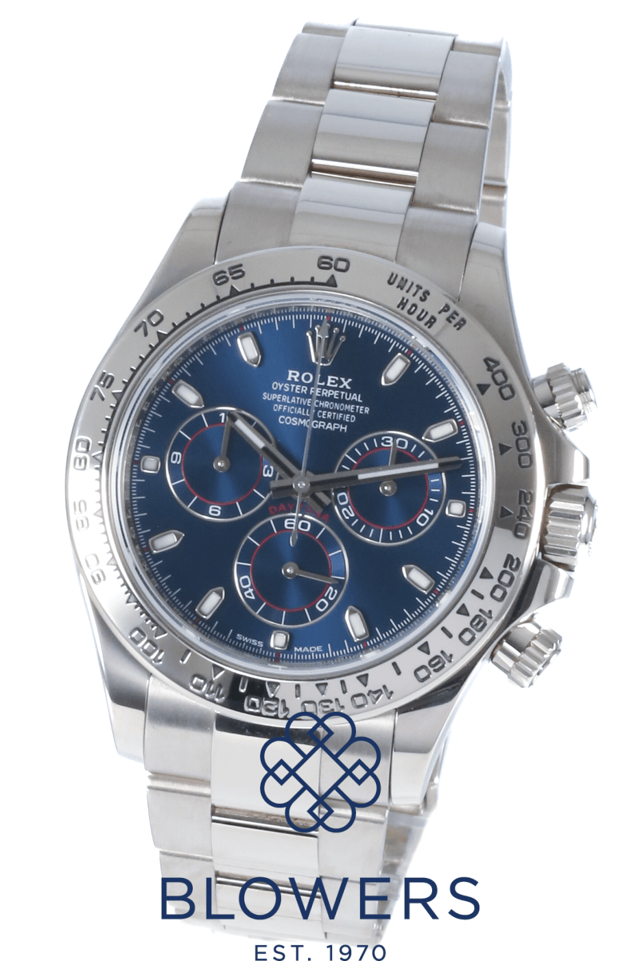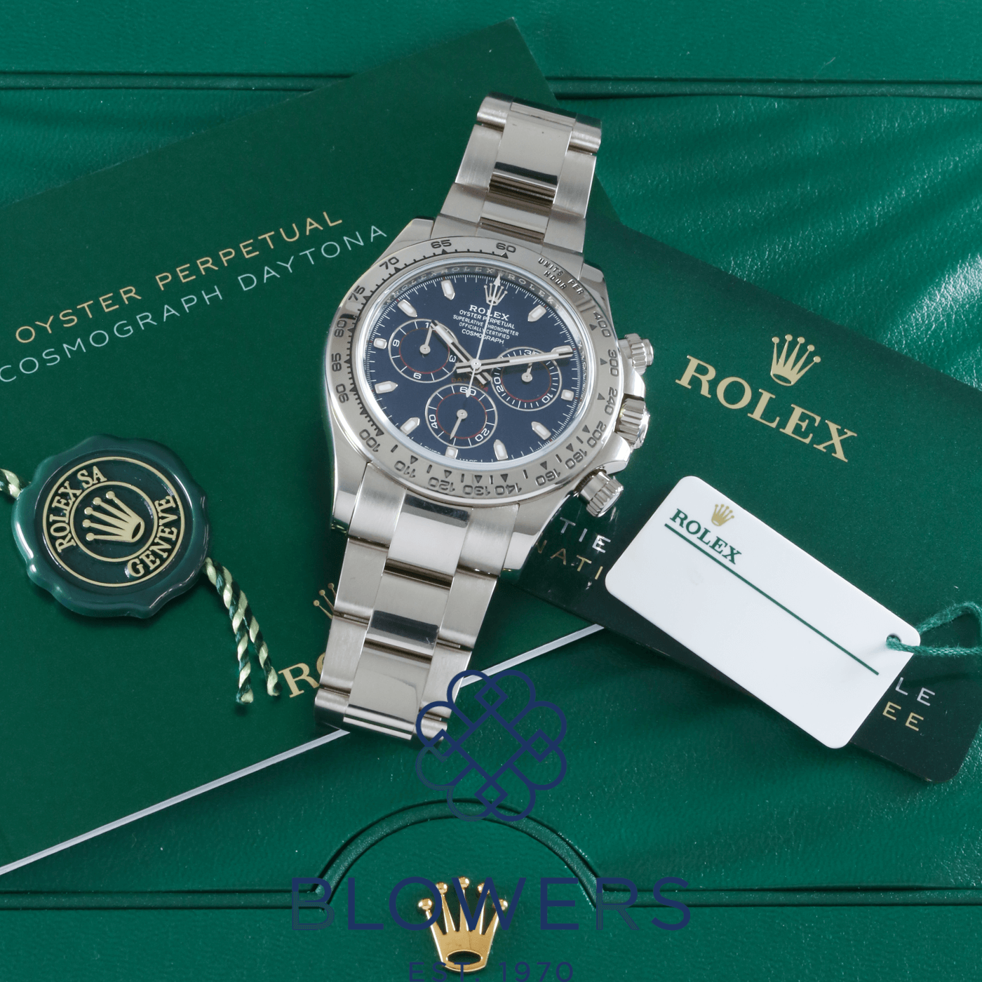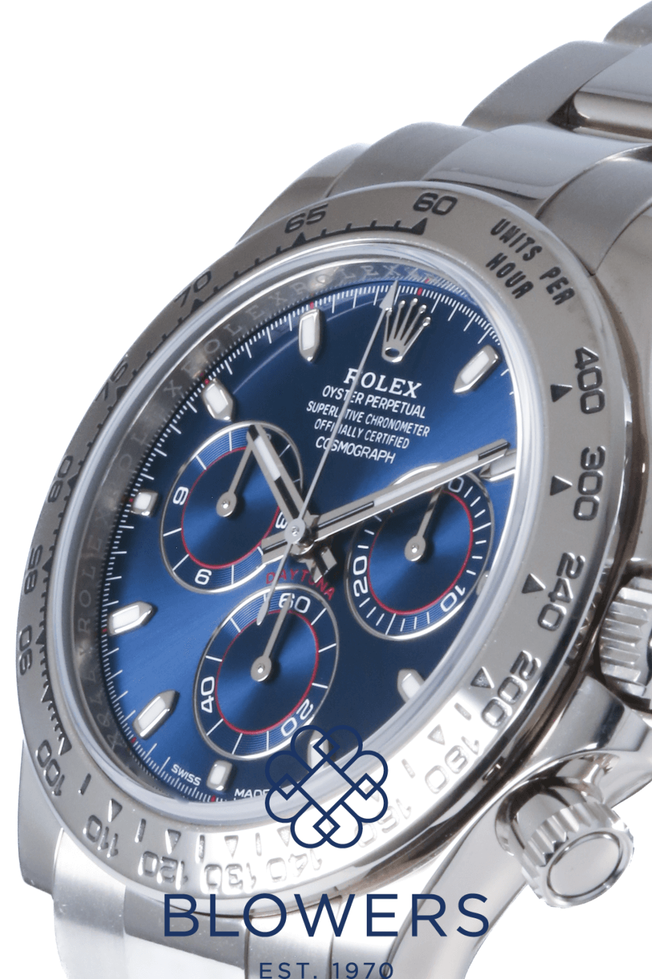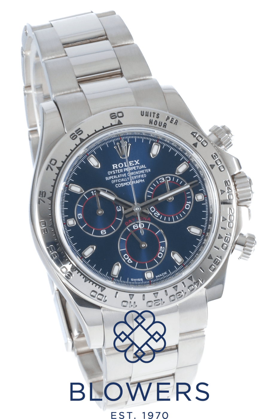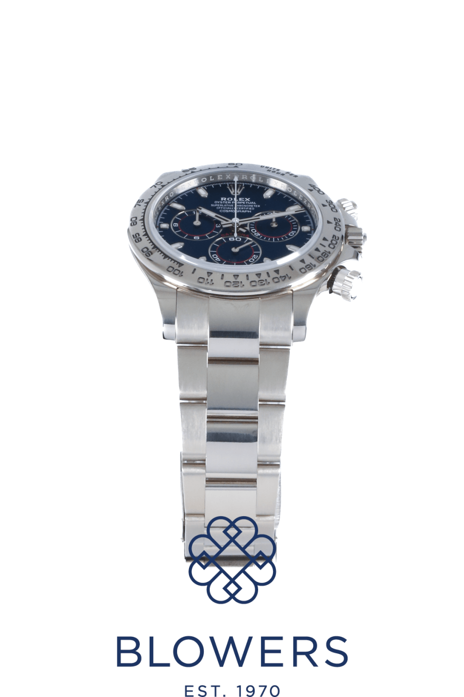 Rolex Oyster Perpetual Cosmograph Daytona 116509. 18ct White Gold Case, 40mm. Automatic Chronometer Movement. Blue Dial With Luminous Arabic Hour Markers. Polished Tachymeter Bezel. 18ct White Gold Bracelet With White Gold Folding Safety Clasp. Box and papers dated January 2022.