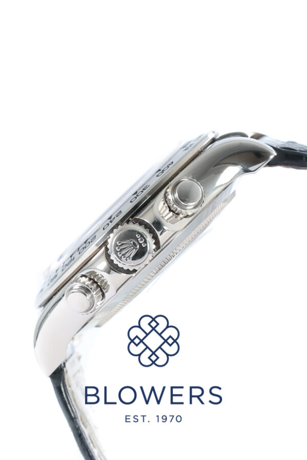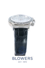 Rolex Oyster Perpetual Cosmograph Daytona 116519. 40mm case diameter. Water resistant to 100 metres. Automatic chronometer movement. Mother of pearl dial with diamond hour markers. Polished tachymeter bezel. Black croc strap with white gold folding safety clasp. Box and papers dated December 2011. Rolex service papers dated August 2017.