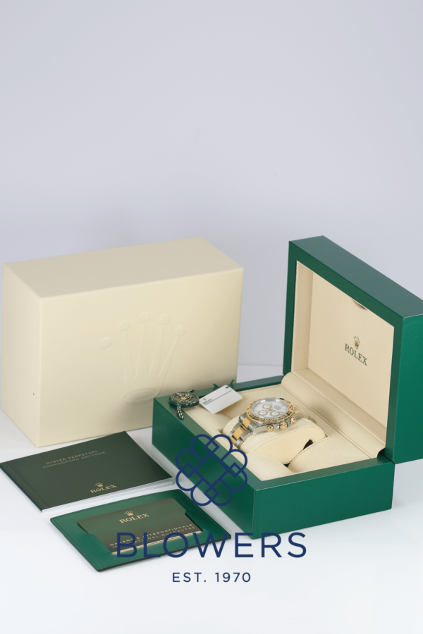Rolex Oyster Perpetual Cosmograph Daytona 126503. 40mm diameter steel and yellow gold case, which is water resistant to 100 meters. Housing an automatic movement of 44 jewels, the Rolex 4130 calibre movement features a power reserve of 72 hours. Surrounded by a fixed, yellow gold tachymetric scale bezel with a Black 10 Diamond Set dial. The central chronograph hand is accompanied by three sub-dials: a 60 seconds sub-dial, a 30 minutes sub-dial and a 12 hours sub-dial. Steel and yellow gold oyster bracelet, with a folding clasp and safety catch. Complete with its box and papers dated March 2021.