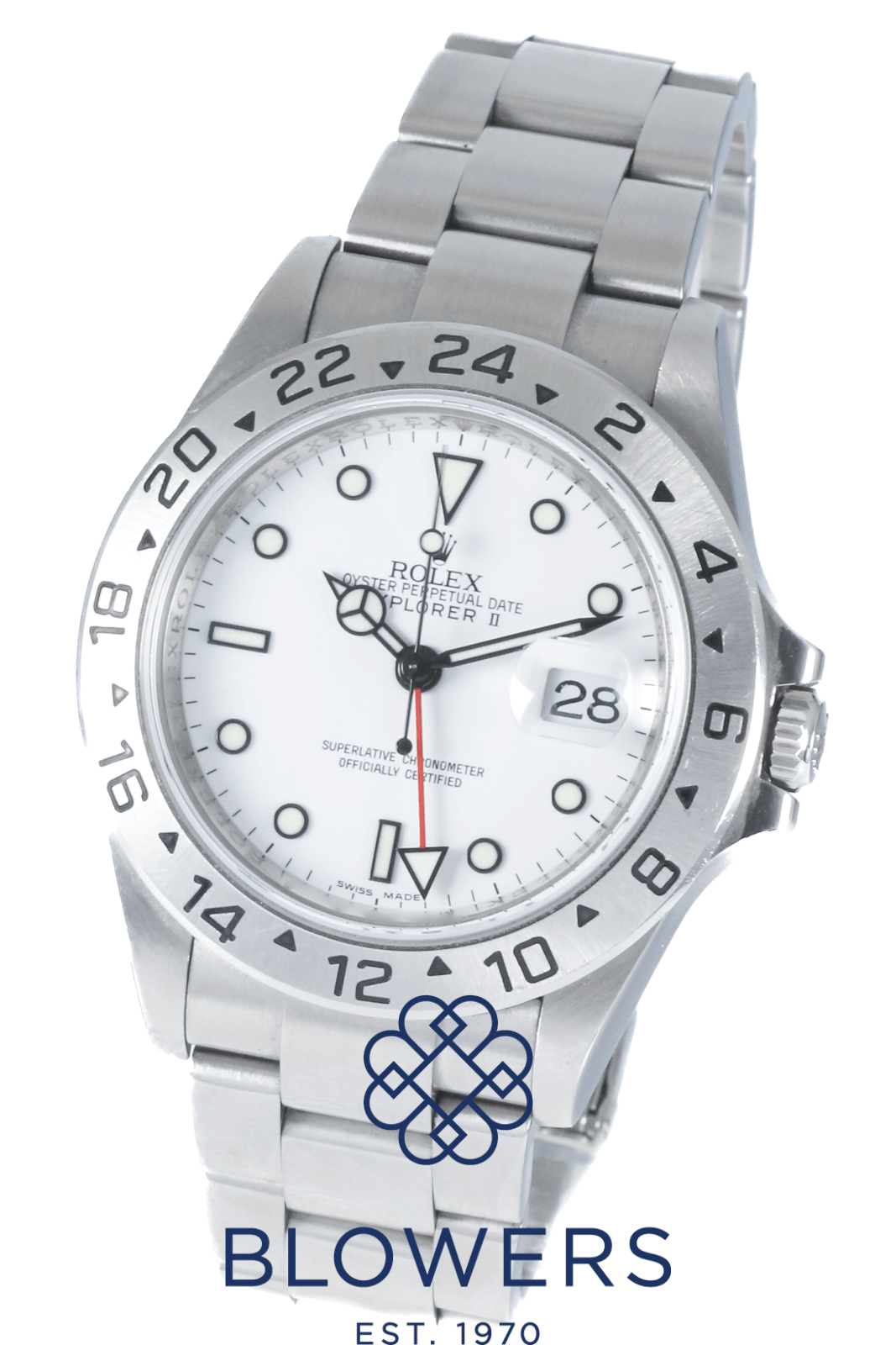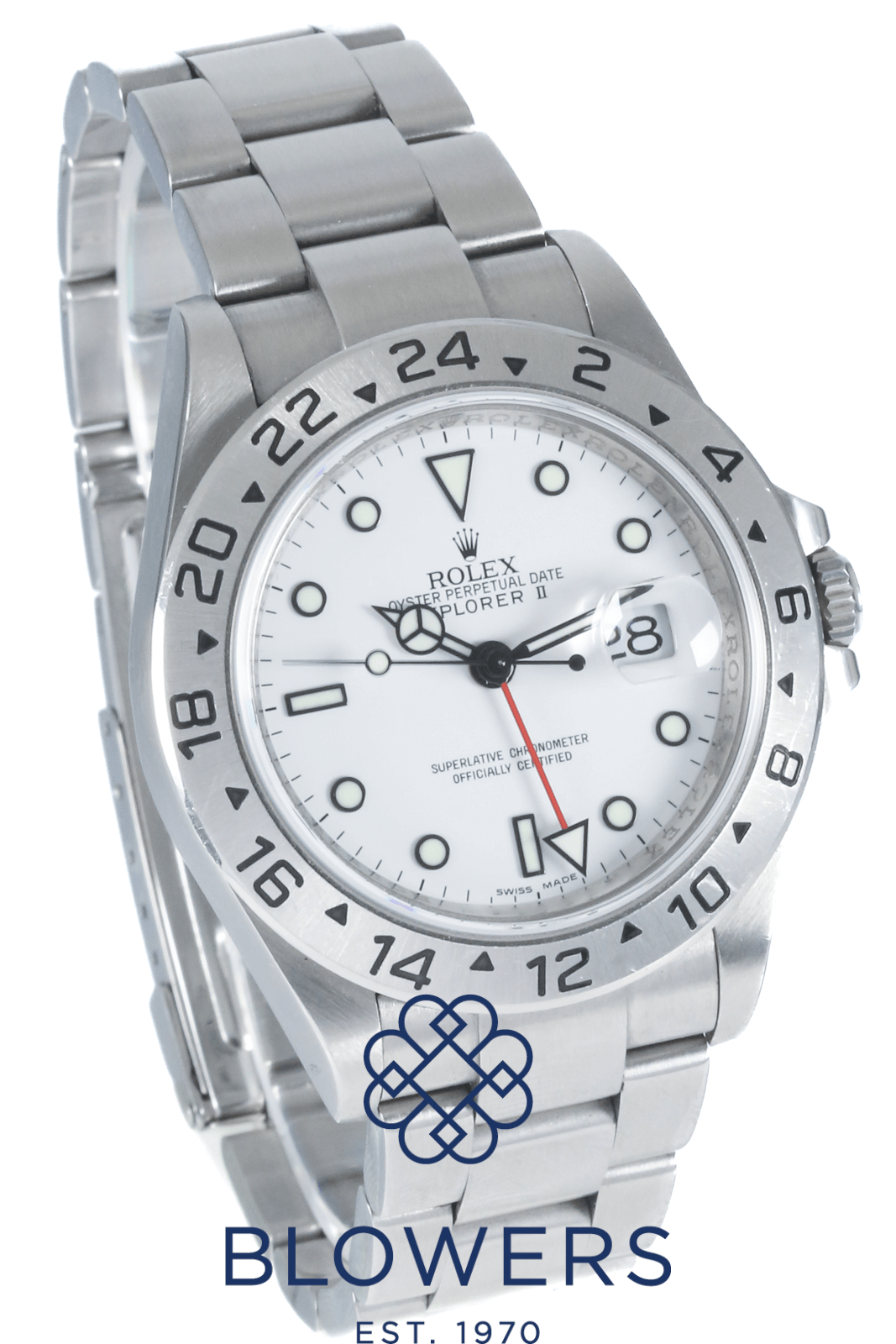 Rolex Explorer II 16570 “Polar” White Dial. Stainless steel 40mm diameter case with screw-down Twinlock crown, water resistant up to 100 metres. Self-winding superlative chronometer 3186 calibre “wiggle test” movement with a 50-hour power reserve. Fixed 24-hour graduated stainless steel bezel. White “Polar” dial with black-outlined luminescent hour markers and hands. Red 24-hour GMT hand for dual time zone display. Central hours, minutes, seconds, and 24-hour hands. Sapphire crystal glass. Date window located at the 3 o’clock position with readability enhanced by the Cyclops lens. Stainless steel Oyster bracelet with folding Oysterlock clasp. Box and papers dated September 2008. Rolex service papers dated August 2016.