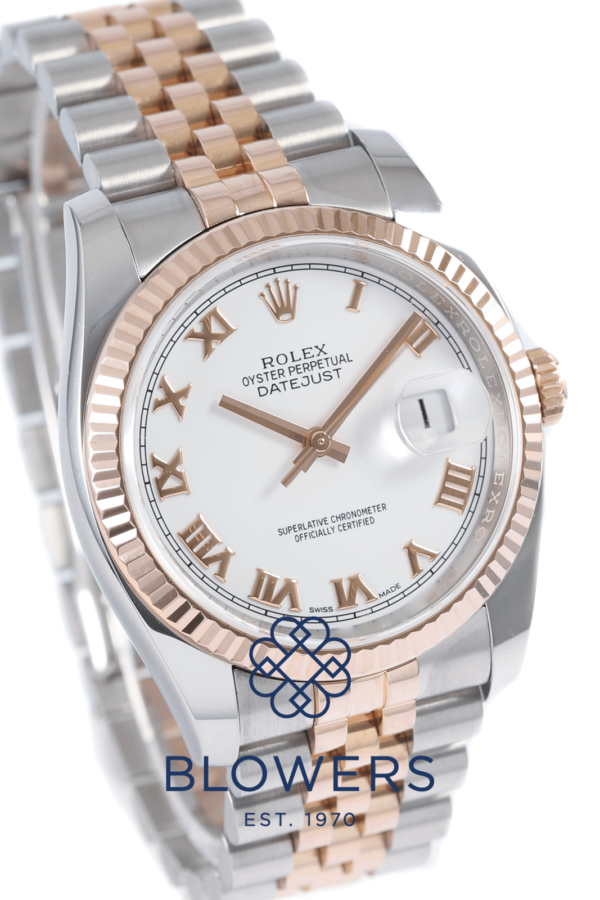 Rolex Oyster Perpetual Datejust 116231. Polished Steel 36mm Case Water Resistant To 100 Meters. Automatic Chronometer Movement. White Dial With Roman Numeral Hour Markers. Rose Gold Fluted Bezel. Steel and Rose Gold Bi Metal Jubilee Bracelet With Concealed Crown Clasp. Box and Papers dated May 2017. Box and Papers dated May 2017.