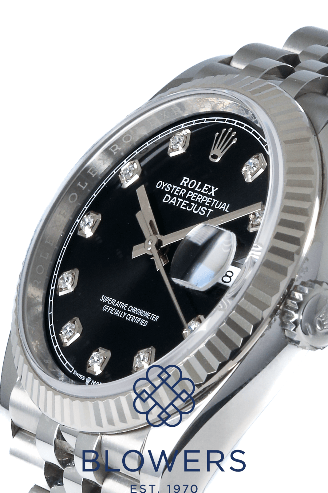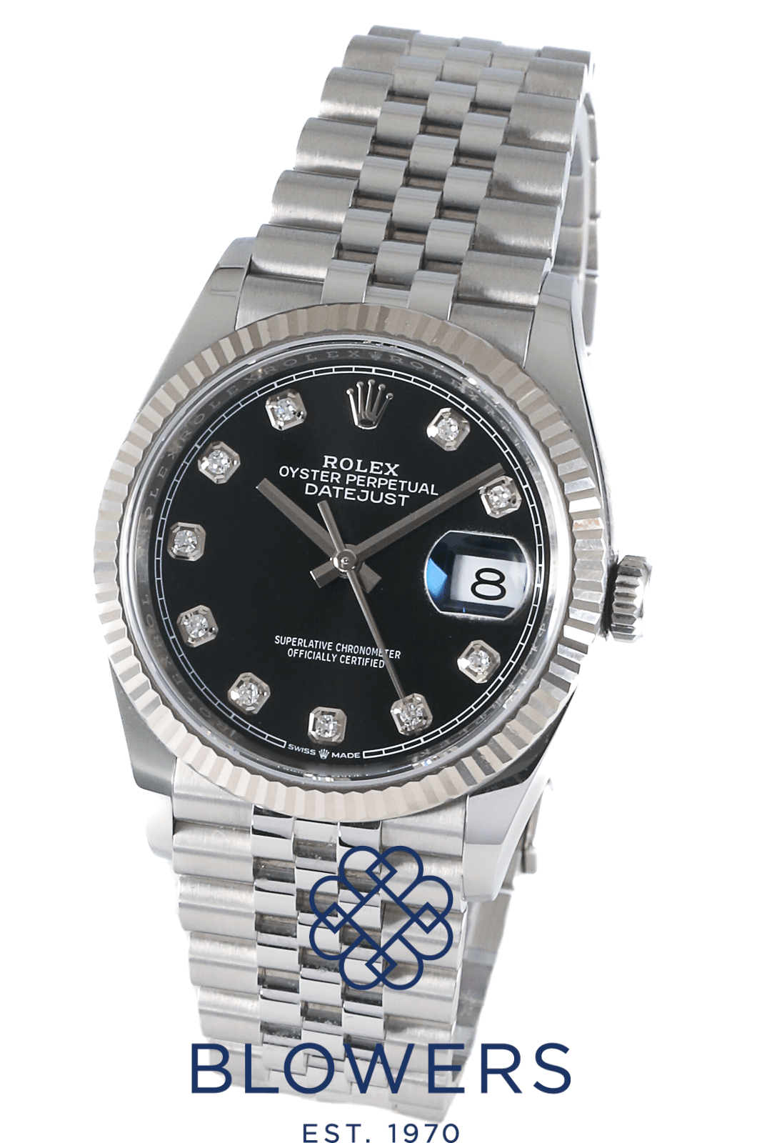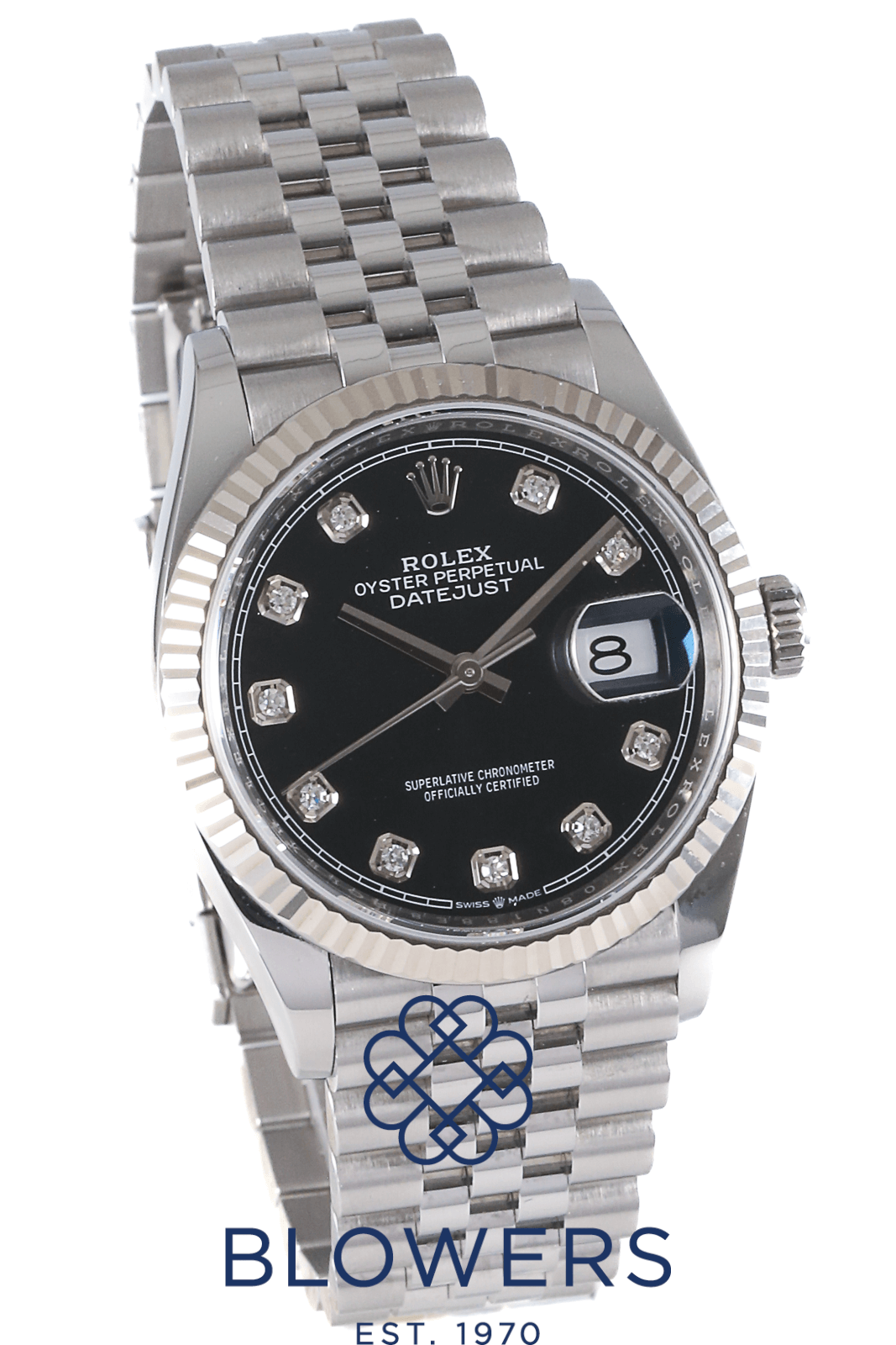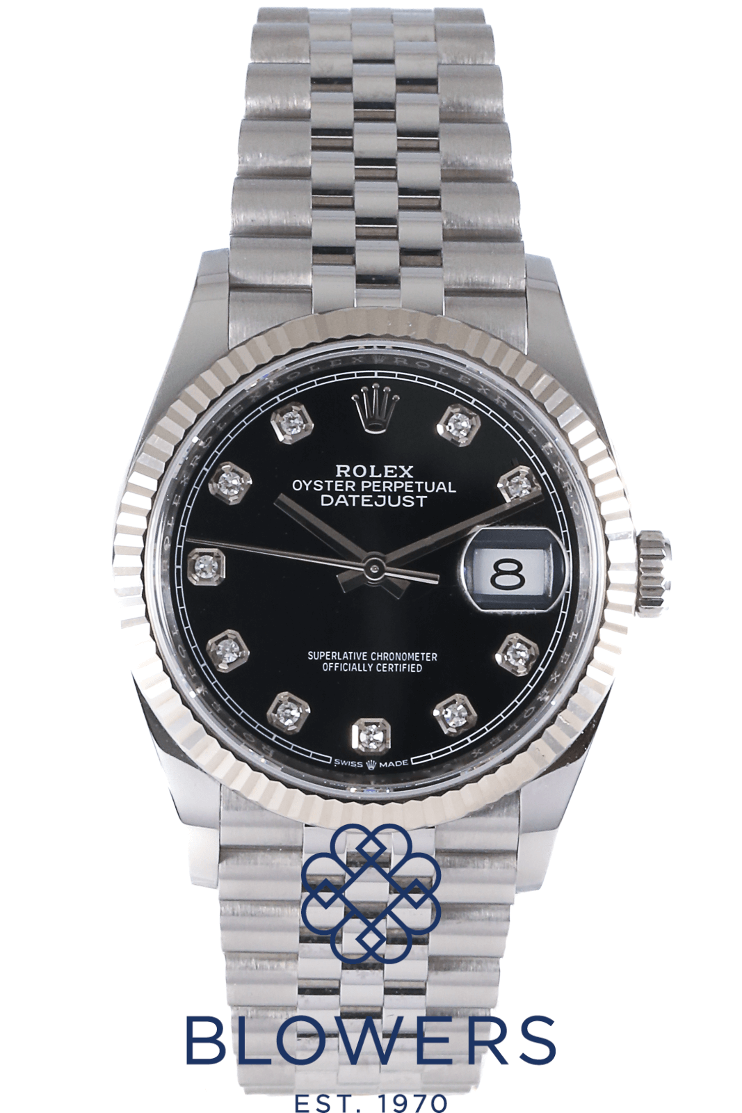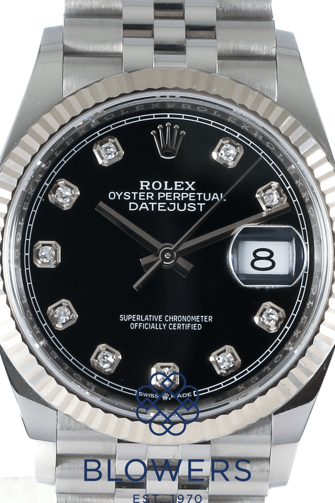 Rolex Oyster Perpetual Datejust 126234. 36mm steel case, which is water resistant to 100 meters. Automatic, Rolex calibre 3235 movement. A power reserve of 70 hours. Featuring the a black diamond index dial. Surrounded by a white Rolesor fluted bezel, which is a combination of steel and white gold. Other notable features include a date window at the 3 o’clock position, a central seconds hand, and a white outer minutes track. Steel jubilee bracelet, with a folding clasp. Equipped with the 5mm Easylink comfort extension system. Complete with its box and papers, dated December 2020.