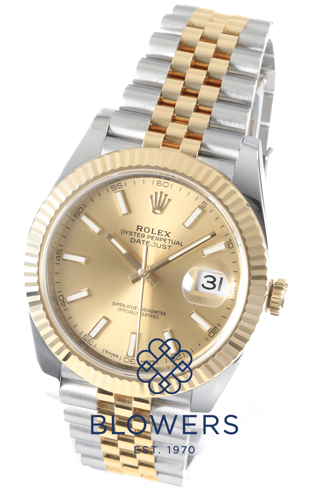 Rolex Oyster Perpetual Datejust 126333. 41mm diameter case encompassing an automatic chronometer movement. The Datejust is water resistant to 100 metres. Champagne dial with baton hour markers. Fluted yellow gold bezel. Stainless steel and Yellow Gold jubilee bracelet with folding oysterclasp with easylink 5mm comfort extension link. Box and papers dated December 2017.