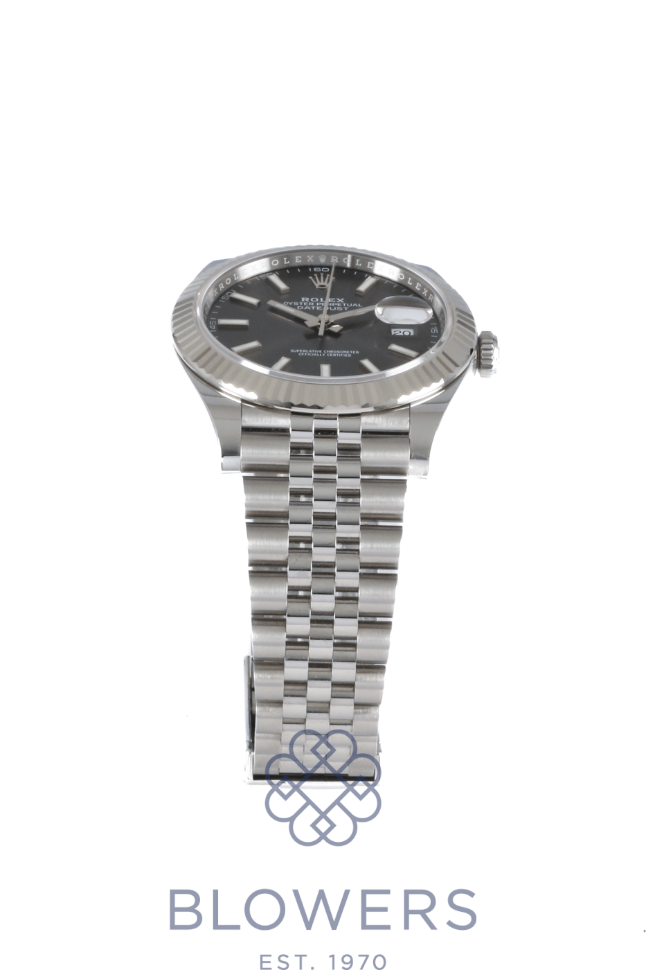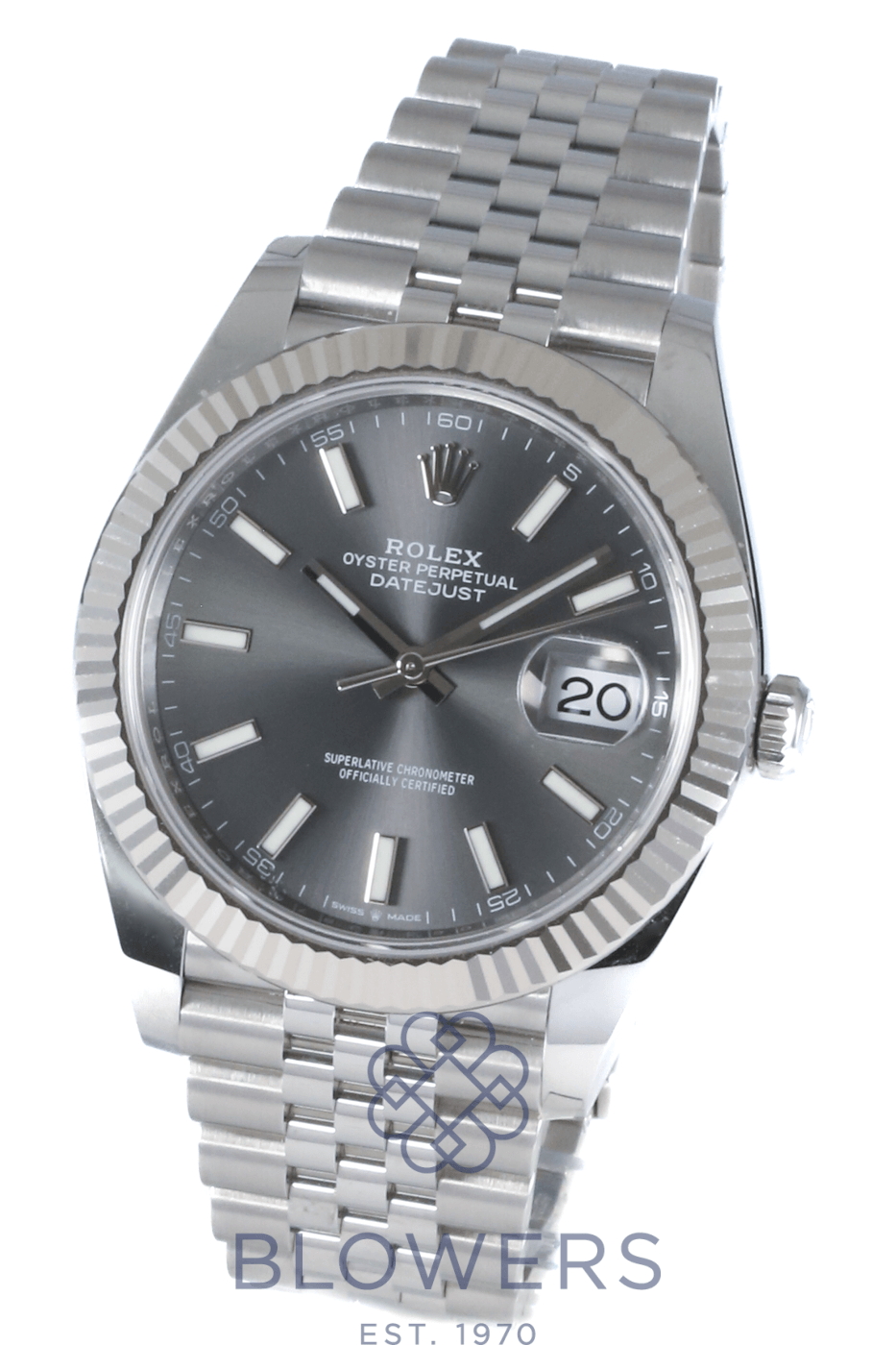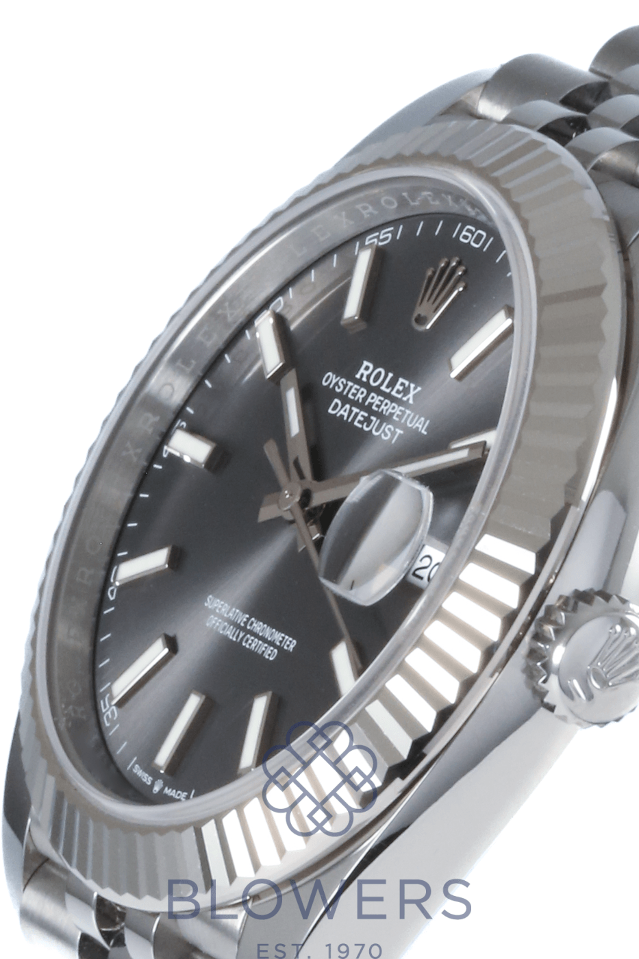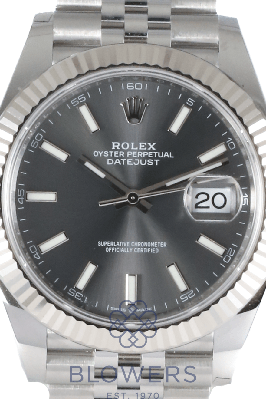 Rolex Oyster Perpetual Datejust 126334. 41mm Oystersteel and white gold case. Water resistant up to 100 metres. Slate dial, fluted bezel. Index, luminescent hour markers. Sapphire crystal with the signature Cyclops lens over the date at the 3 o’clock position. Power Reserve up to 70 hours. On a Oystersteel Jubilee bracelet. Box and Papers dated September 2022.