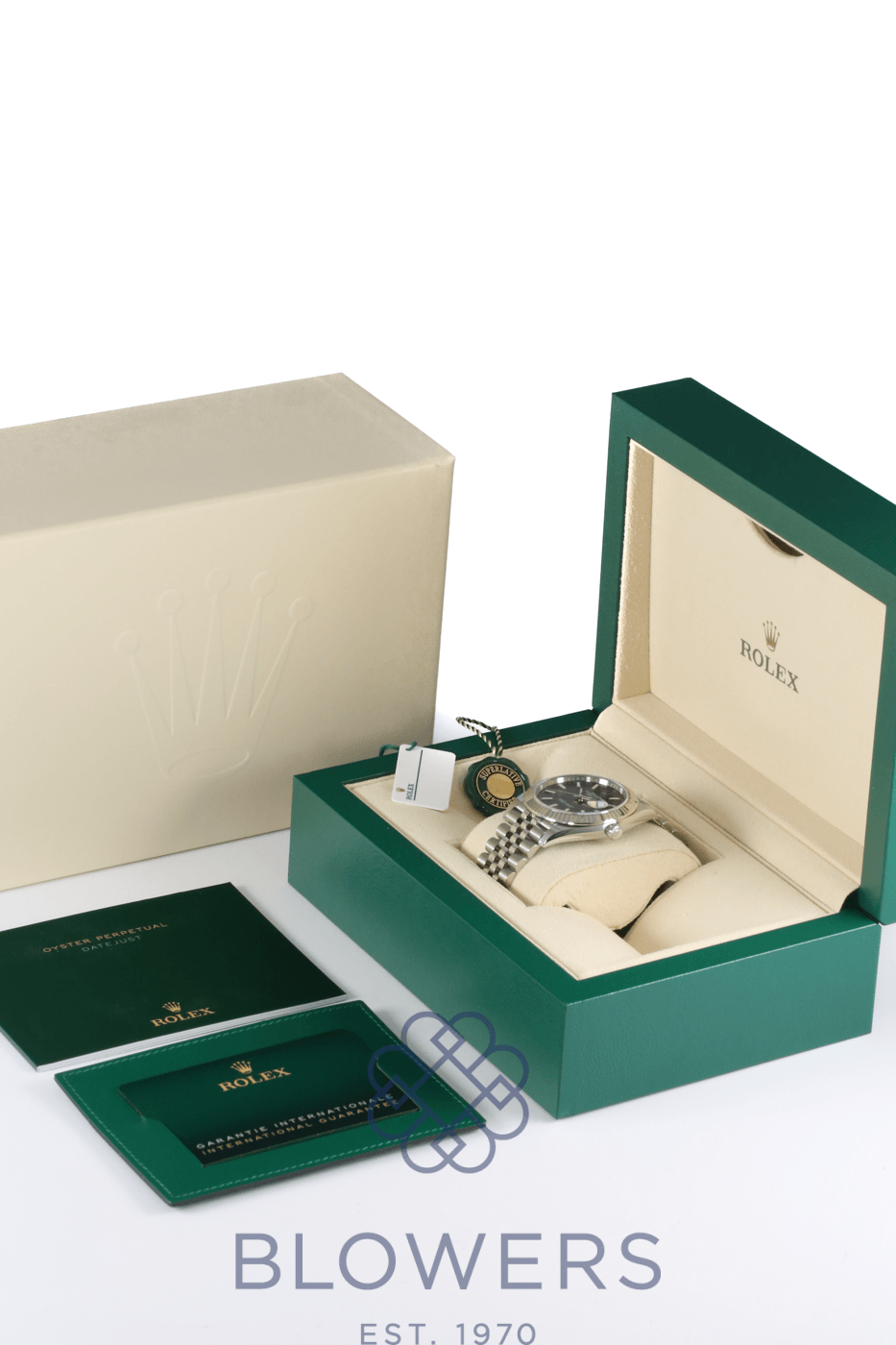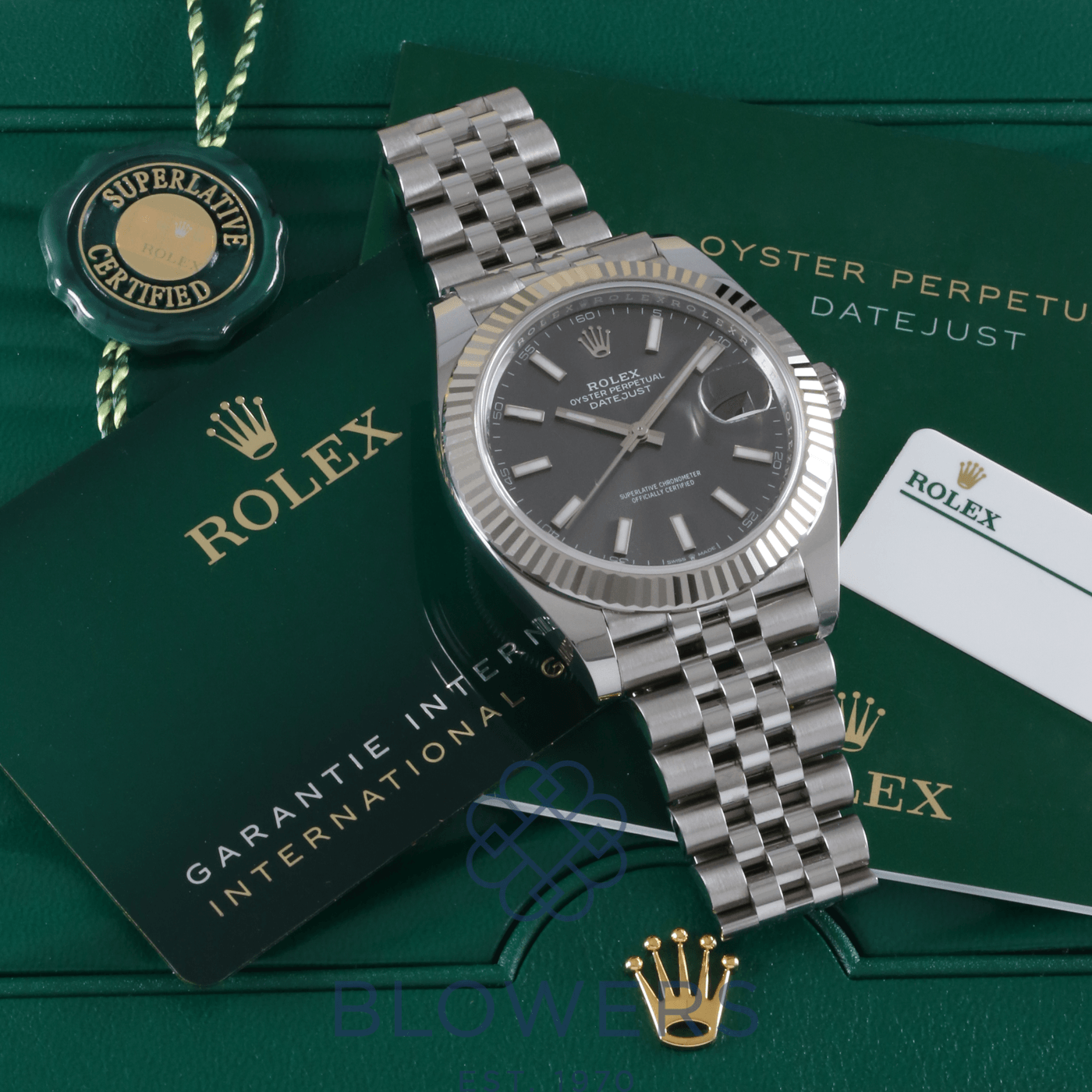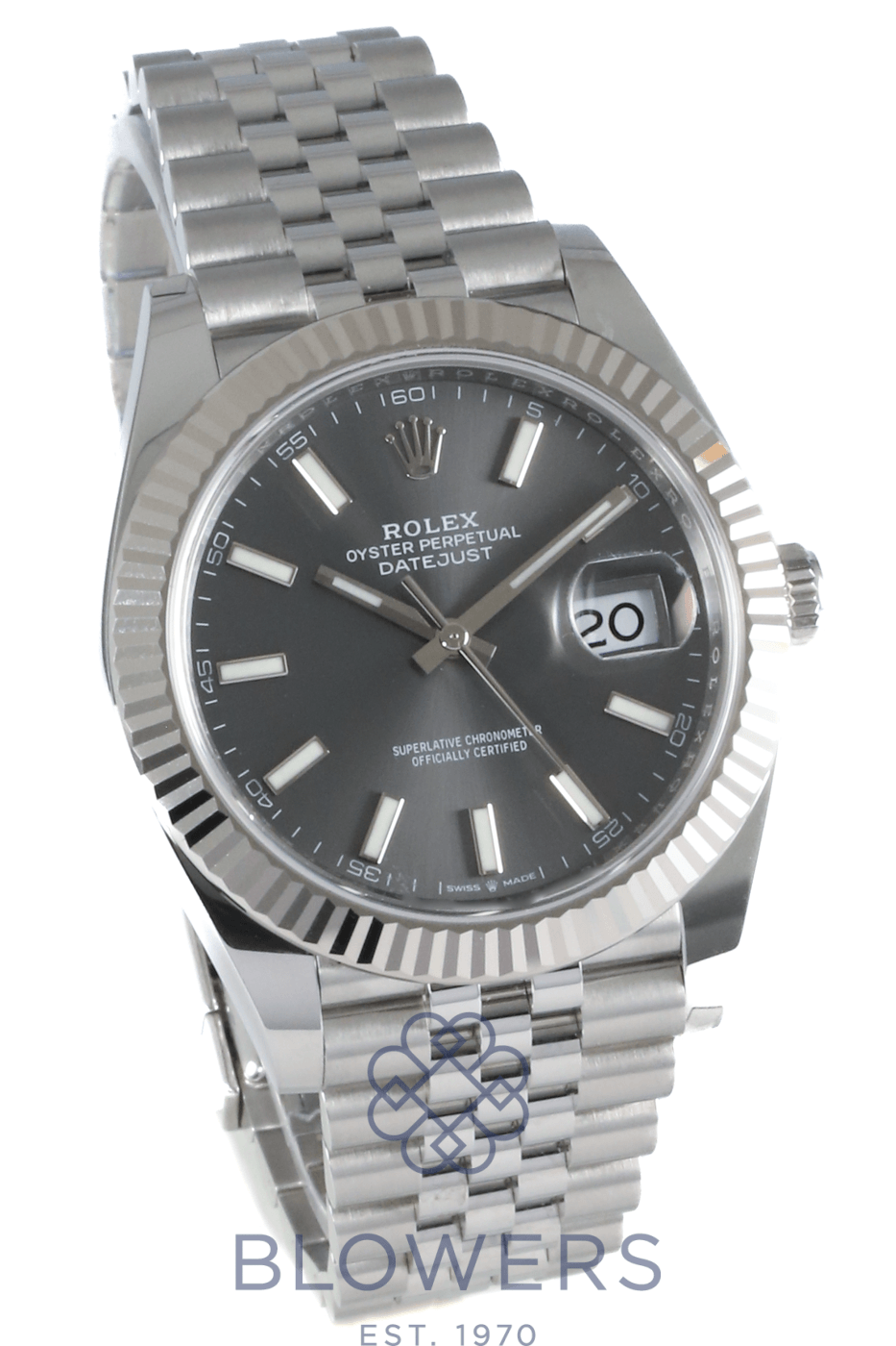 Rolex Oyster Perpetual Datejust 126334. 41mm Oystersteel and white gold case. Water resistant up to 100 metres. Slate dial, fluted bezel. Index, luminescent hour markers. Sapphire crystal with the signature Cyclops lens over the date at the 3 o’clock position. Power Reserve up to 70 hours. On a Oystersteel Jubilee bracelet. Box and Papers dated September 2022.