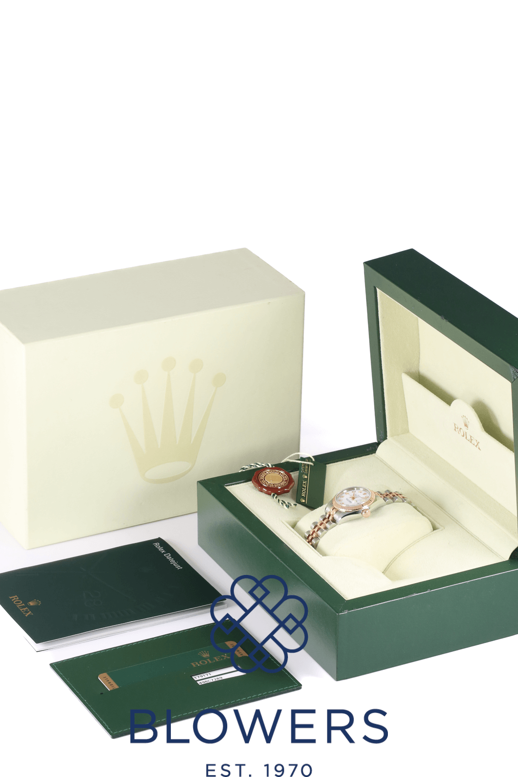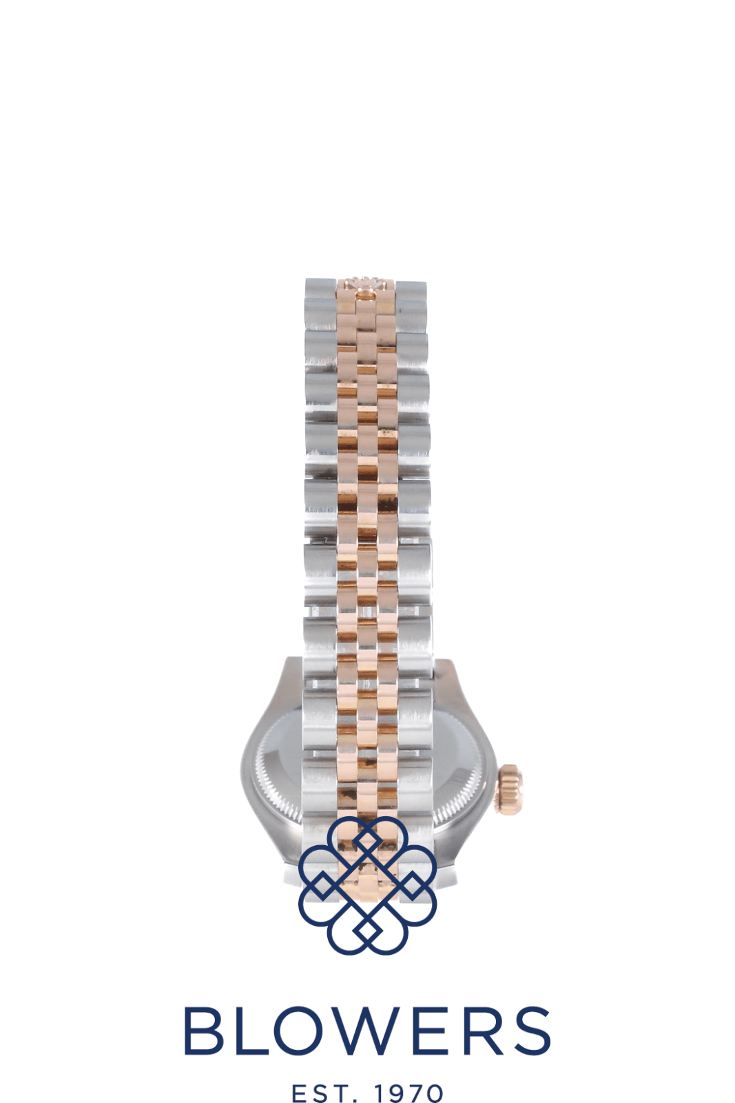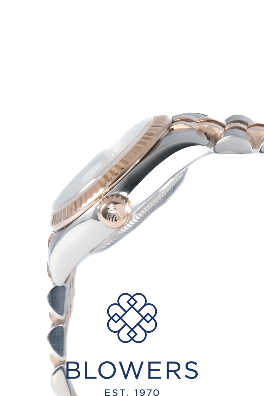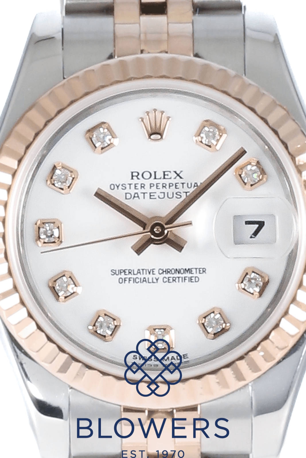 Rolex Datejust 179171. Stainless steel 26mm diameter Oyster case with screw-down crown and fluted 18ct Everose gold bezel. Water resistant up to 100 metres. Self-winding chronometer-certified calibre 2235 movement with approximately 48-hour power reserve. Scratch-resistant sapphire crystal glass with Cyclops lens over the date window at 3 o’clock. White dial with luminescent hands and diamond index hour markers. Central hours, minutes and seconds hands. Stainless steel and 18ct Everose gold jubilee strap with folding clasp. Box and papers dated December 2012.