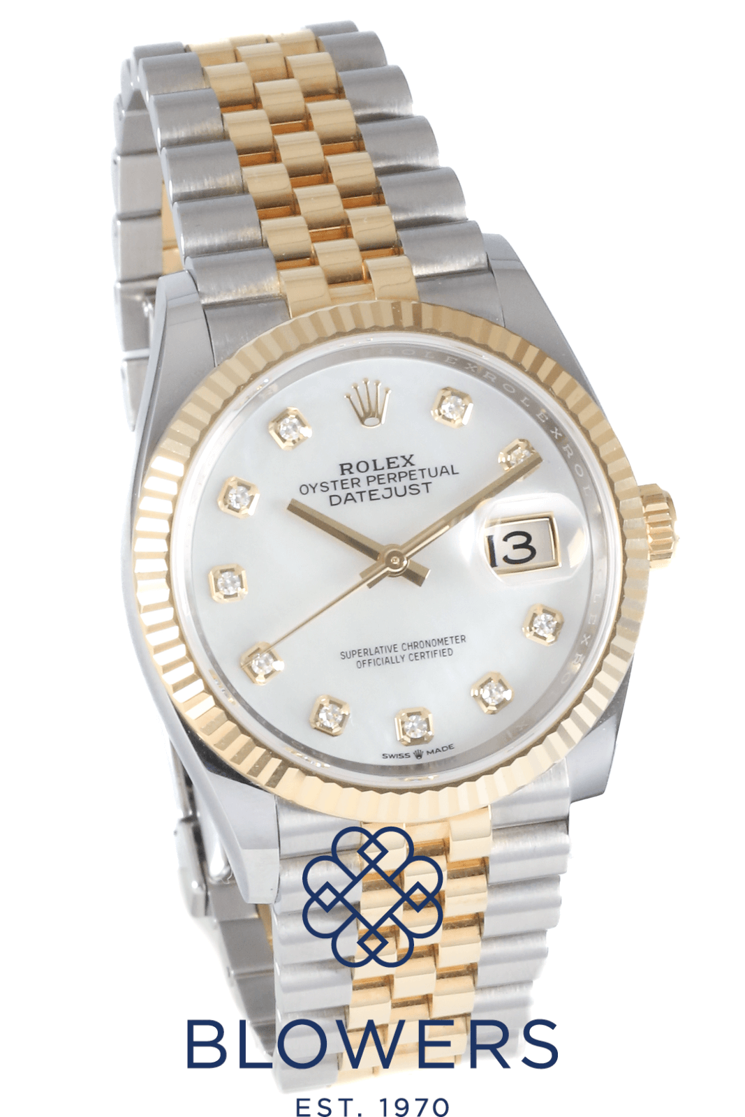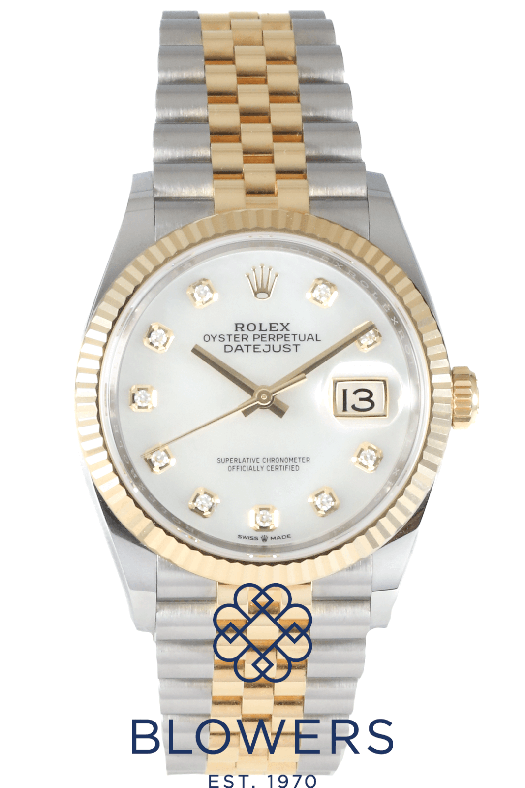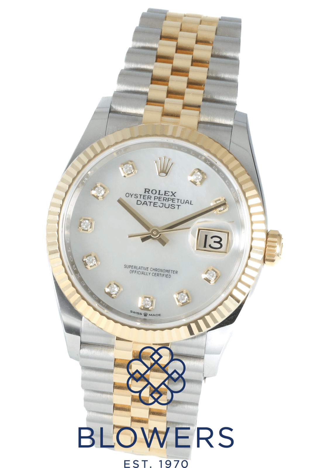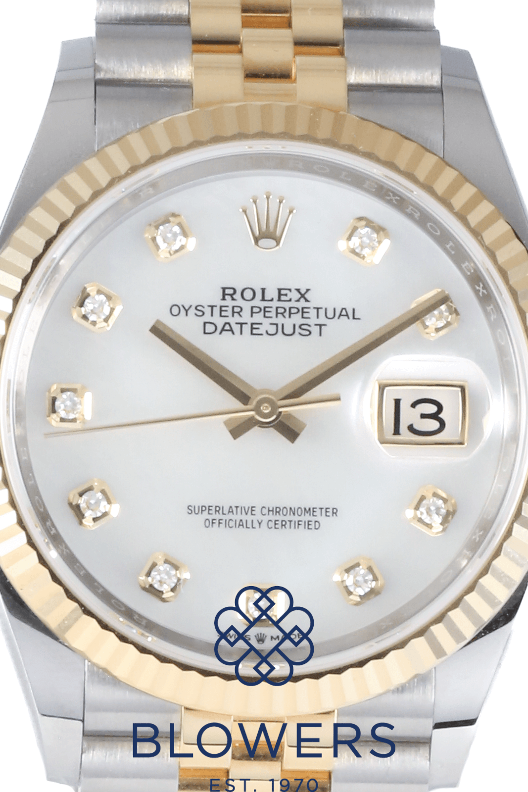 Rolex Oyster Perpetual Datejust 36 126233. Steel 36 mm case, with a screw-down Twinlock double waterproof crown. Water resistant up to 100 metres. Self-winding mechanical movement, calibre 3235, a superlative chronometer officially certified by COSC and Rolex, offering a power reserve of approximately 70 hours. Fluted 18 ct yellow gold bezel. Mother-of-pearl dial set with ten brilliant-cut diamond hour markers in 18 ct yellow gold settings. Central hours, minutes, and seconds hands. Scratch-resistant sapphire crystal with Cyclops lens over the date at 3 o’clock. Fitted with a Jubilee bracelet in Oystersteel and 18ct yellow gold with folding Oysterclasp and Easylink 5 mm comfort extension link. Box and papers dated July 2021.
