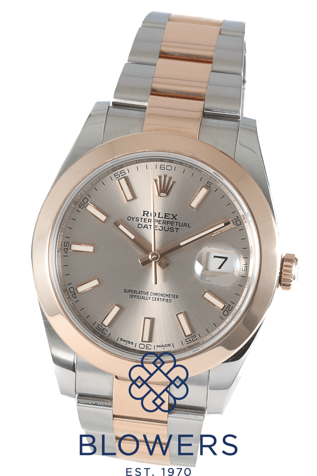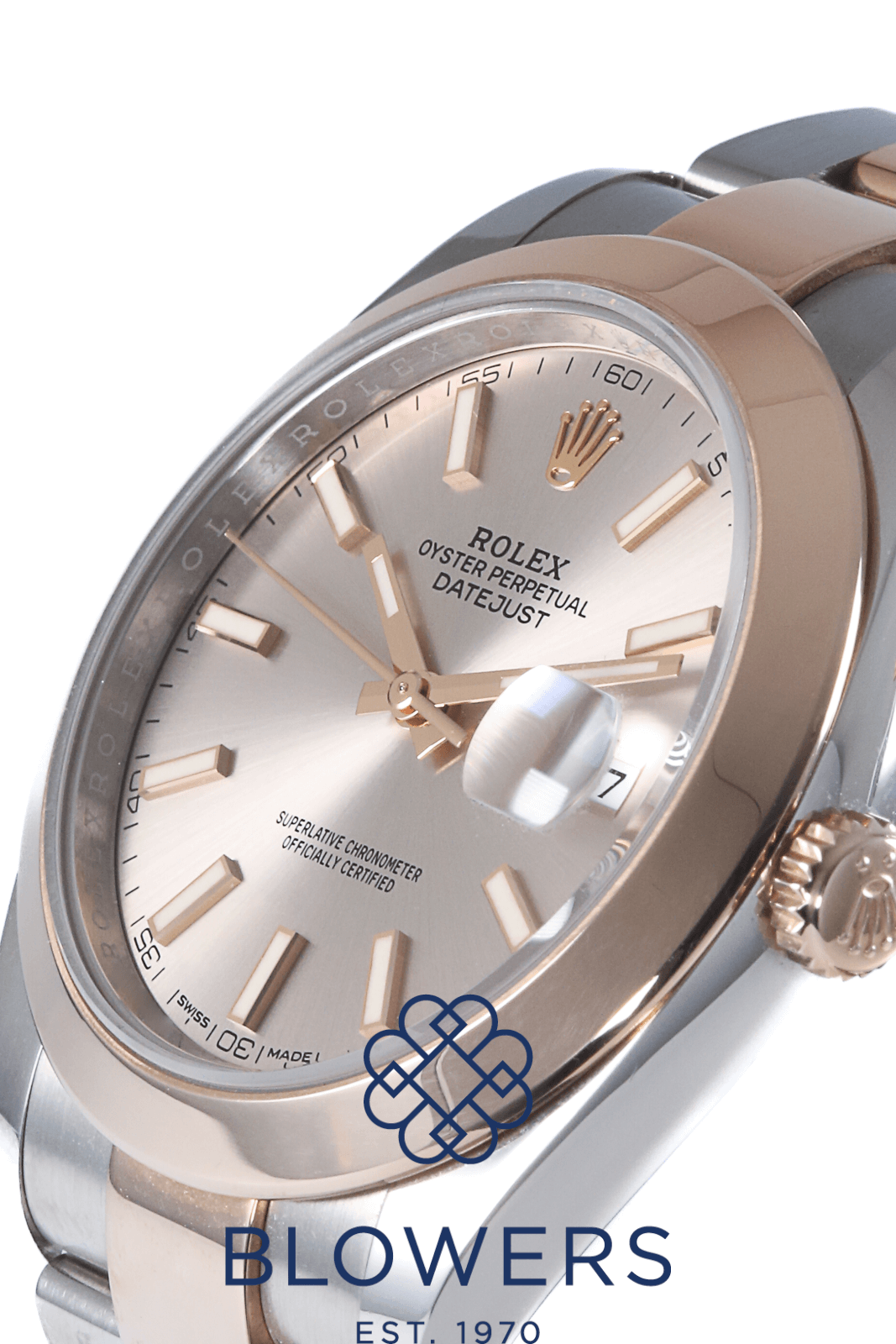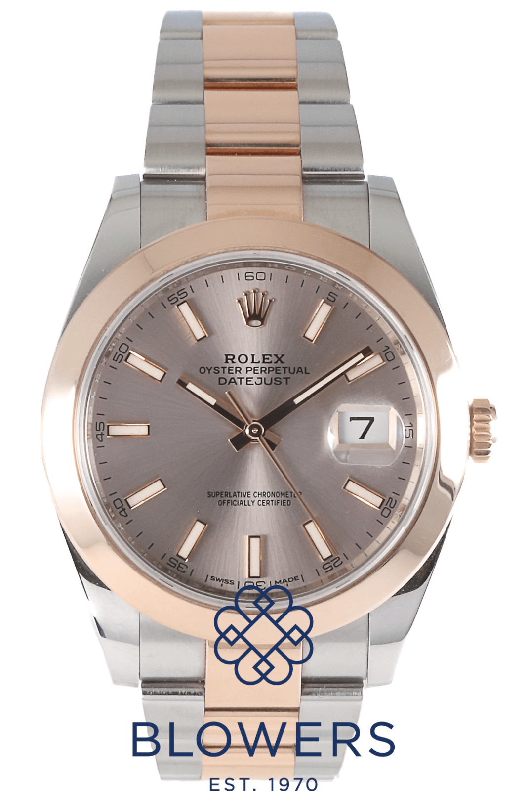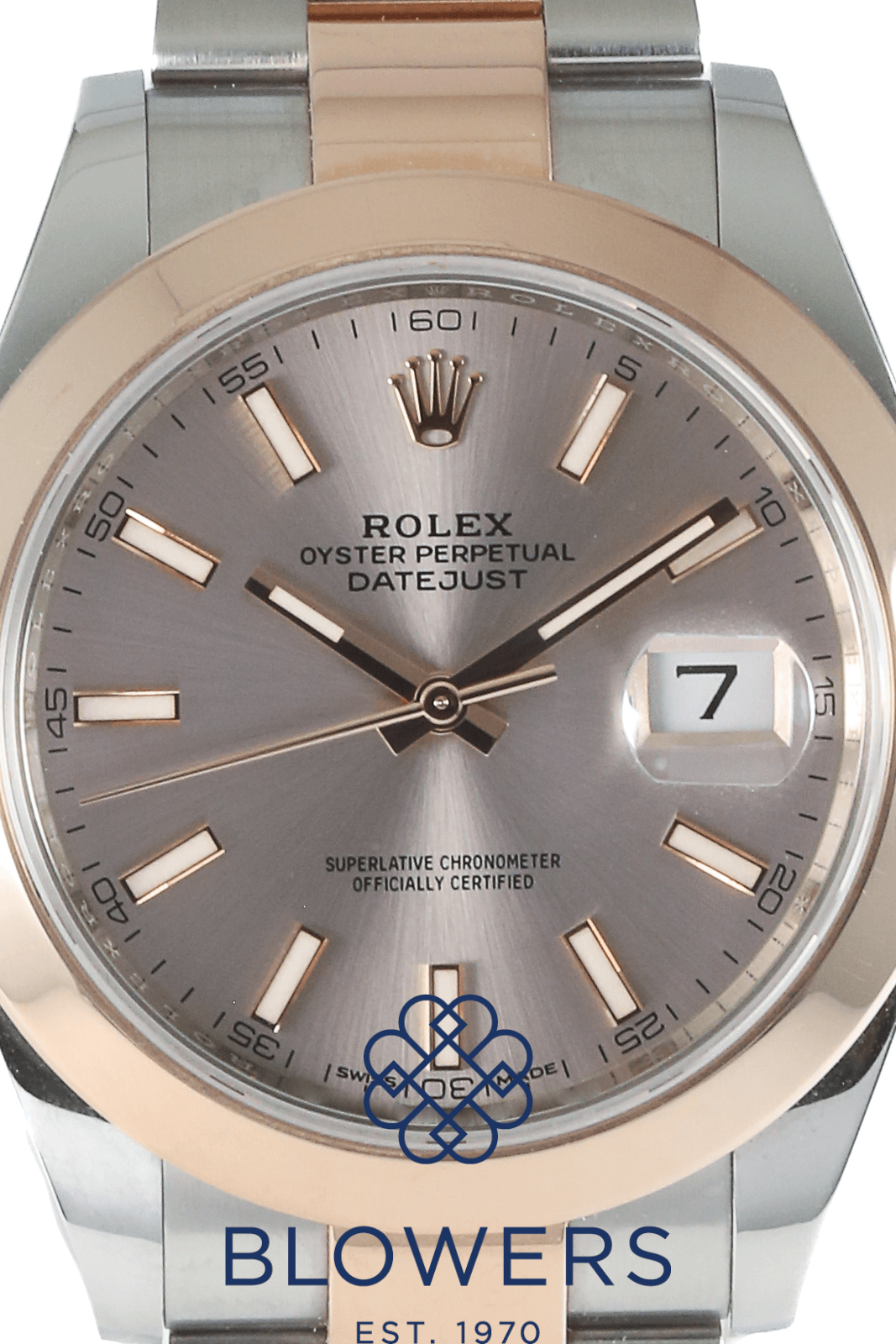 Rolex Oyster Perpetual Datejust 126301. Steel and rose gold case, diameter is 41mm. Water resistance of 100 meters. Automatic movement calibre 3235. Power reserve of 70 hours. Rose Baton Sunray Finish Dial, with Chromalight blue luminescent baton hour markers. Cyclops lens over the date window at the 3 o’clock position. Rose Gold domed Bezel. Steel Oyster bracelet with folding clasp. Box and papers dated June 2021.