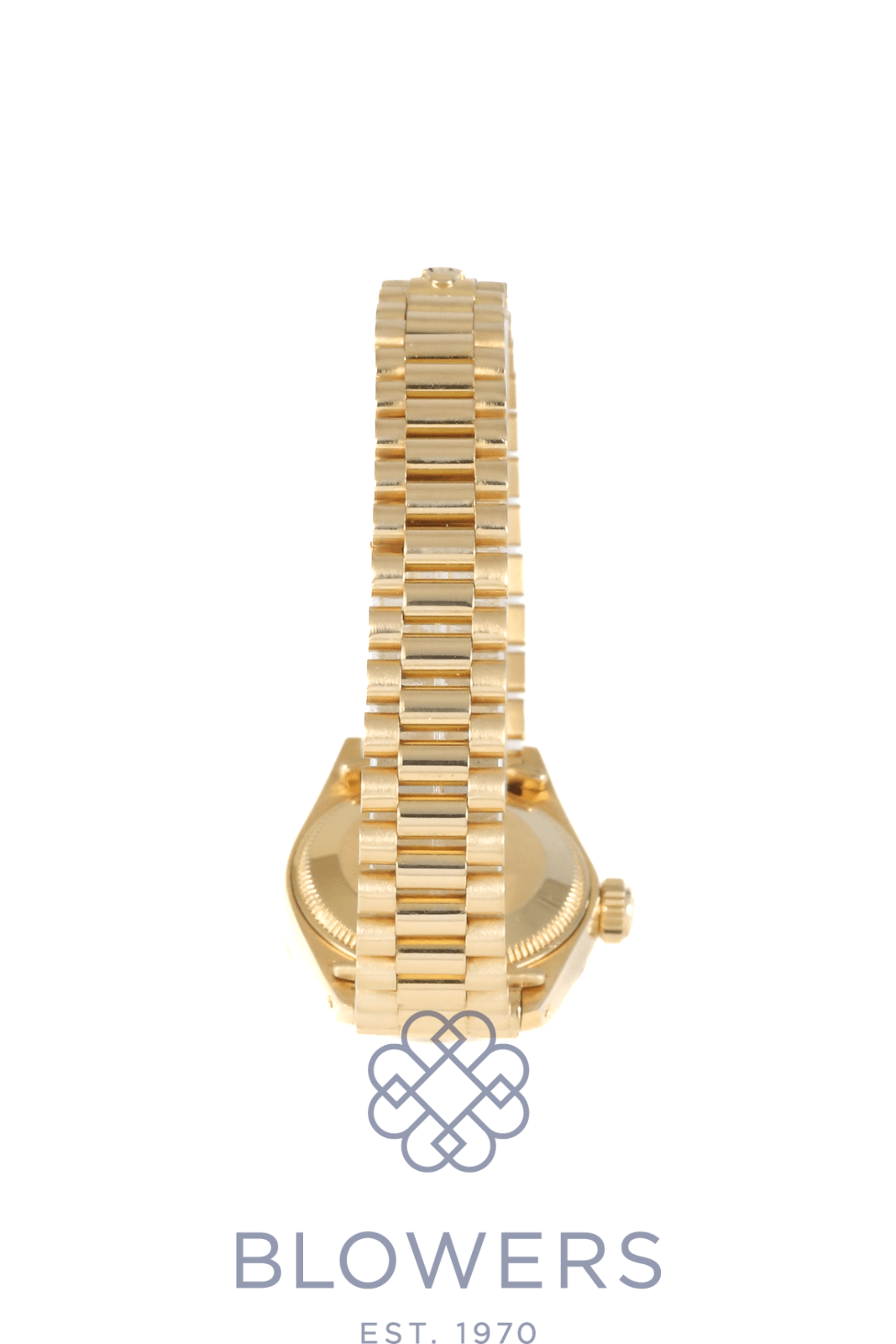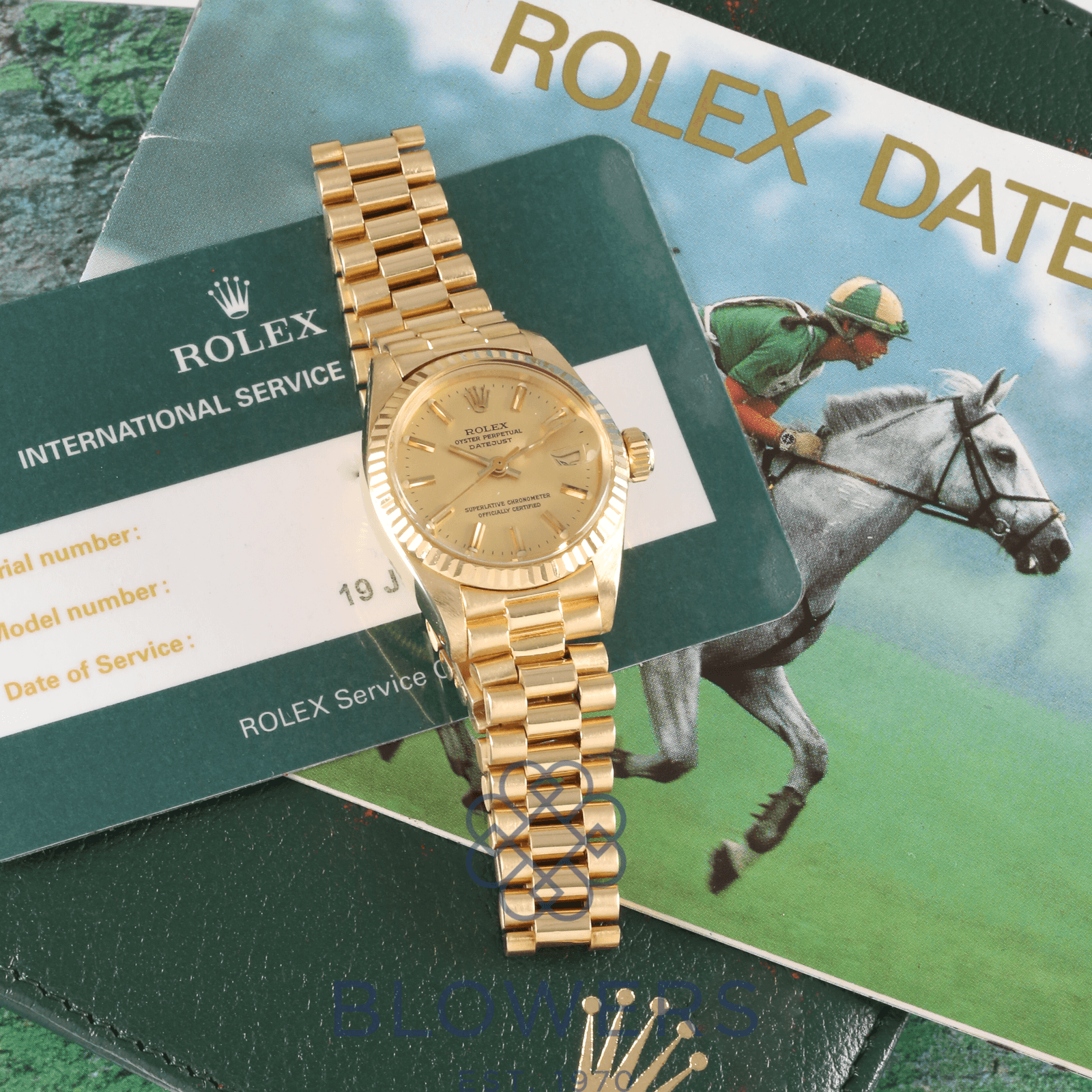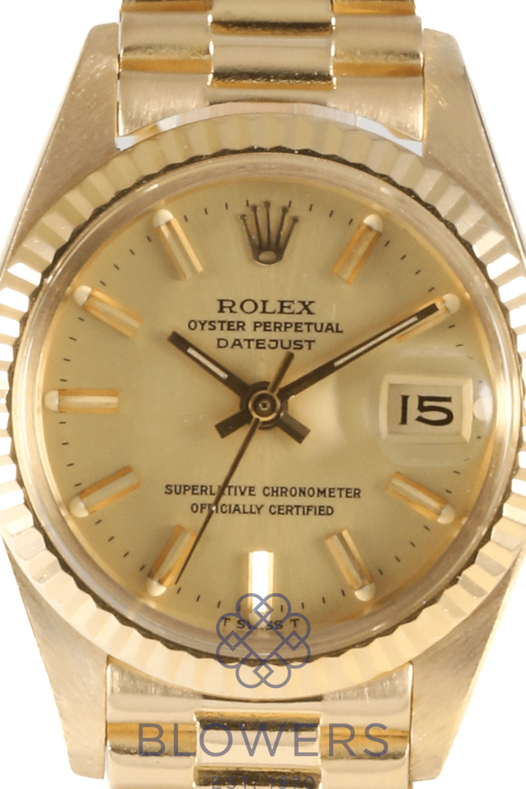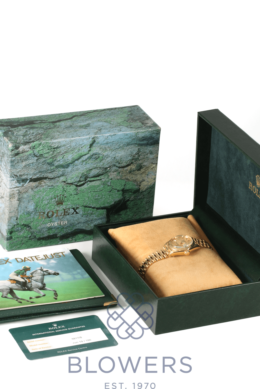 Rolex Oyster Perpetual Datejust 69178. Ladies 18ct Yellow Gold Automatic Movement. Champagne dial, fluted 18ct Yellow Gold Bezel. Date function at the 3 o’clock position.18ct Gold President Bracelet with concealed folding clasp. Box and service papers dated June 2019.
